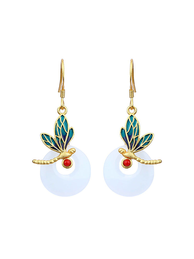 Women Vintage Dragonfly Enamel Round Jade Earrings