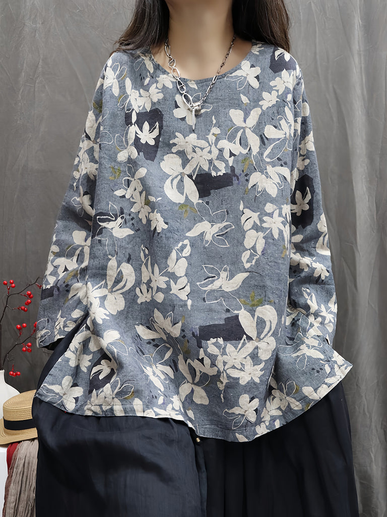 女款秋季復古花朵 100% 亞麻圓領襯衫