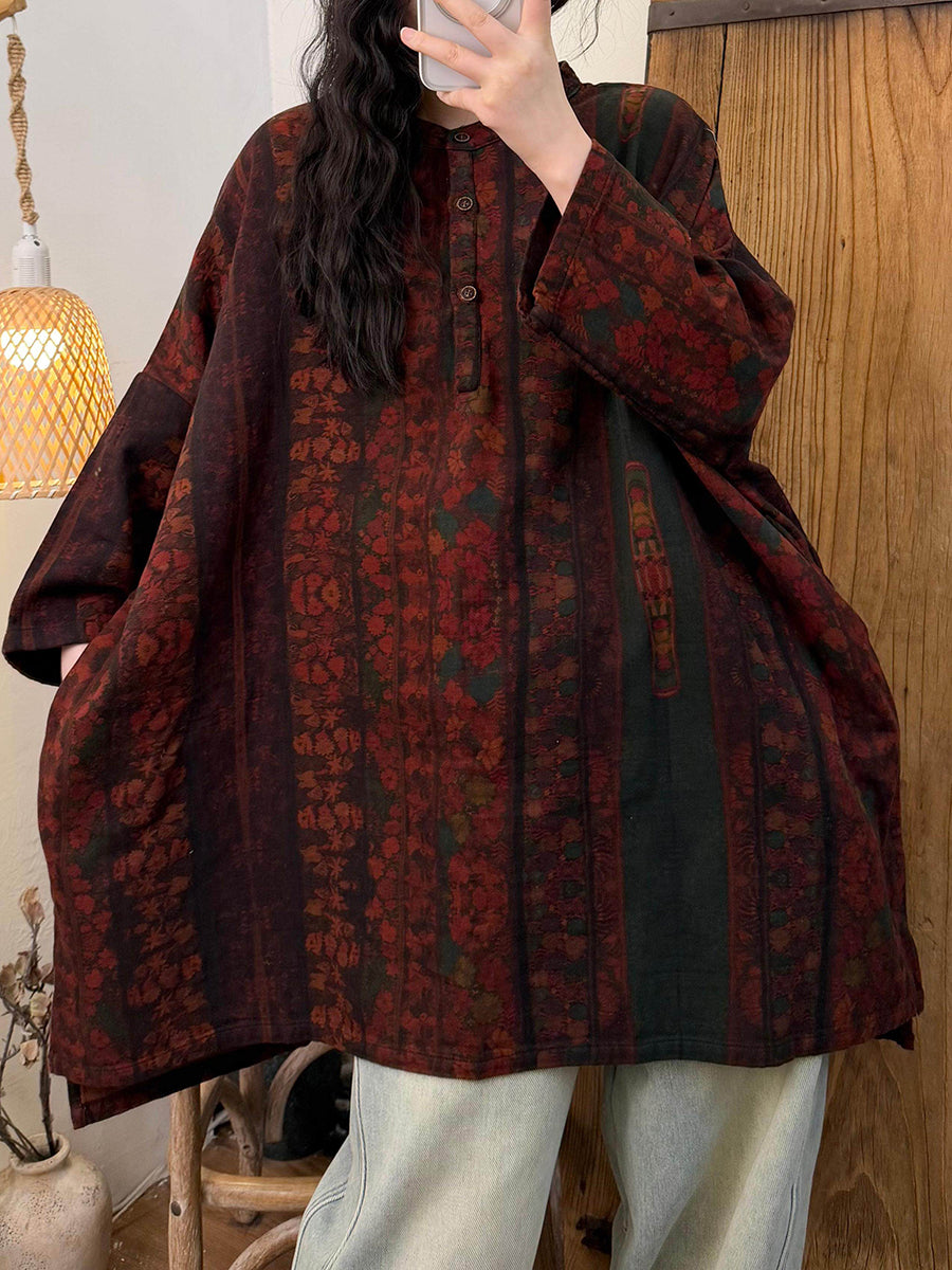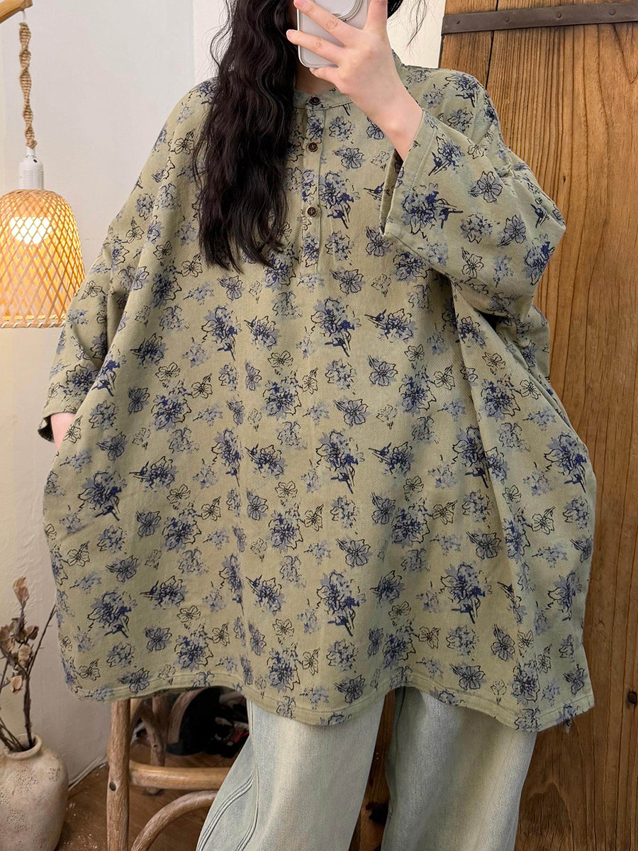 Women Spring Artsy Floral Cotton Stand Collar Blouse