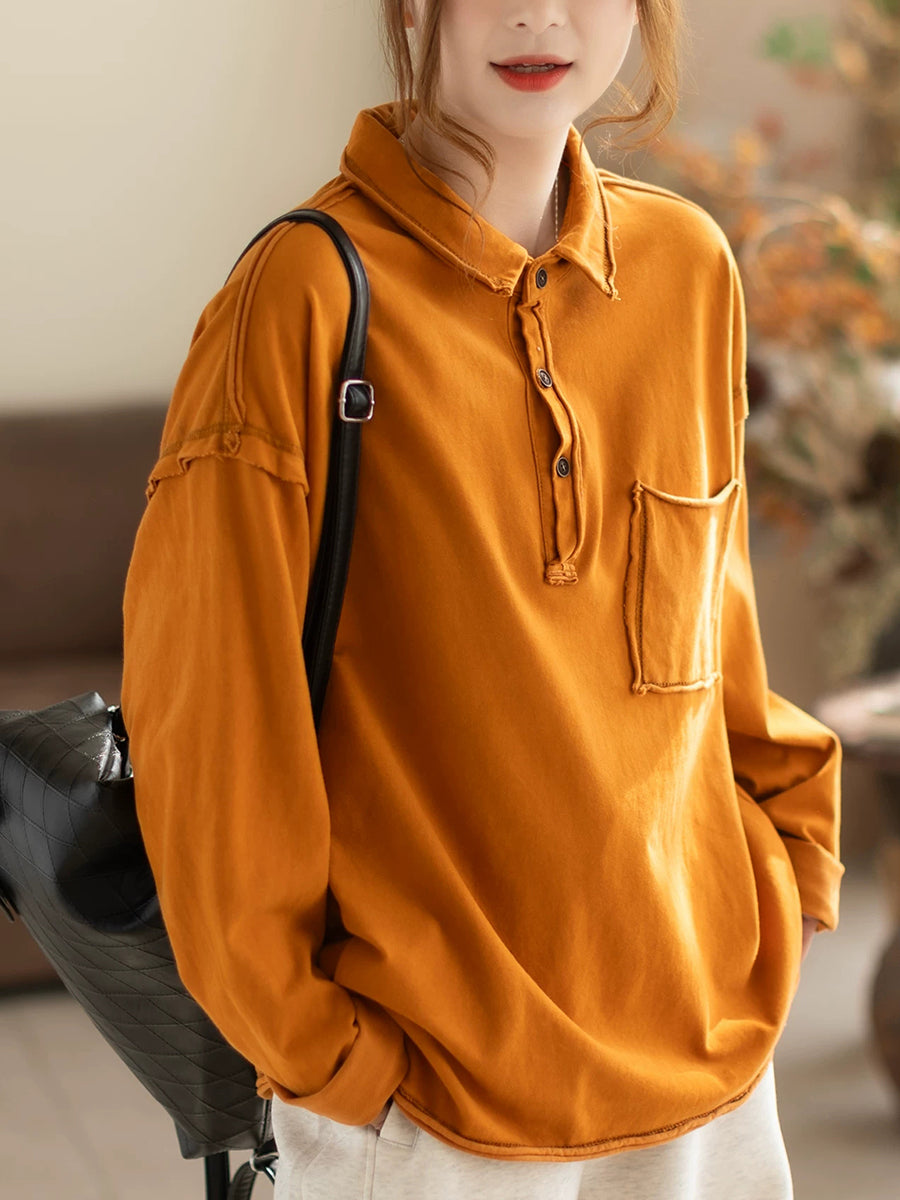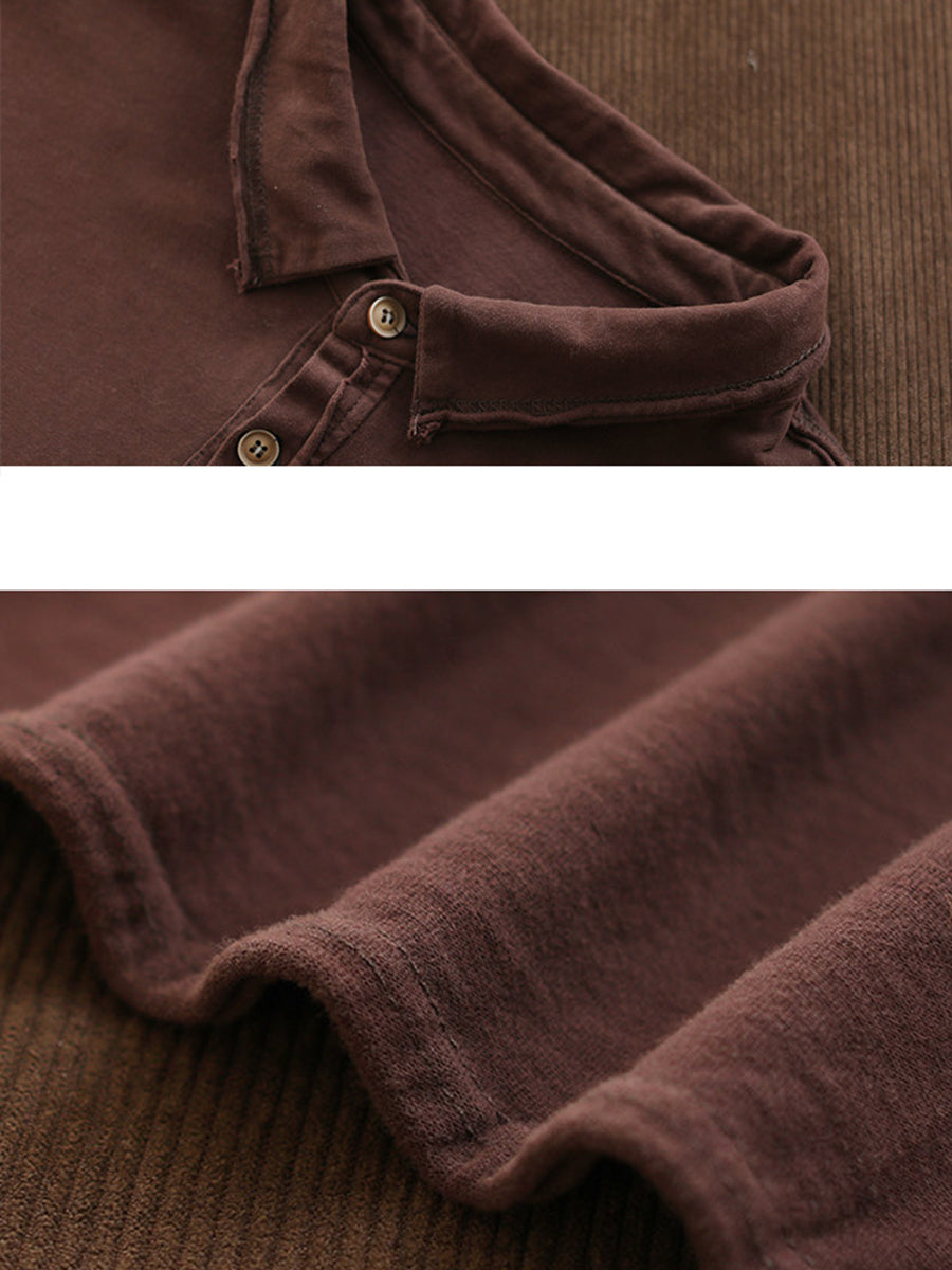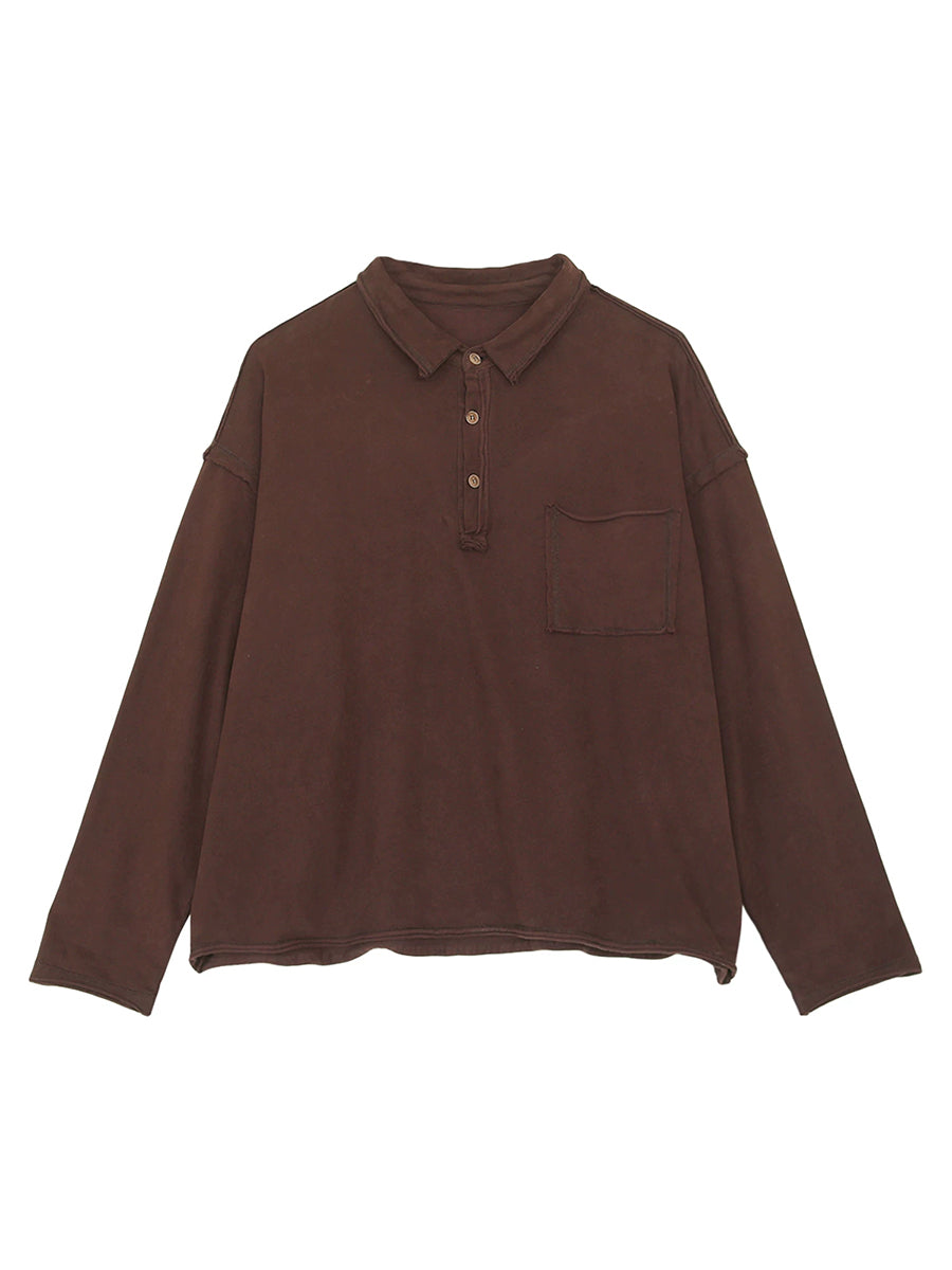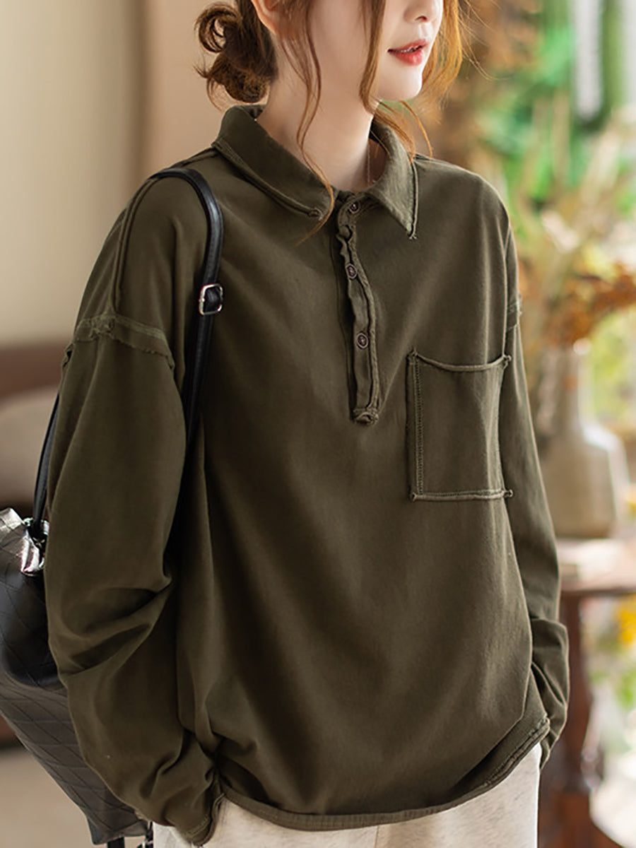 Women Spring Retro Pure Color Turn-down Collar Blouse