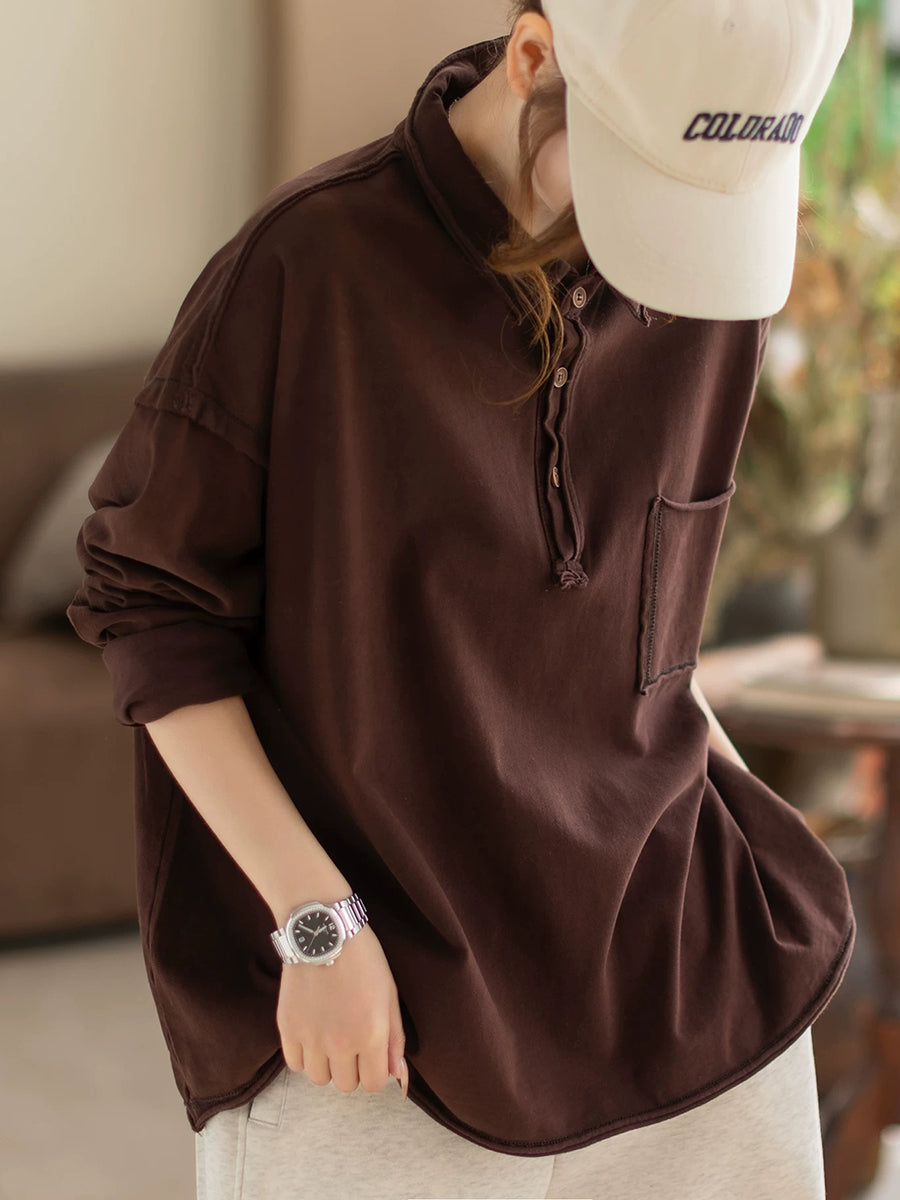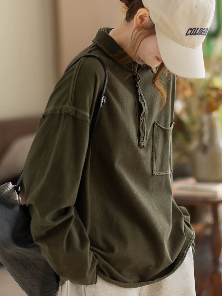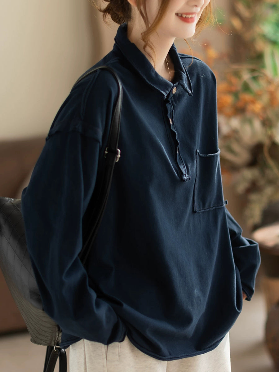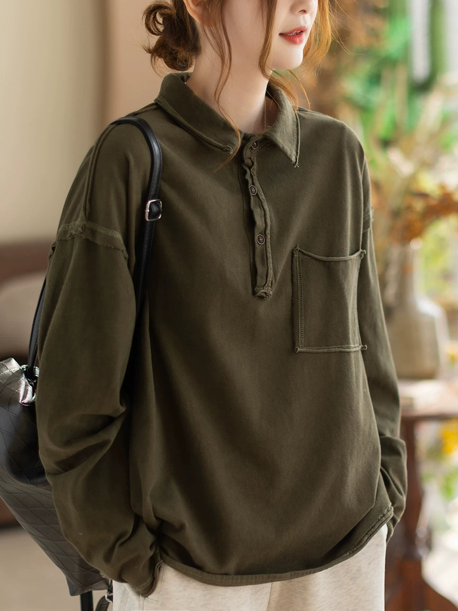 Women Spring Retro Pure Color Turn-down Collar Blouse