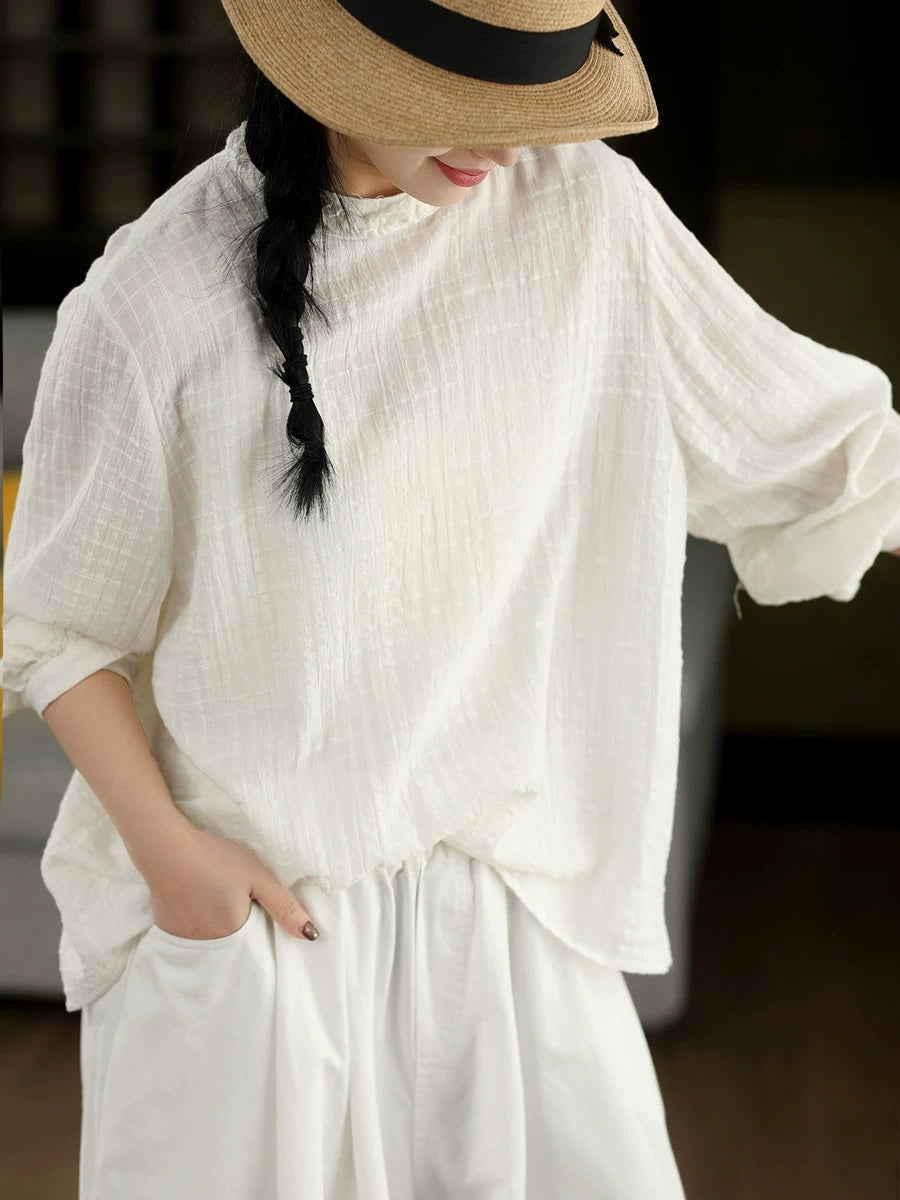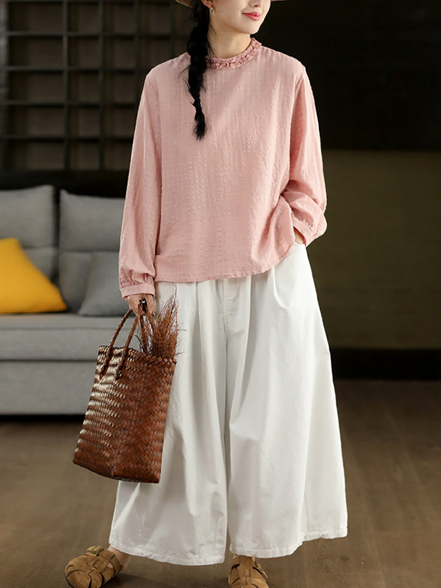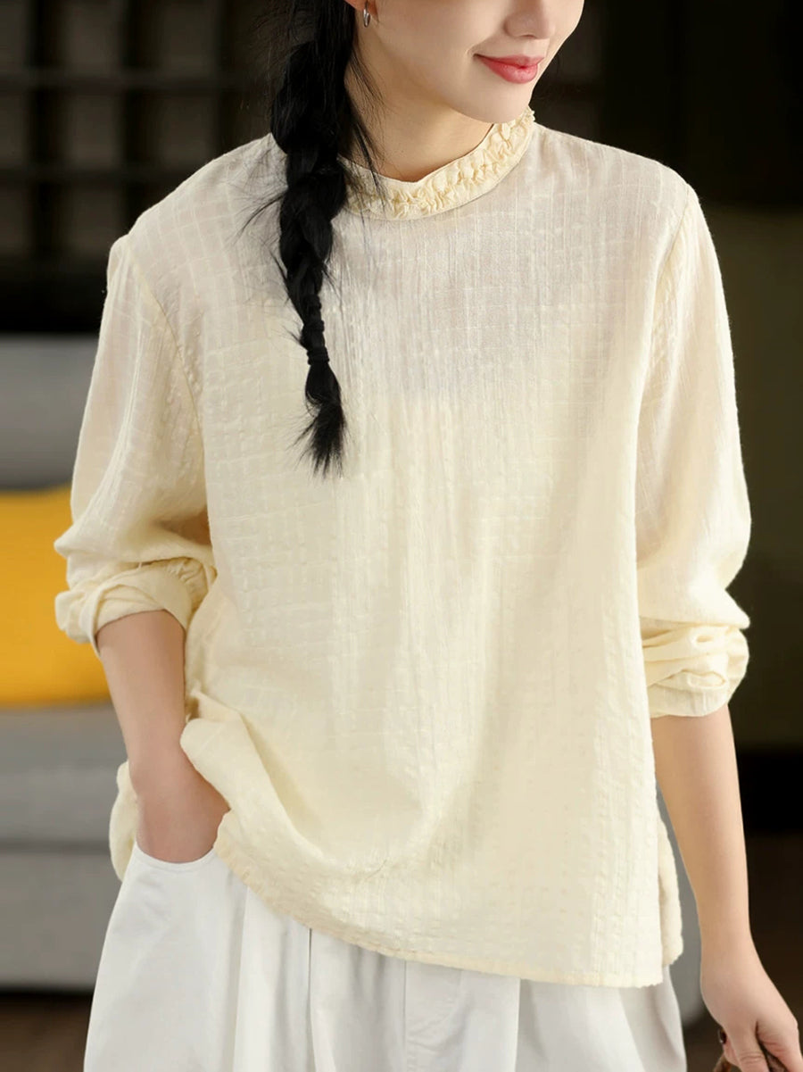 Women Spring Artsy 100%Cotton Stand Collar Blouse