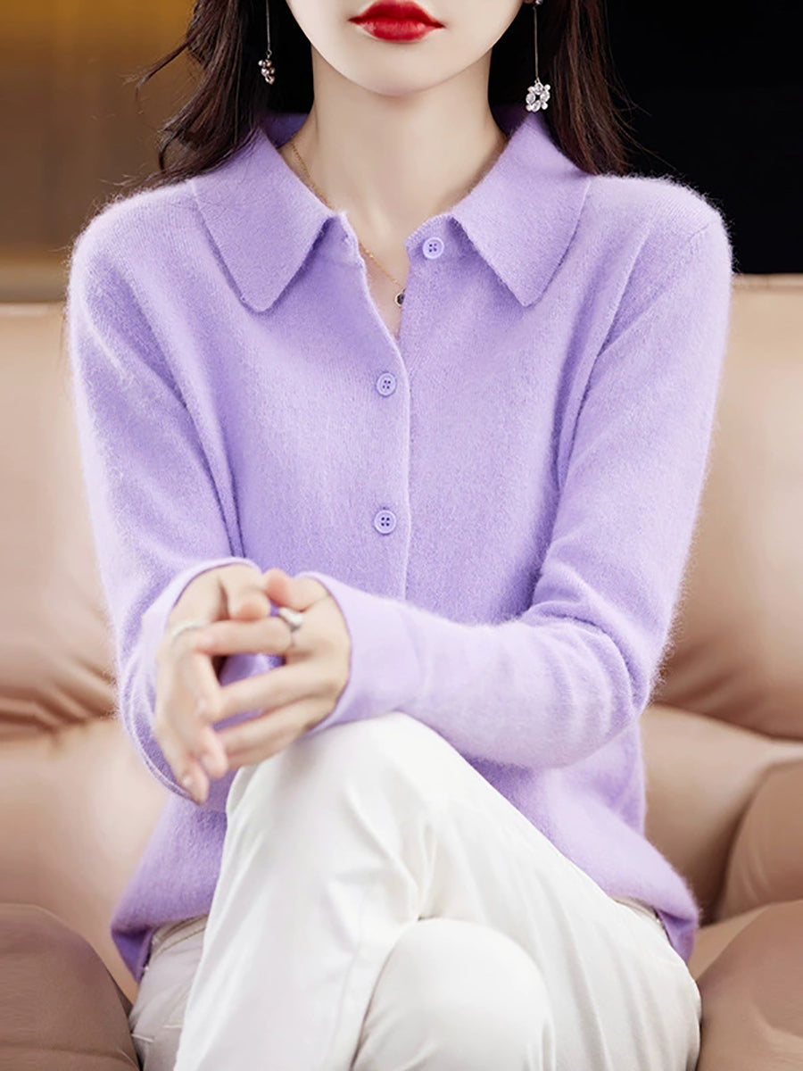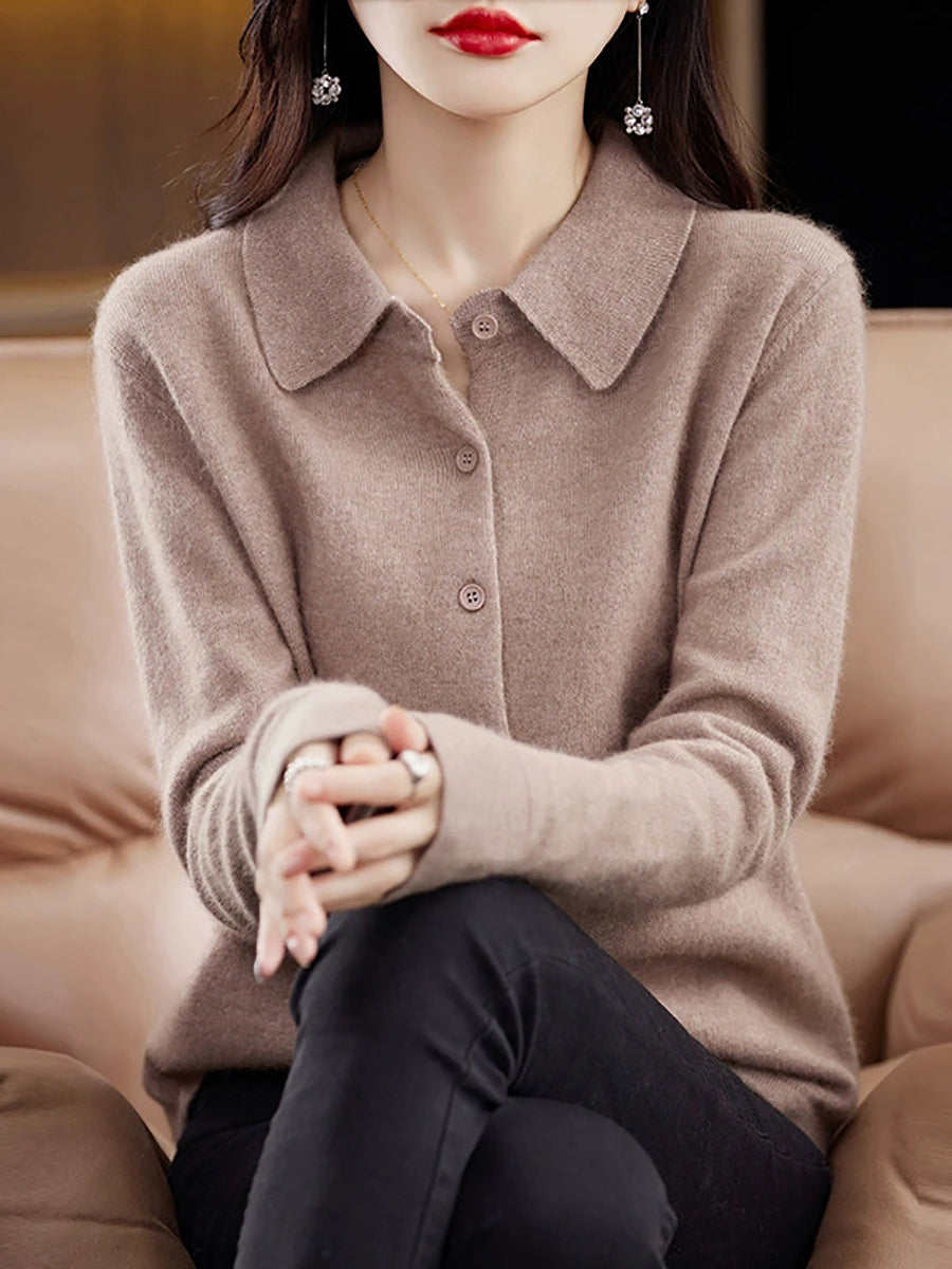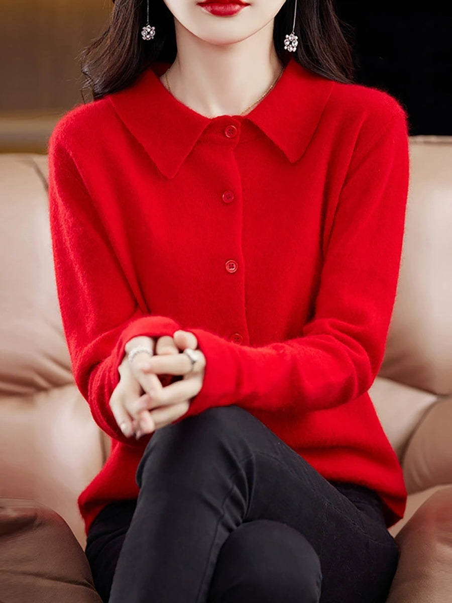 Women Casual Pure Color Turn-down Collar Cardigan Sweater