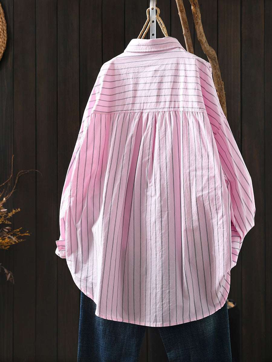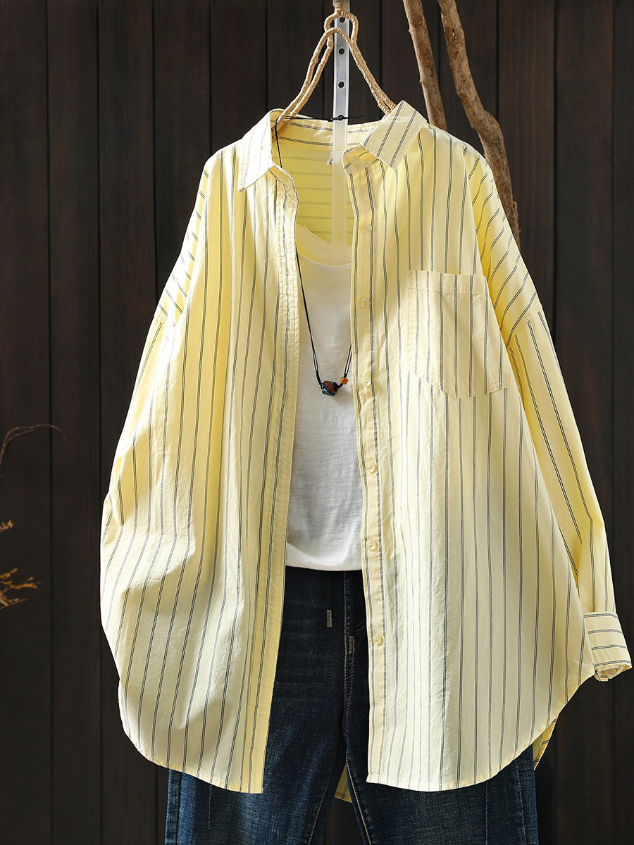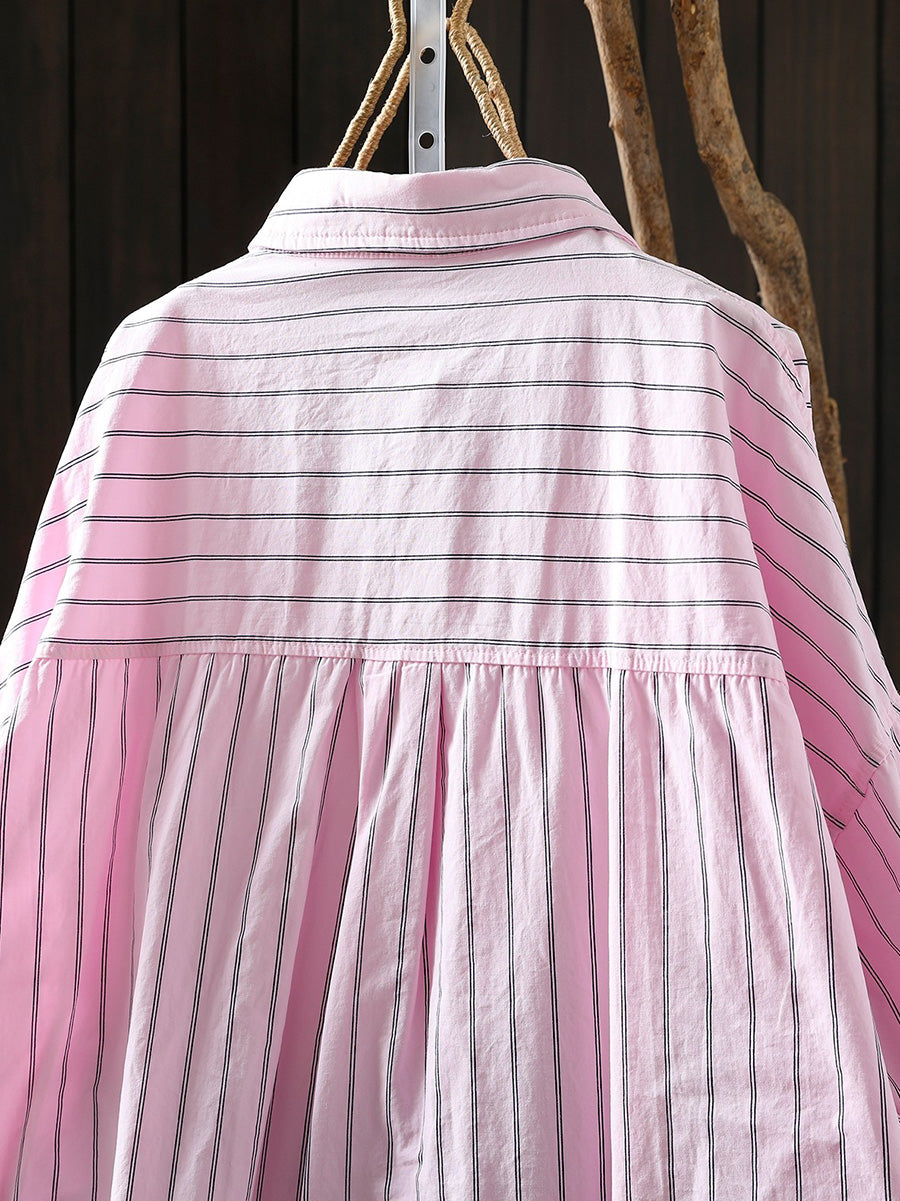 Women Artsy Spring Stripe 100%Cotton Turn-down Collar Shirt
