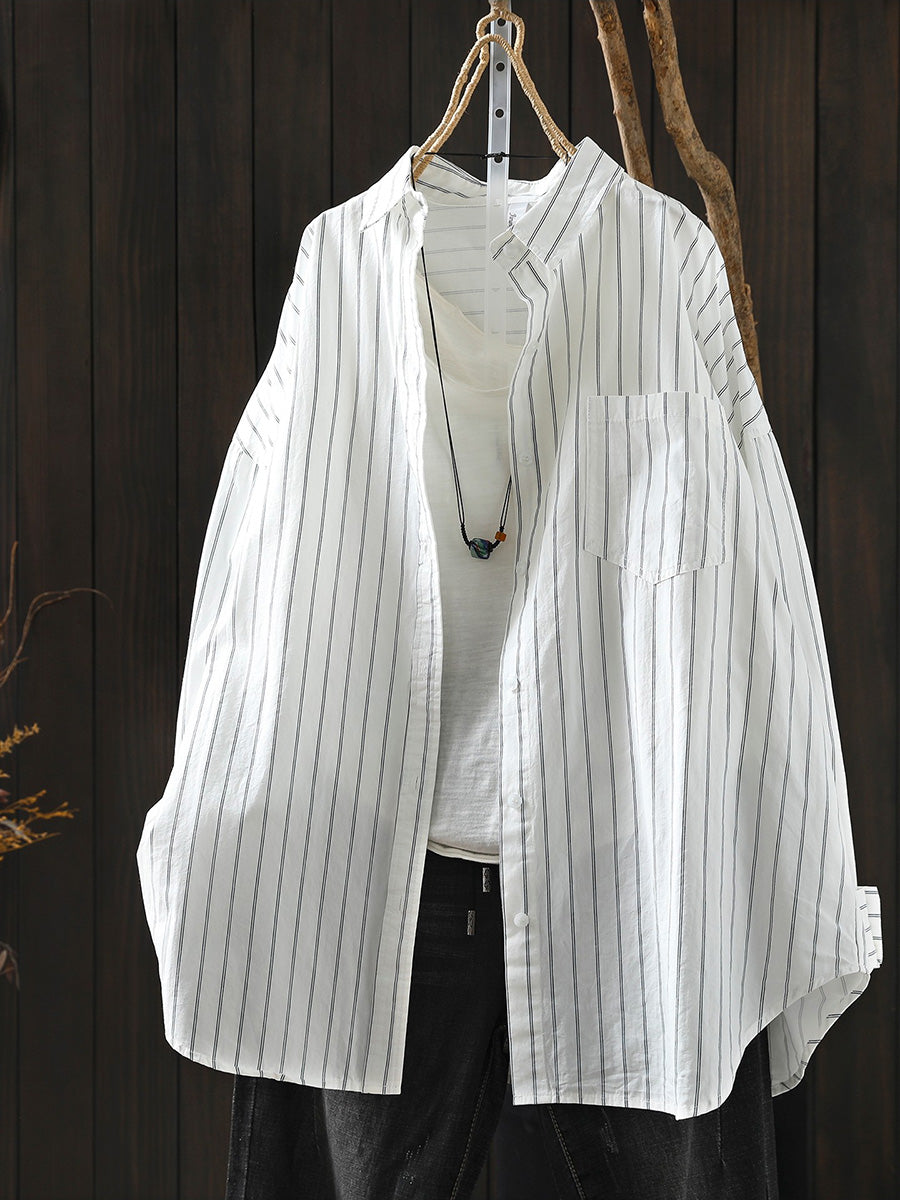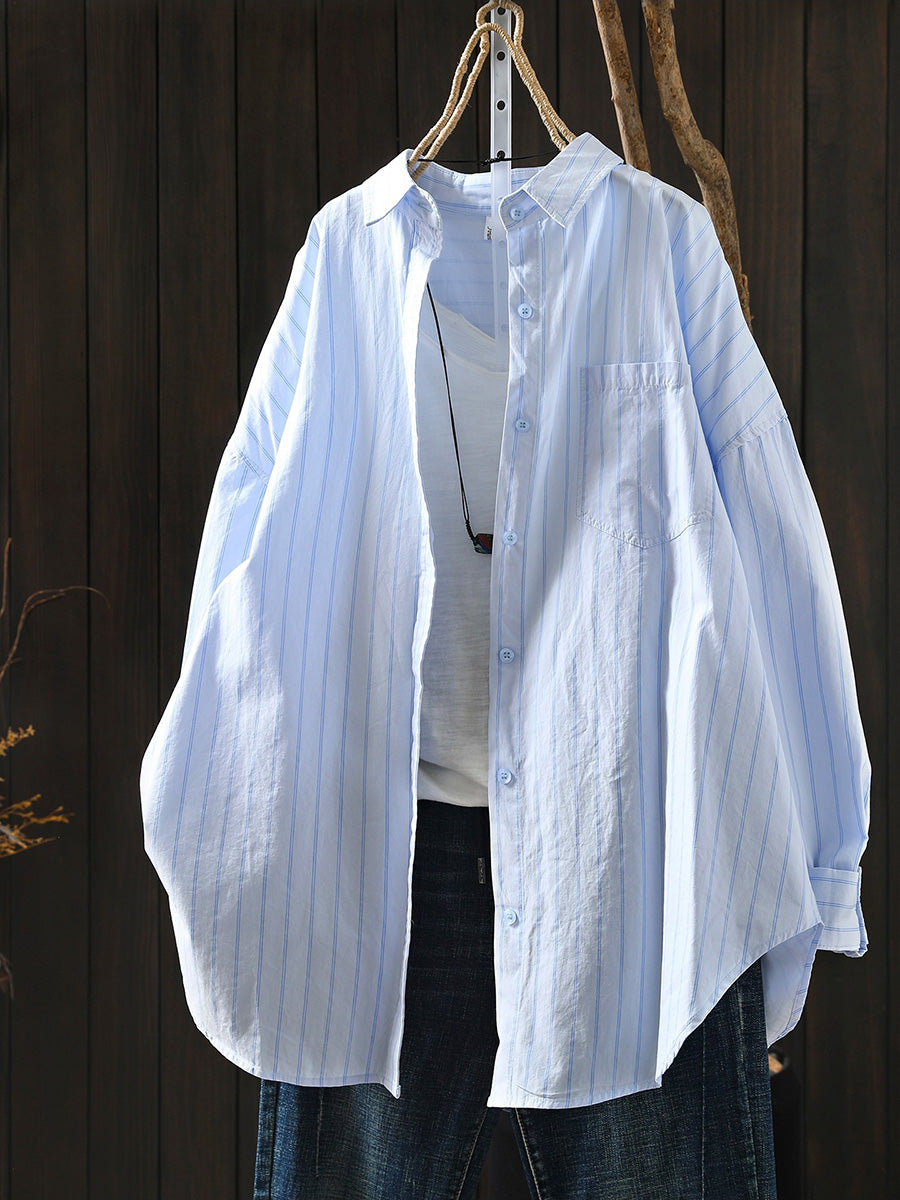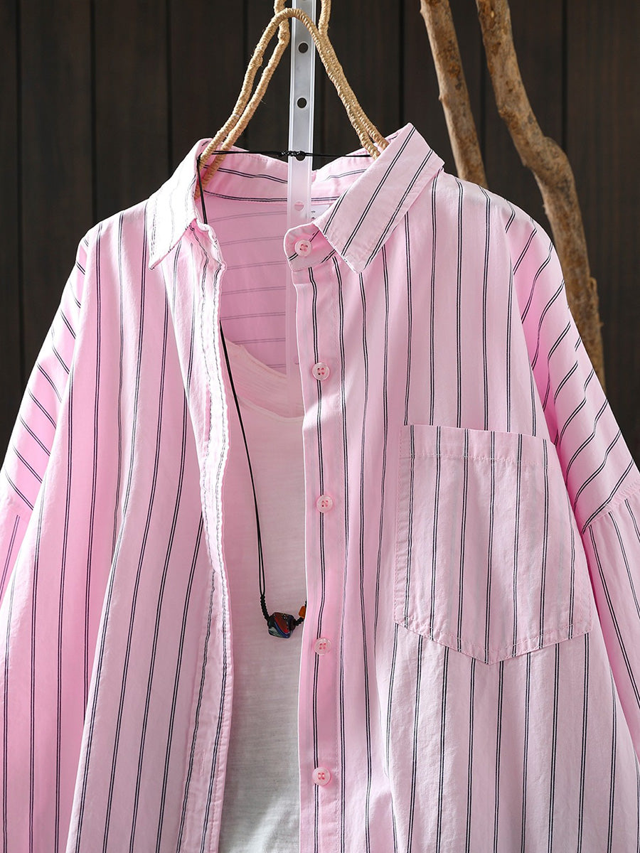 Women Artsy Spring Stripe 100%Cotton Turn-down Collar Shirt