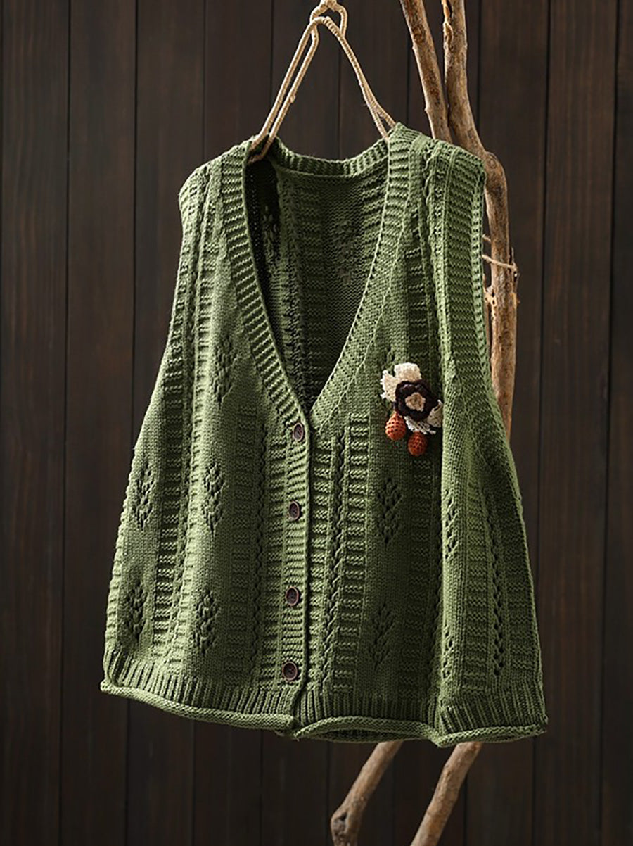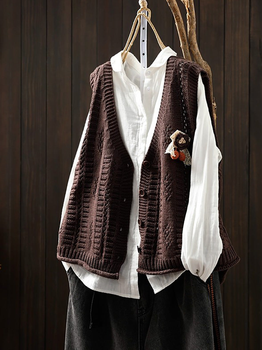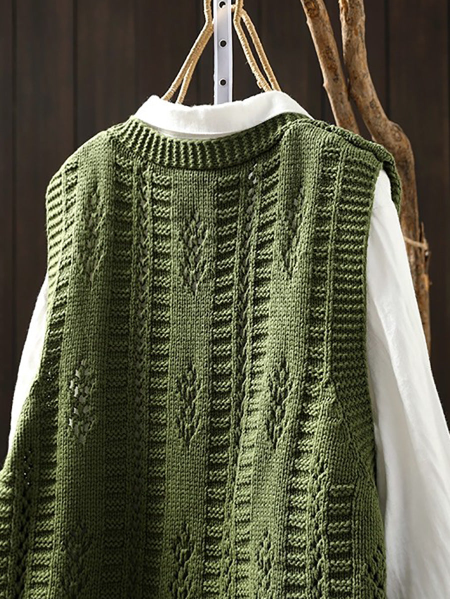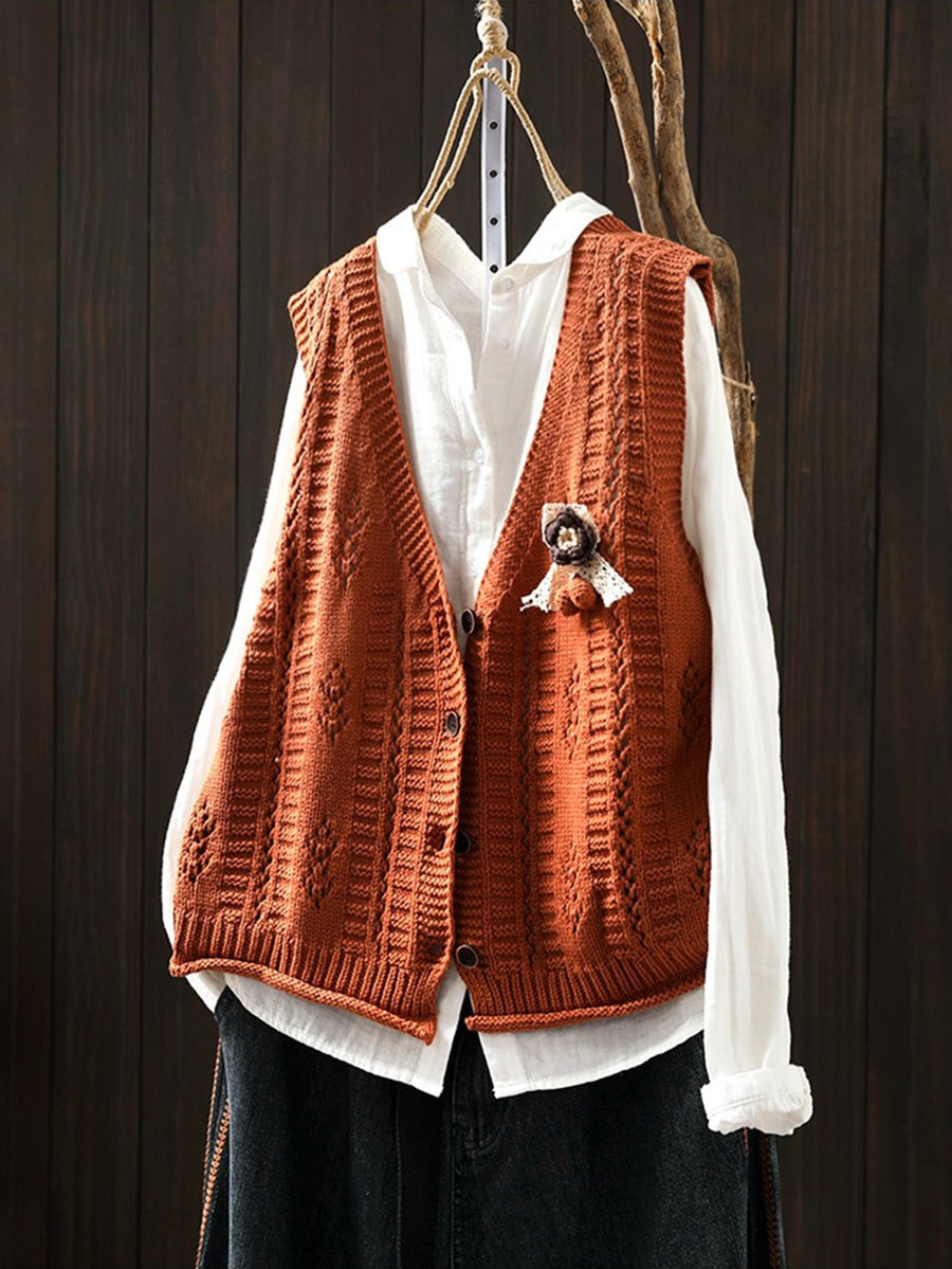Crafted from a thoughtfully balanced blend of 45% cotton and 55% acrylic, this knitted vest delivers both comfort and durability. The distinctive V-neck silhouette pairs with an artsy aesthetic, making it an ideal layering piece for transitional seasons. Perfect for spring and autumn wear, this versatile garment bridges casual and refined styling with understated sophistication.