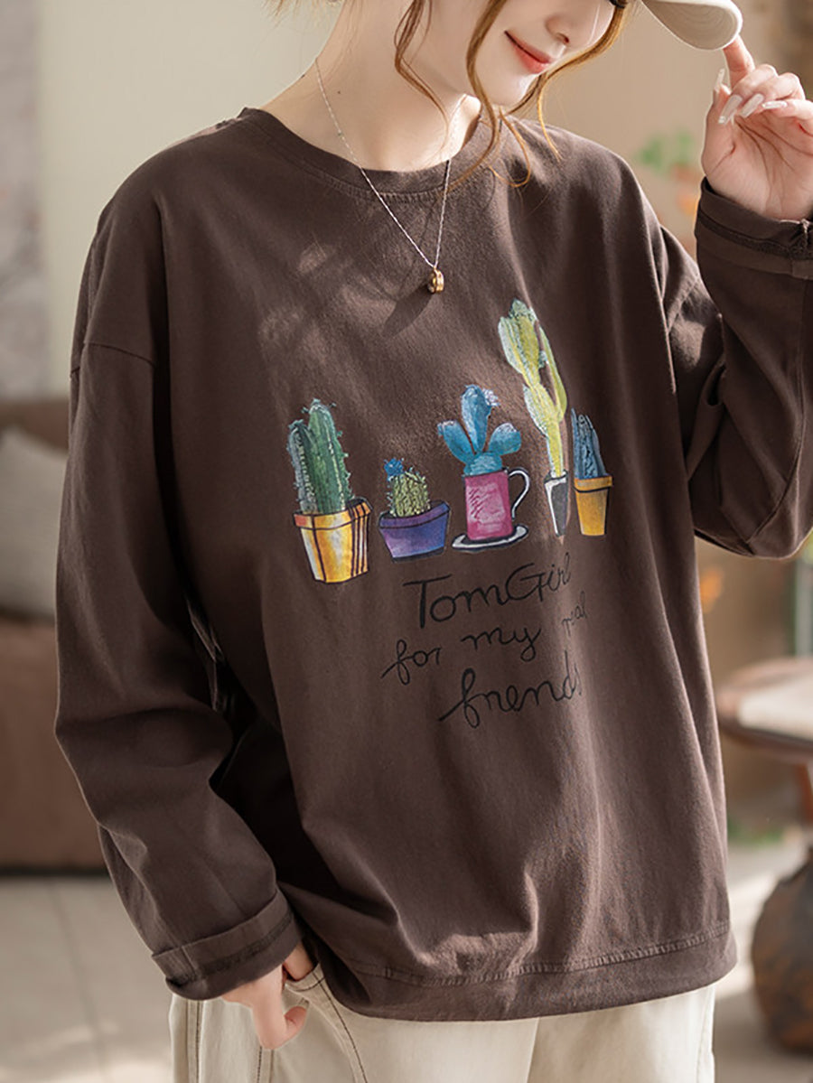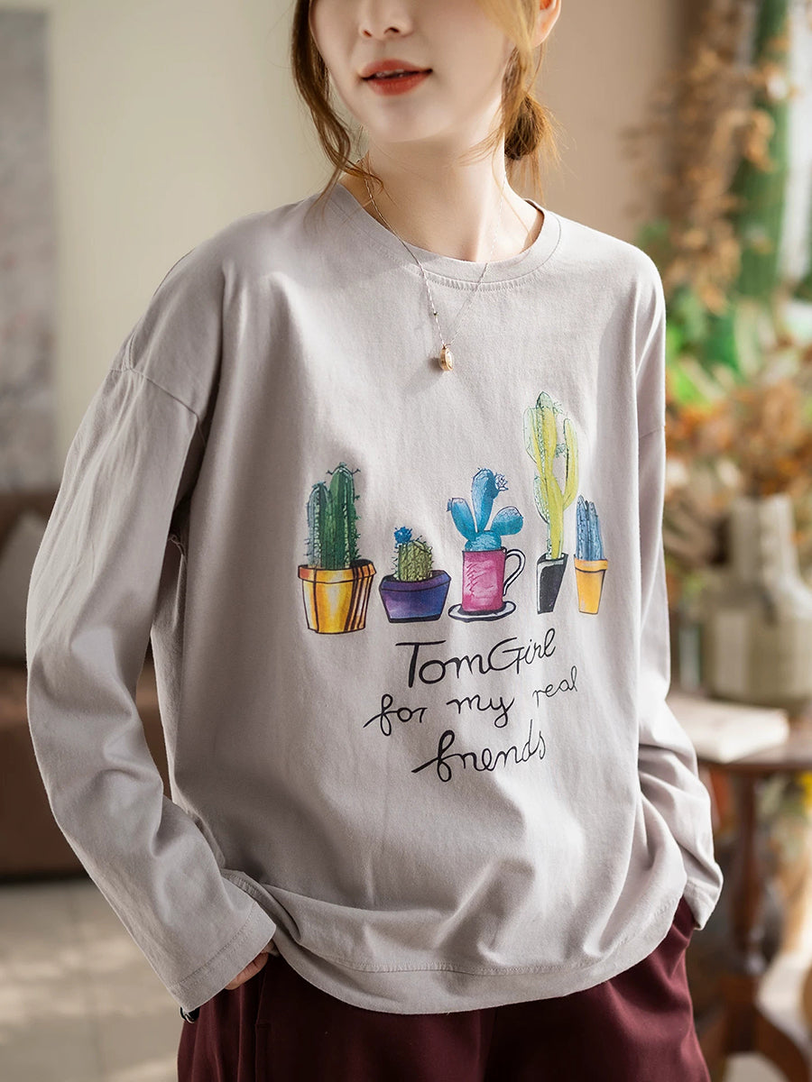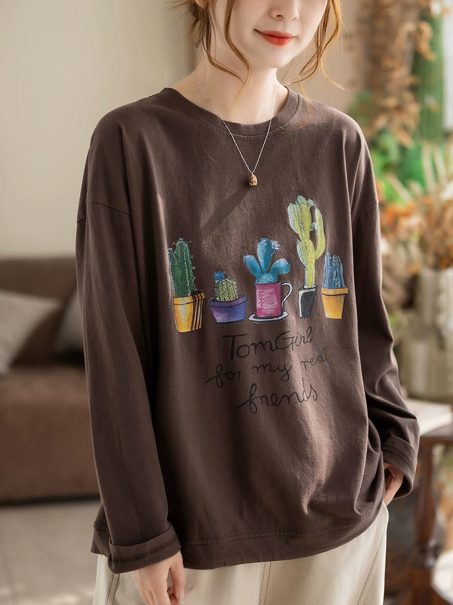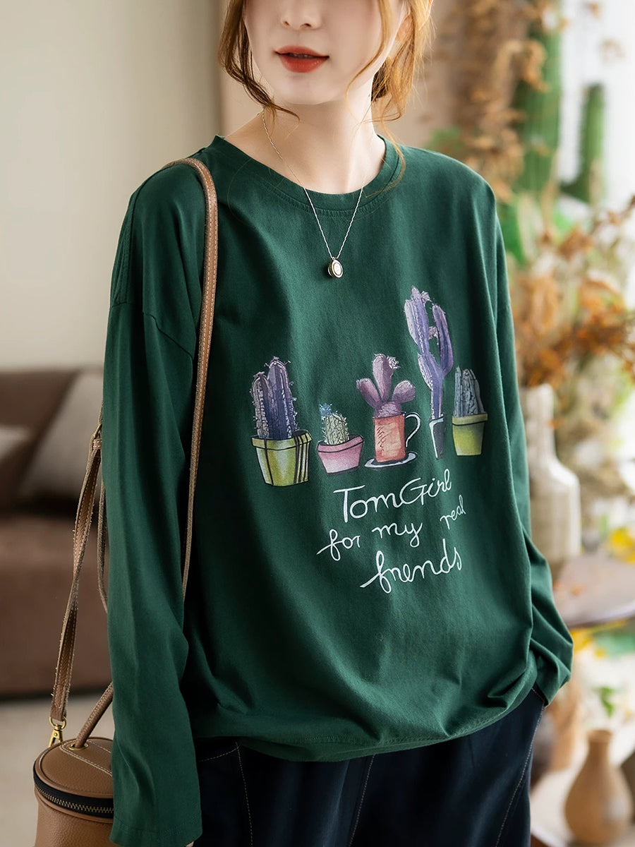 Women Spring Artsy Plants Cotton O-Neck Blouse