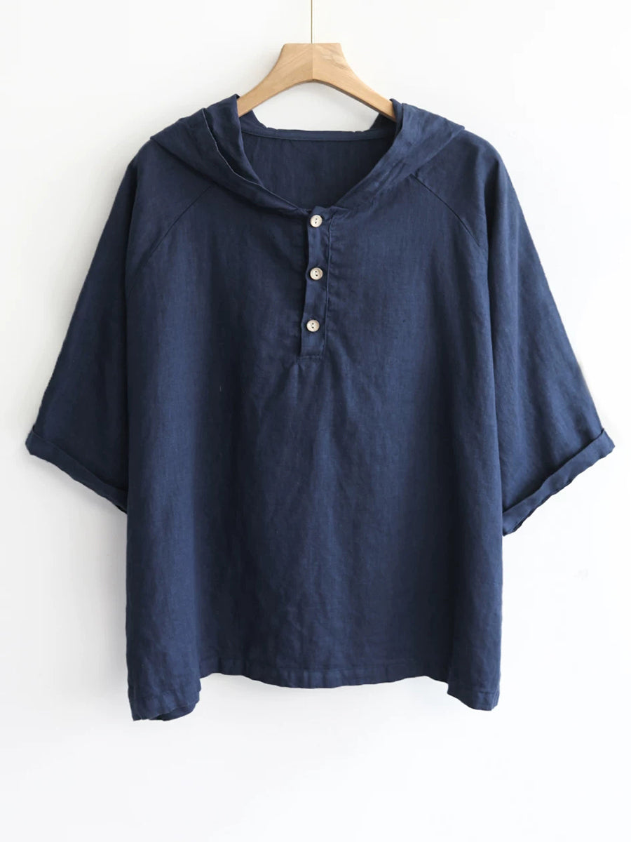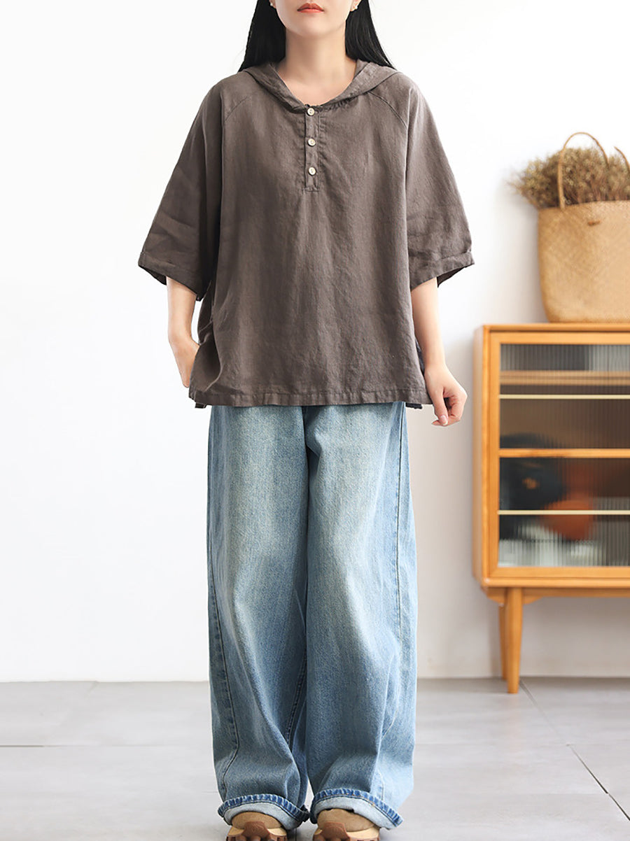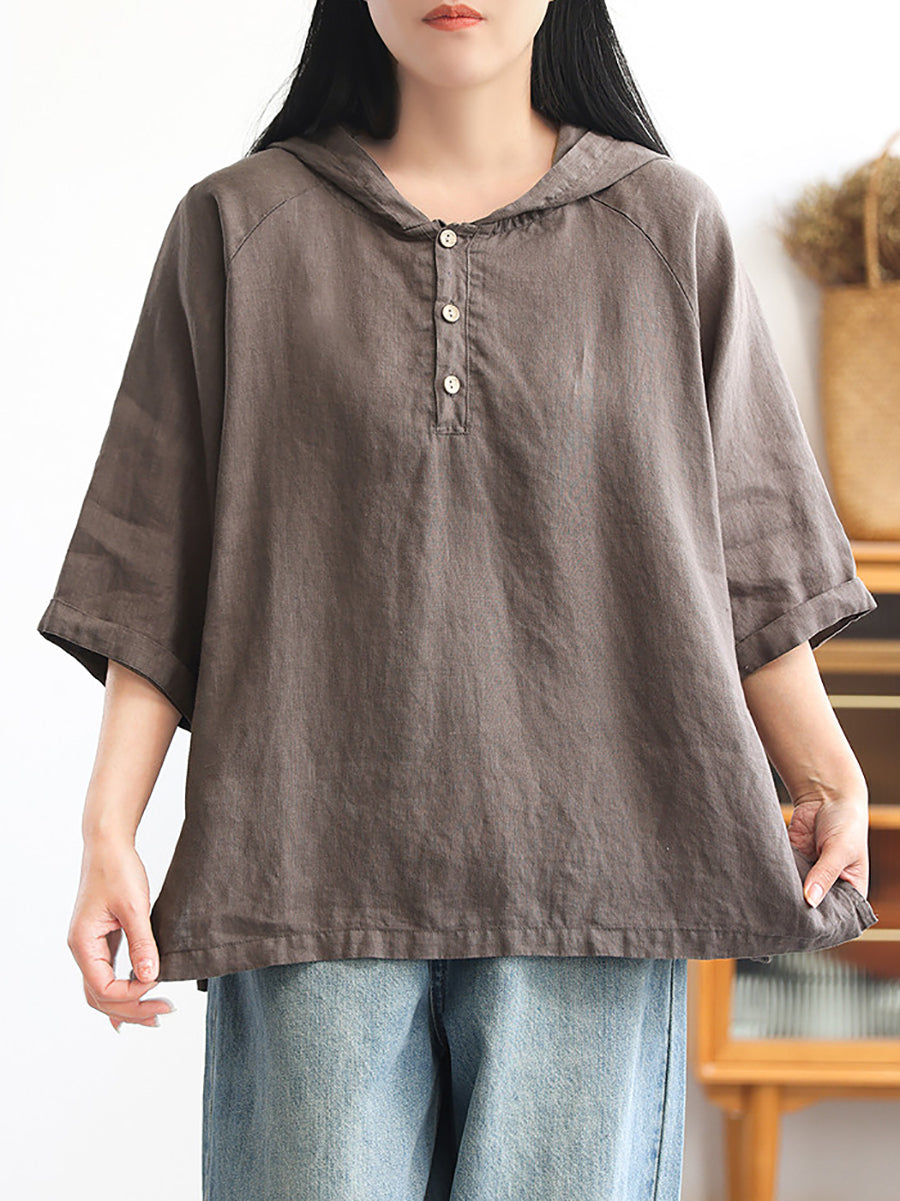Women Summer Pure Color 100%Linen Hoodie