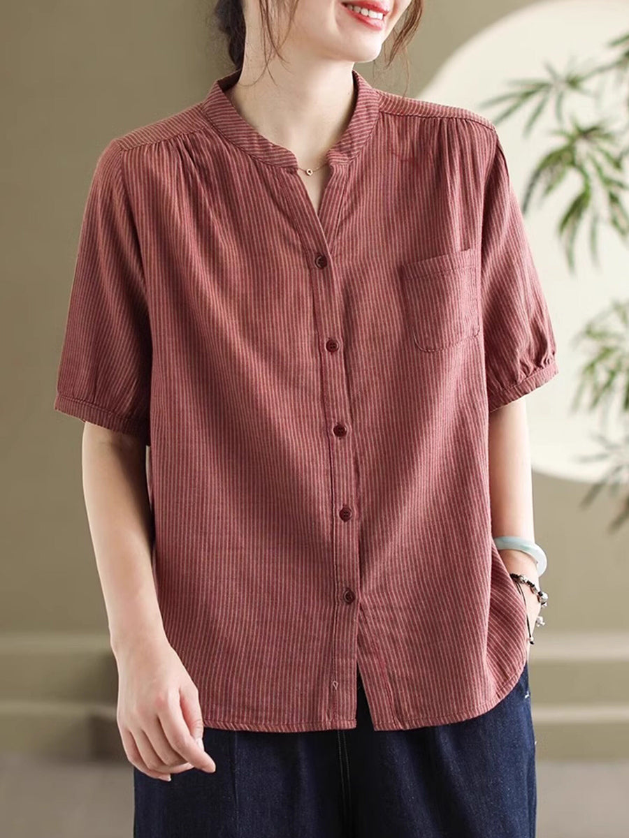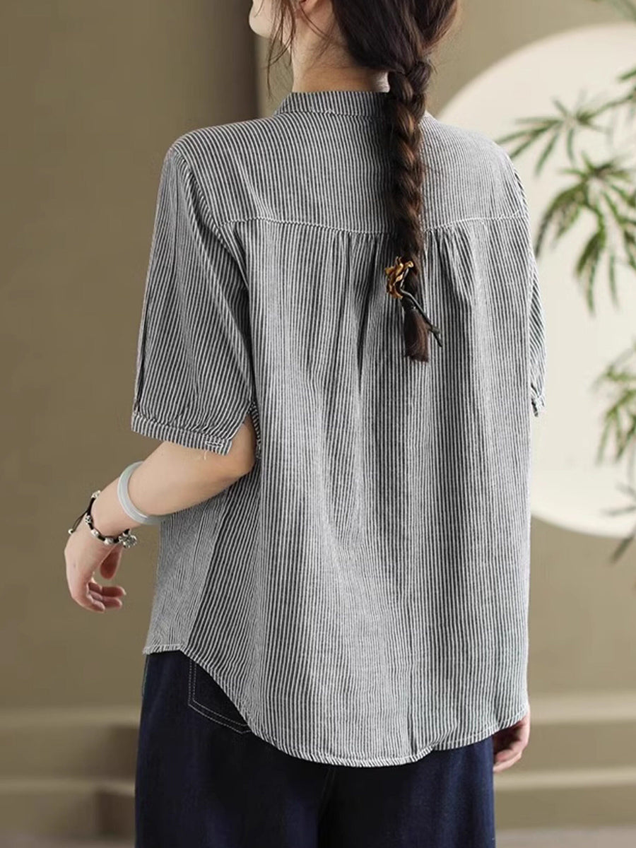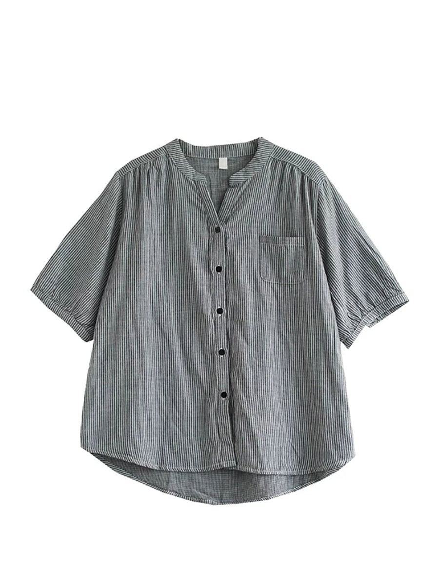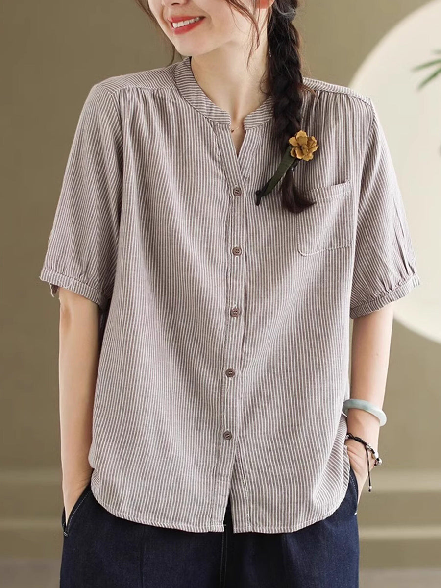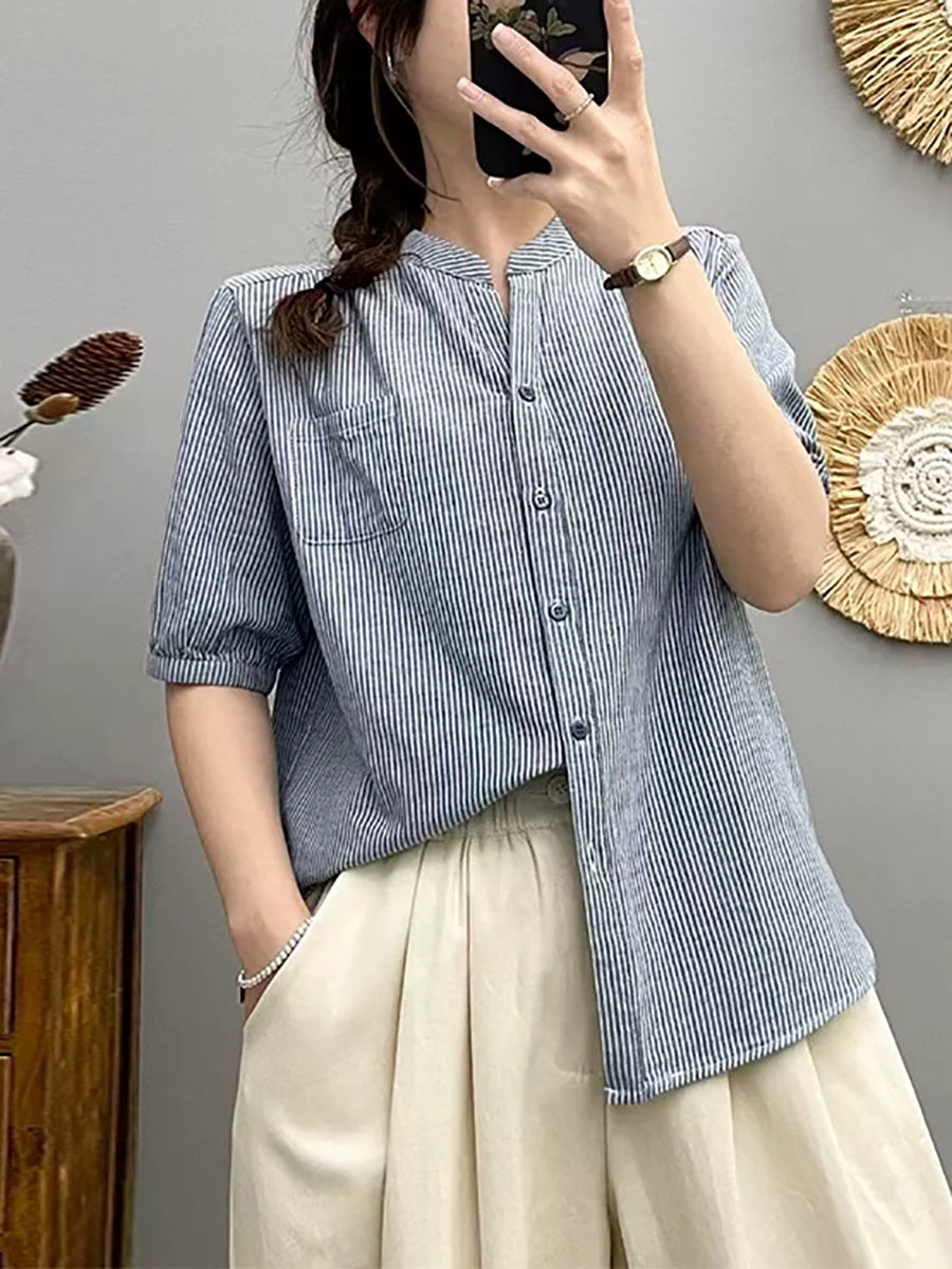 Women Summer Retro Stripe V-Neck 100%Cotton Blouse