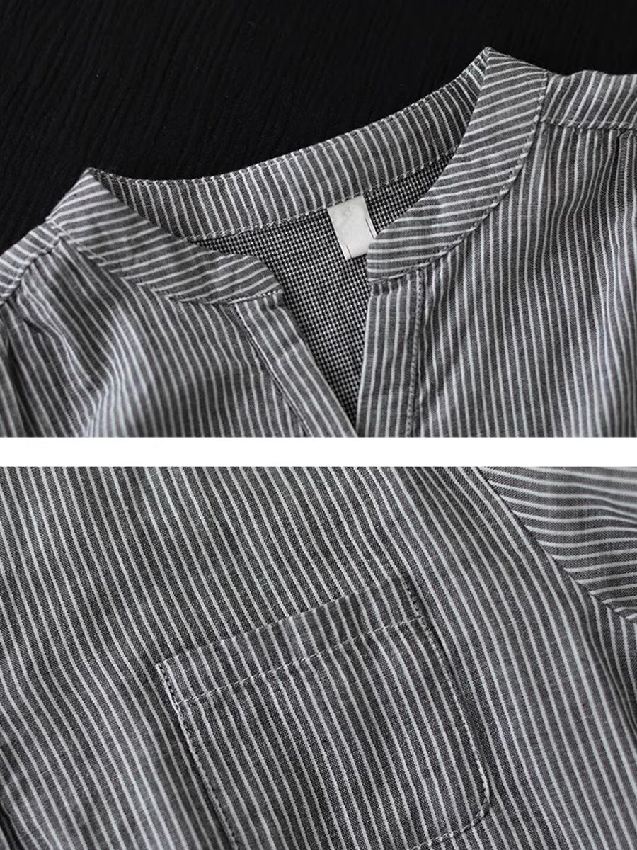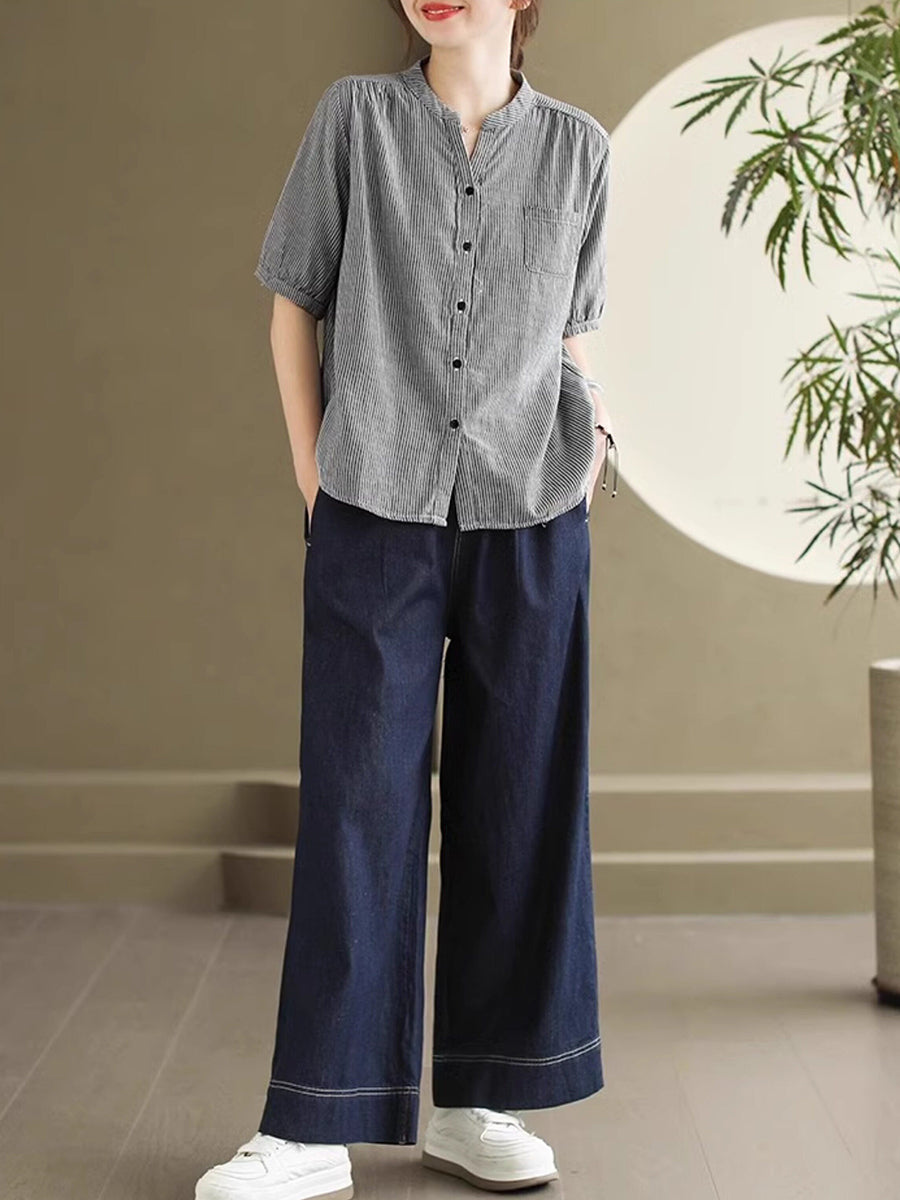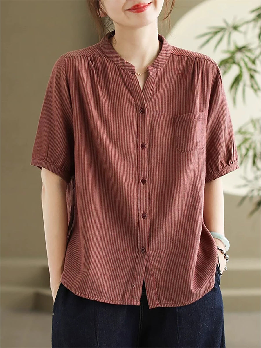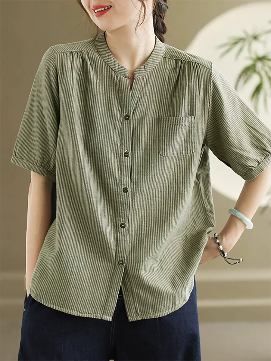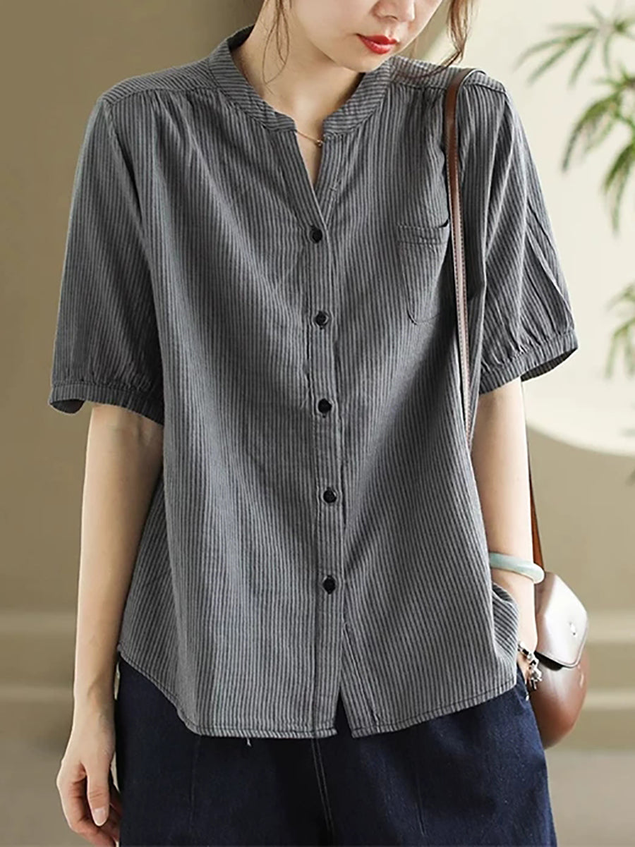 Women Summer Retro Stripe V-Neck 100%Cotton Blouse