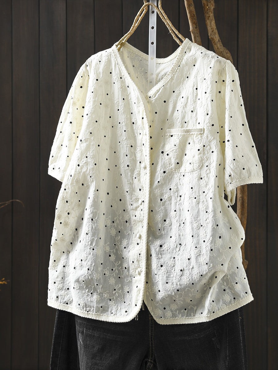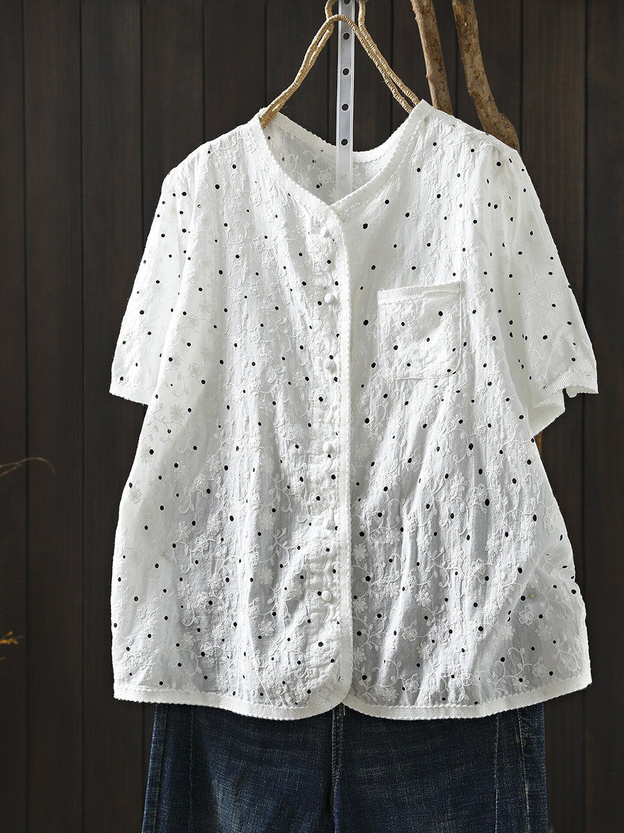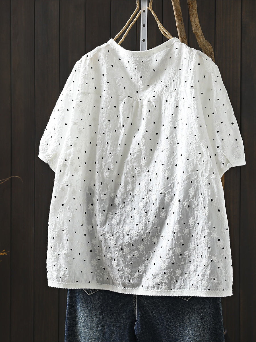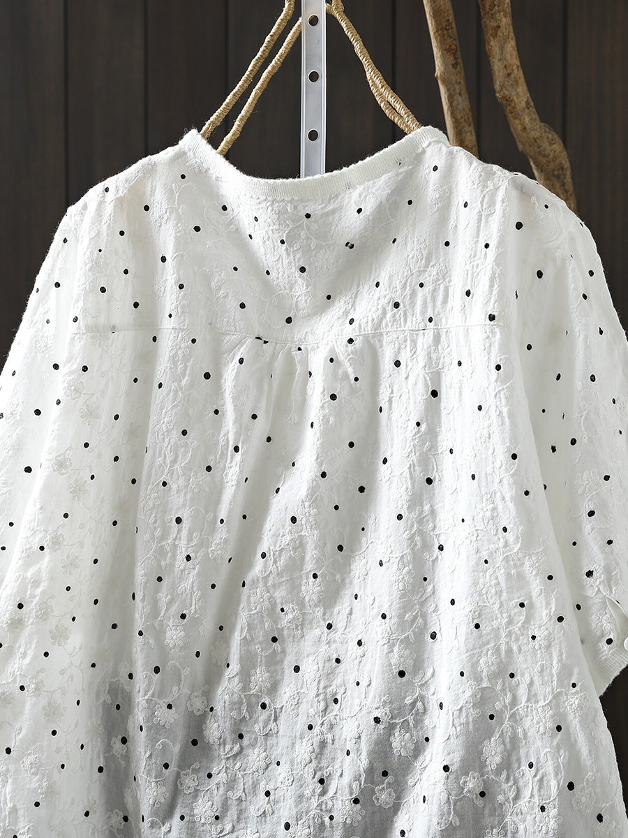 Women Summer Artsy Dot Embroidery O-Neck 100%Cotton Blouse