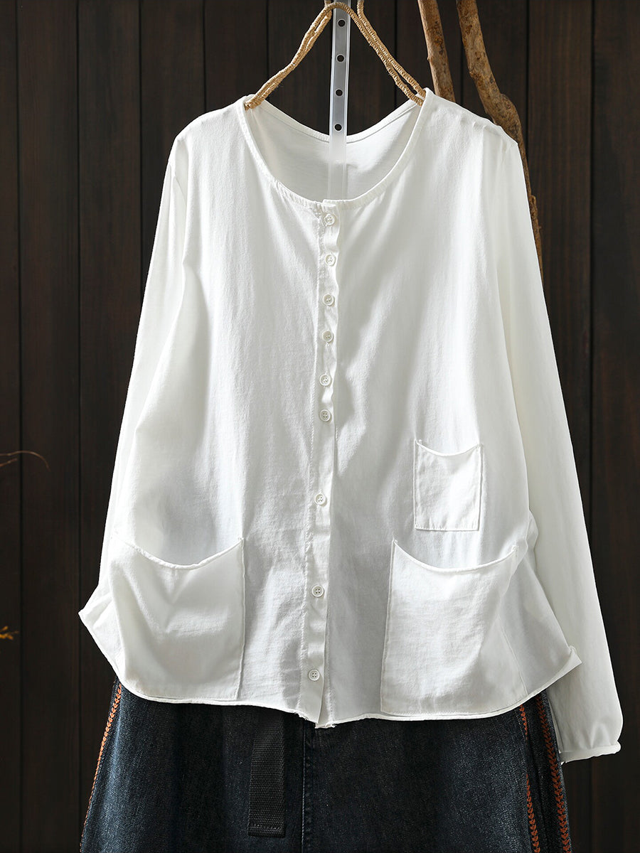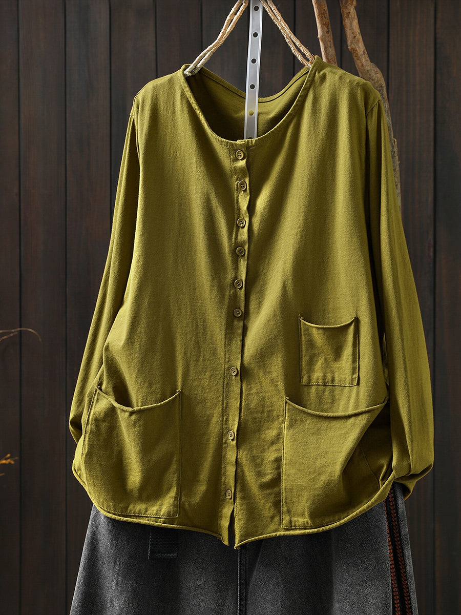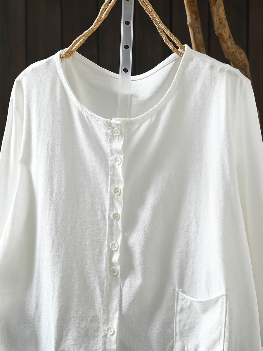 Women Spring Artsy Pure Color O-Neck 100%Cotton Blouse