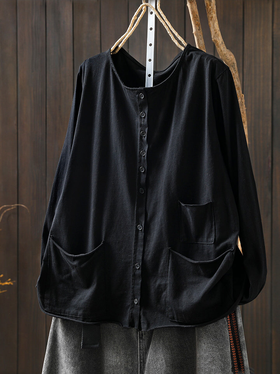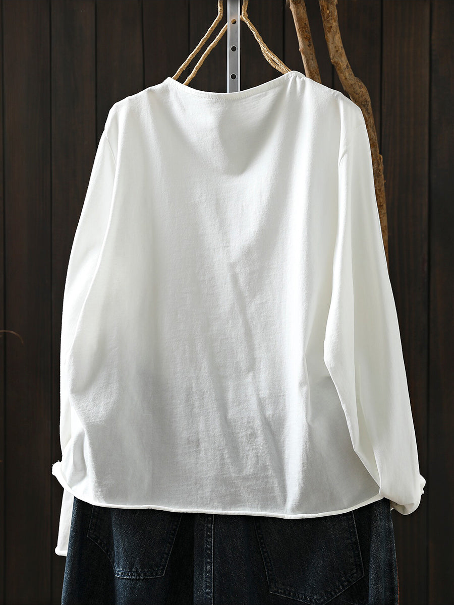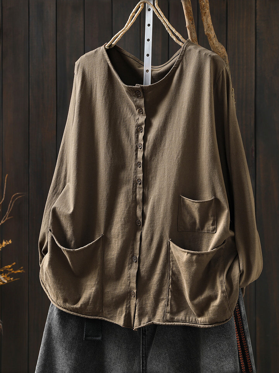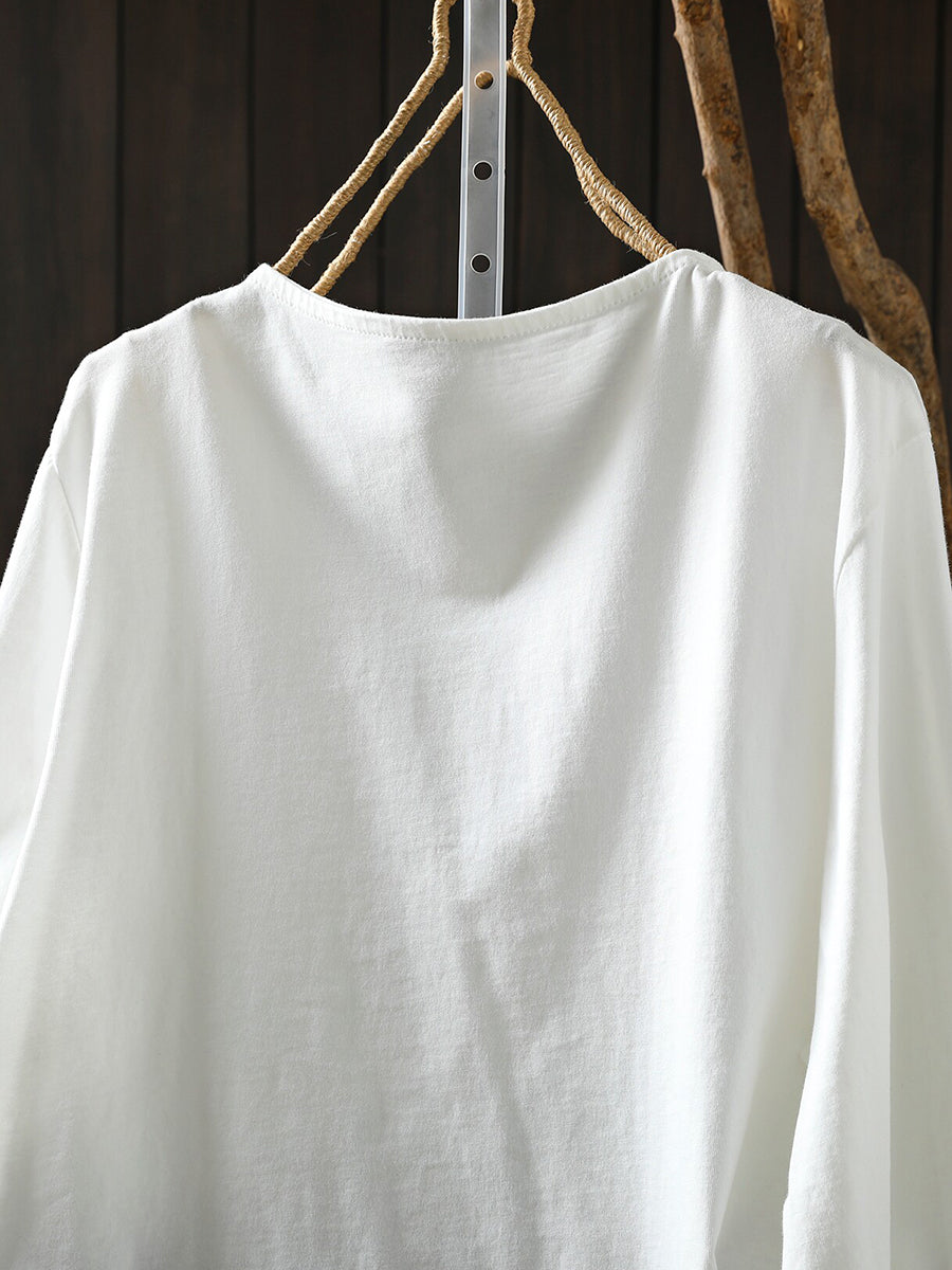 Women Spring Artsy Pure Color O-Neck 100%Cotton Blouse