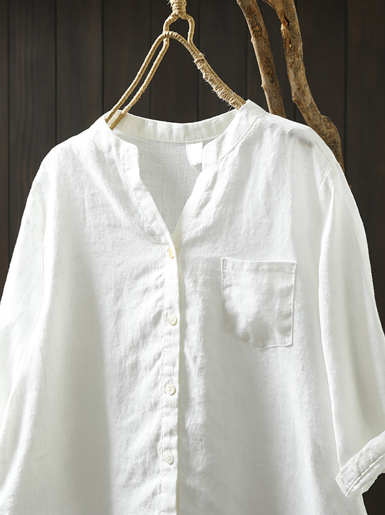 Plus Size Women Summer V-Neck Pure Color 100%Linen Shirt