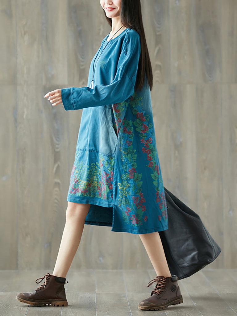 Women Artsy Autumn Flower O-Neck Cotton Dress