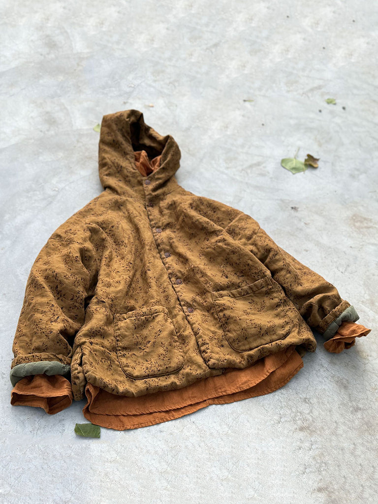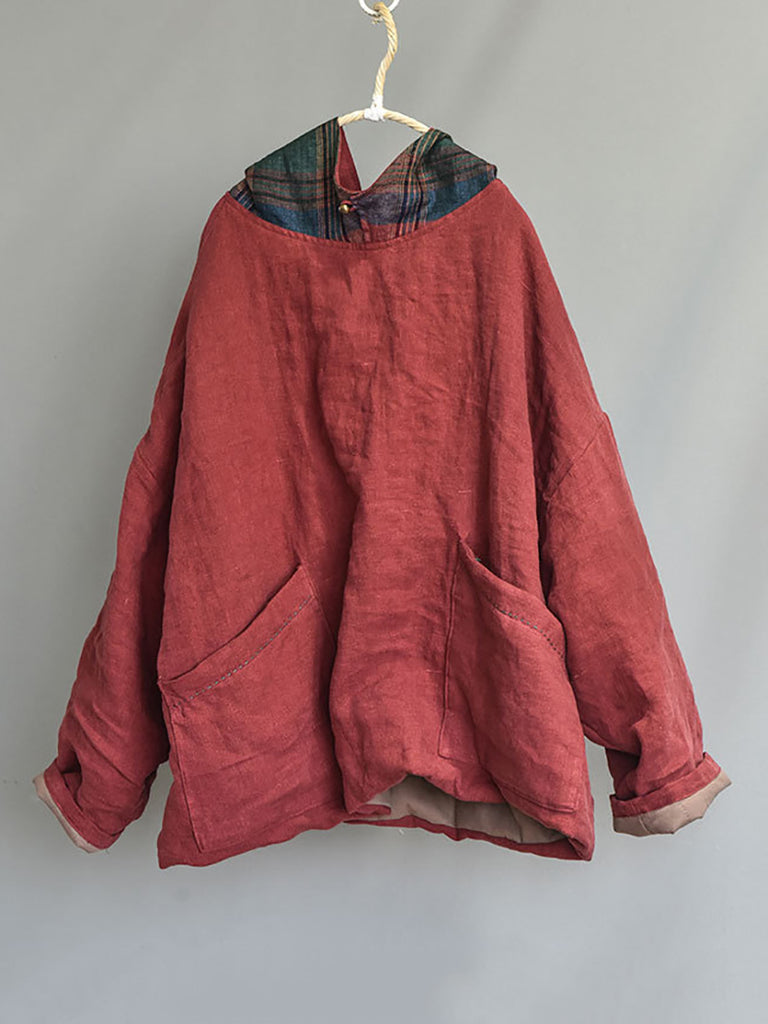 This product features a full-length raglan sleeve style and a retro design, perfect for the winter and autumn seasons. It is made from high-quality linen material and showcases a striking colorblock pattern. The hooded collar adds an extra touch of warmth and style.