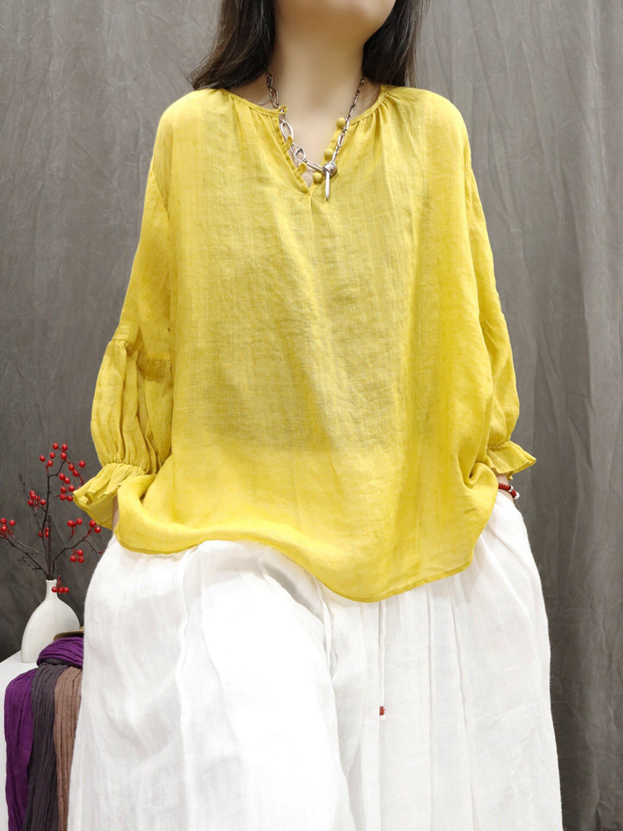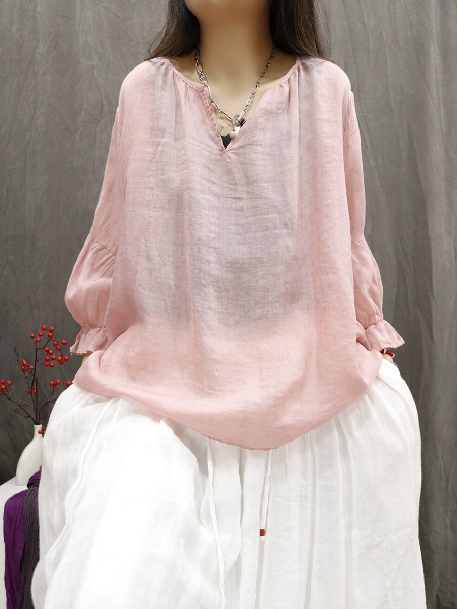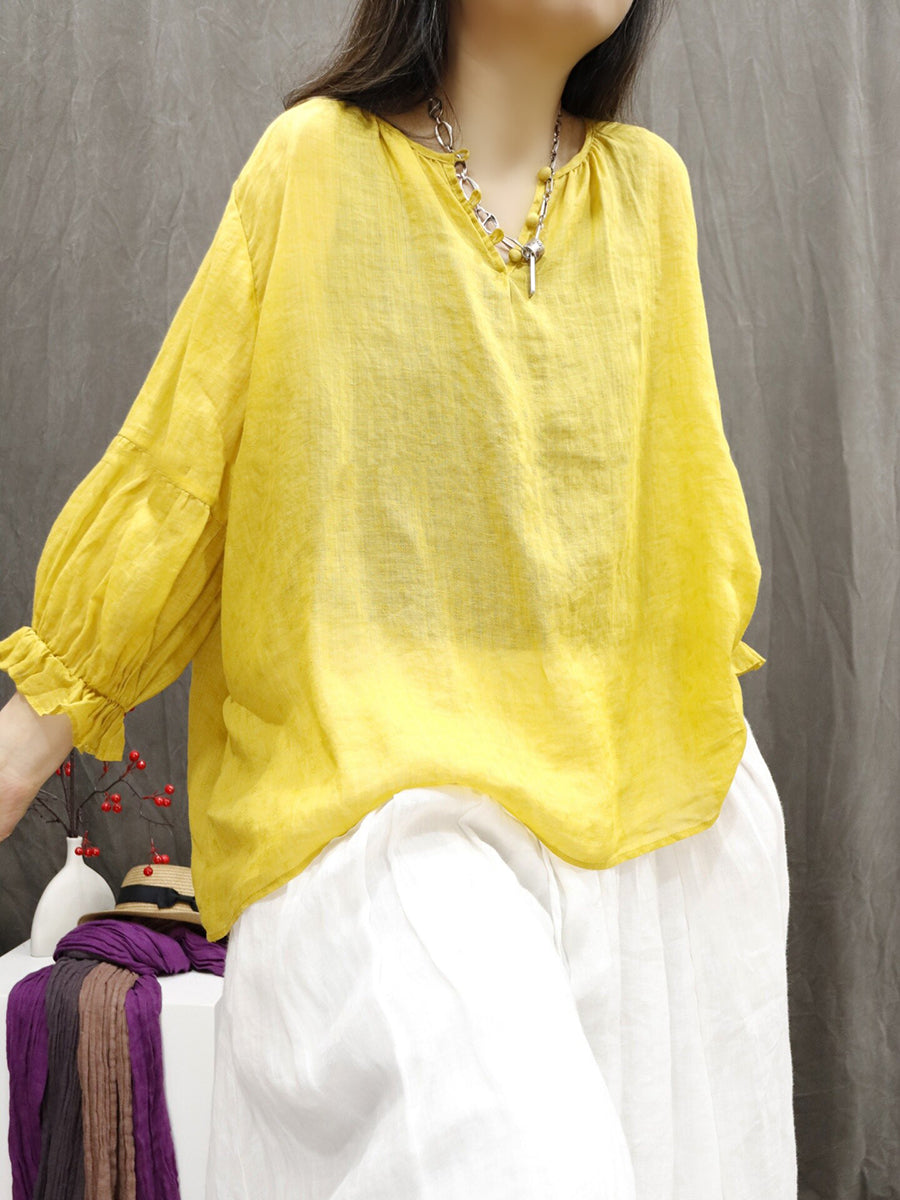 Women Artsy Summer Pure Color 100%Ramie V-Neck Blouse