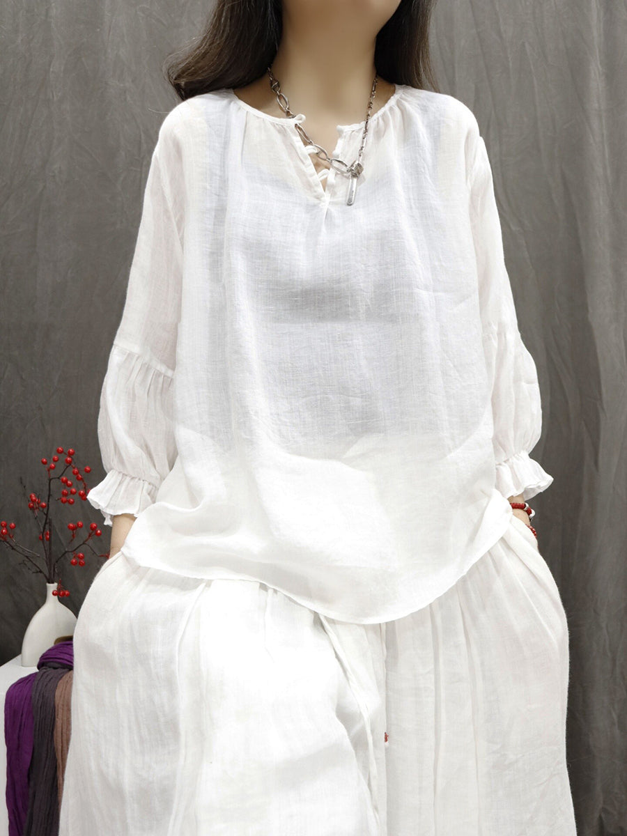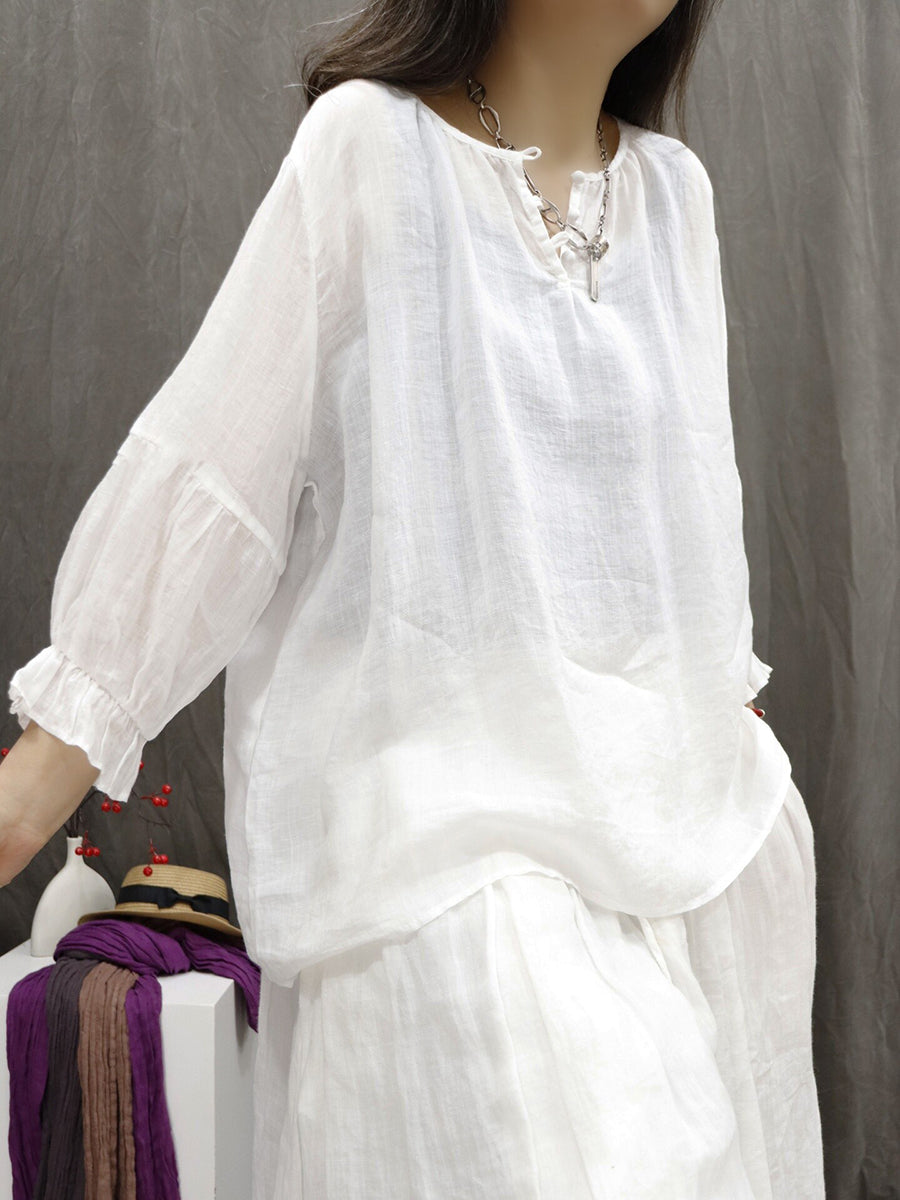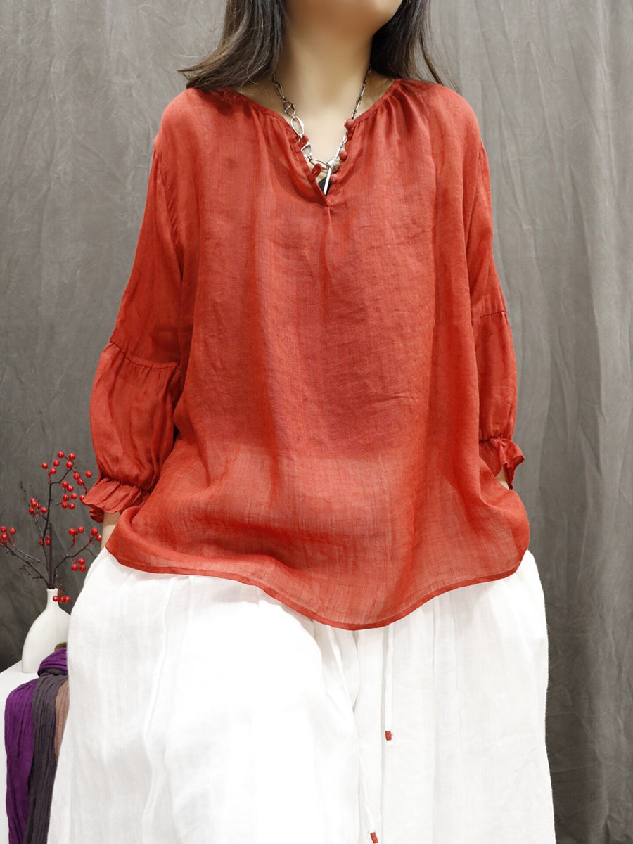 Women Artsy Summer Pure Color 100%Ramie V-Neck Blouse