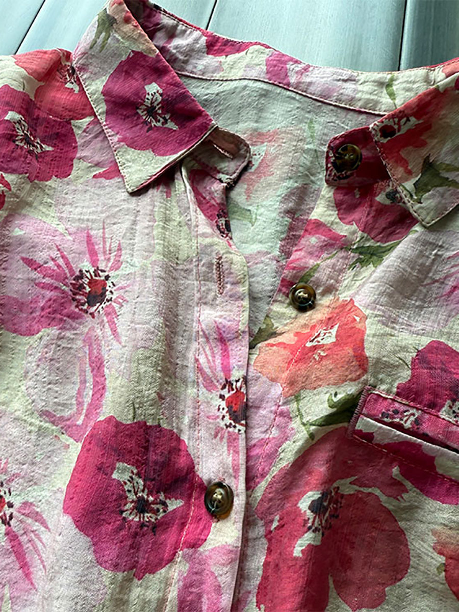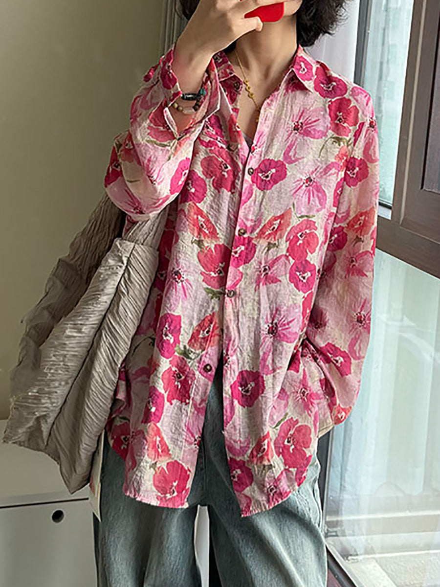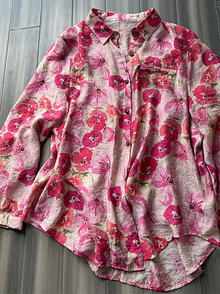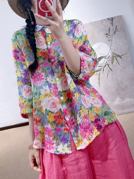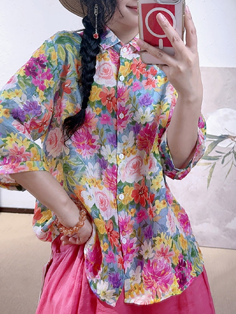 Plus Size Women Summer Artsy Flower Turn-down Collar Shirt