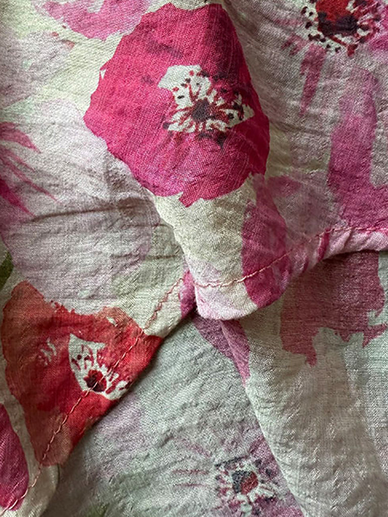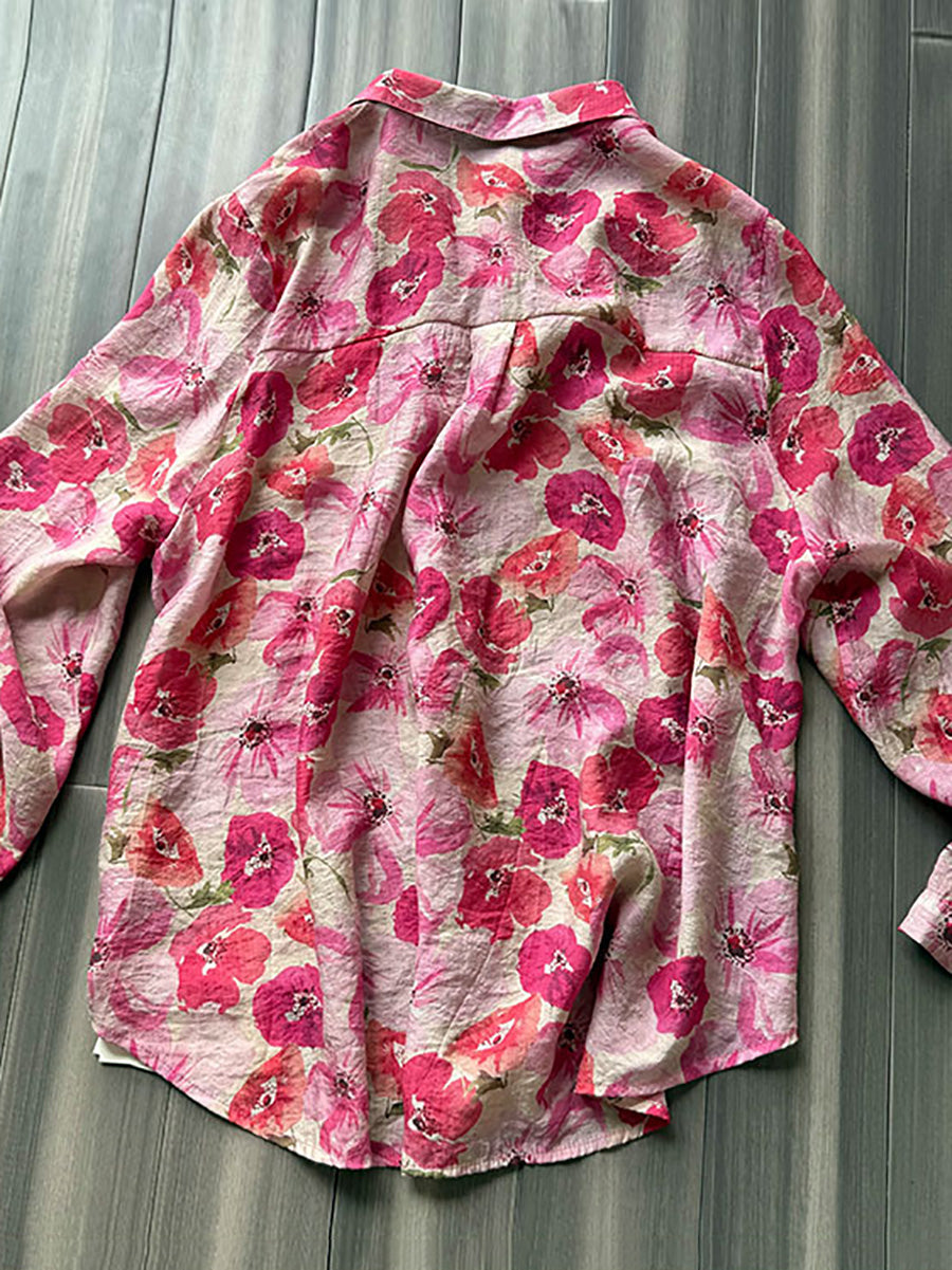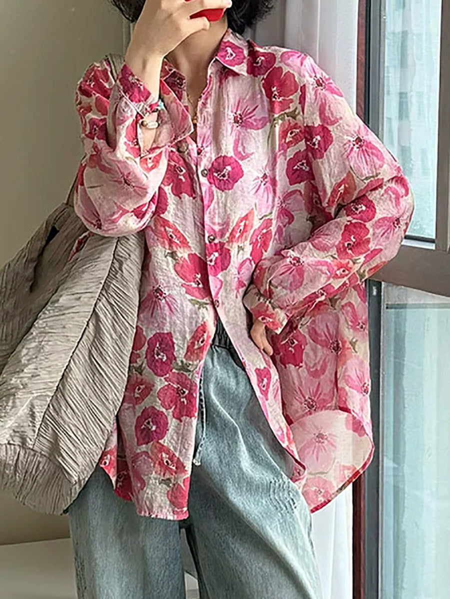 Plus Size Women Summer Artsy Flower Turn-down Collar Shirt