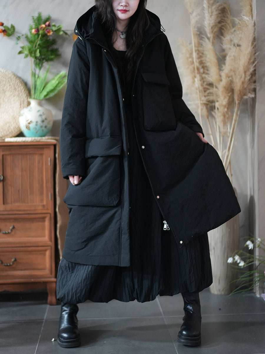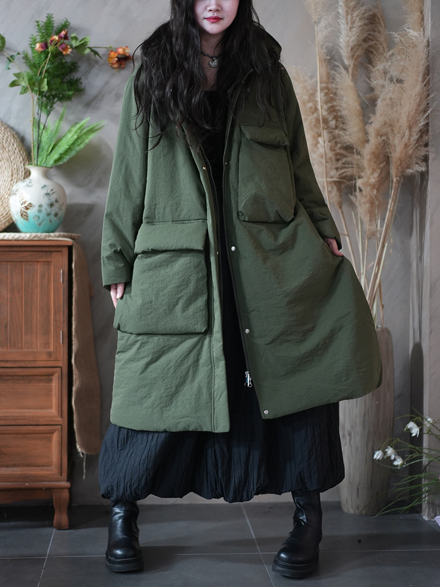 Women Winter Pure Color Pocket Padded Hooded Coat