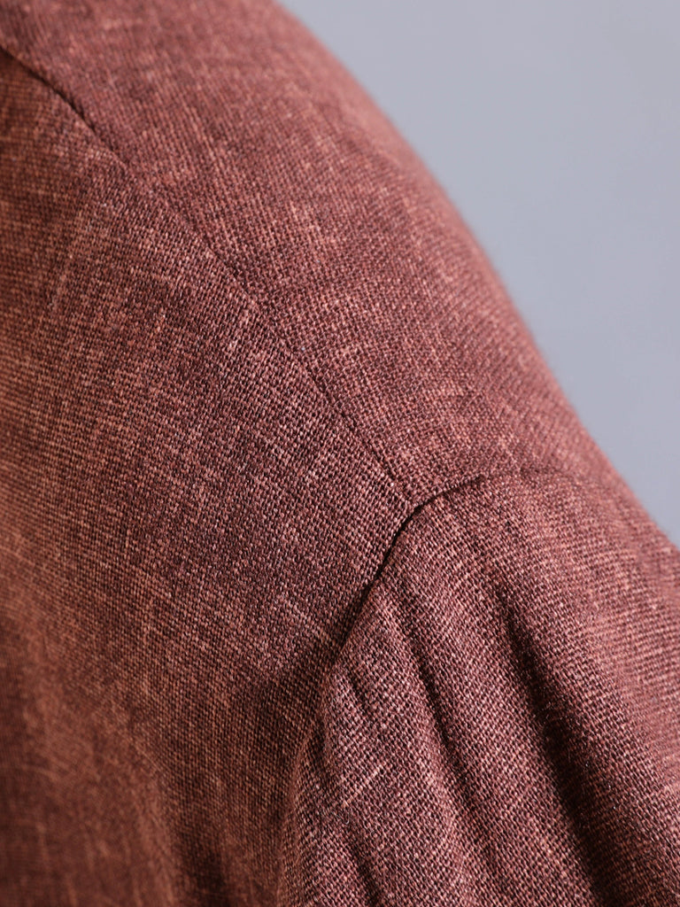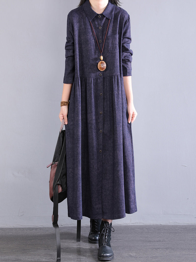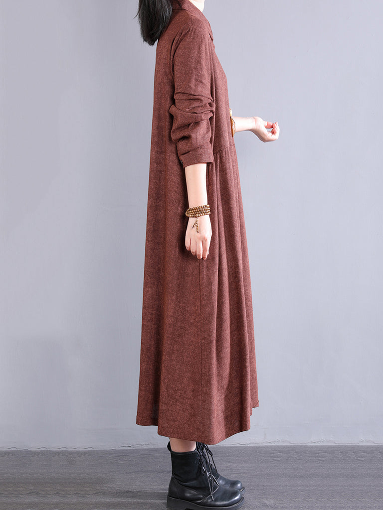 Women Autumn Pure Color Turn-down Collar 100%Cotton Dress