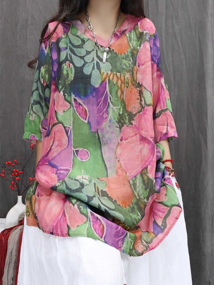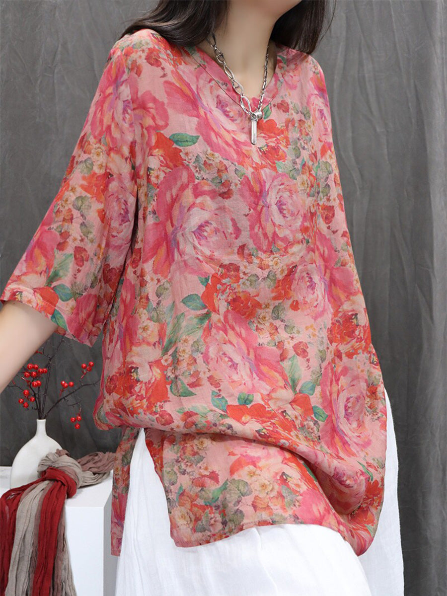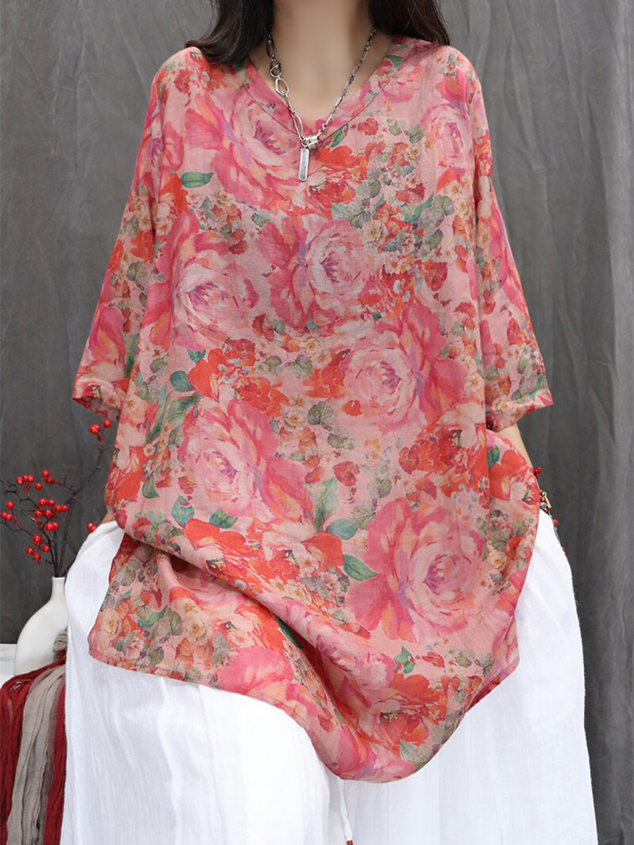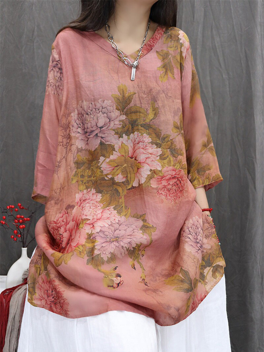 Women Summer Artsy Flower 100%Ramie V-Neck Blouse