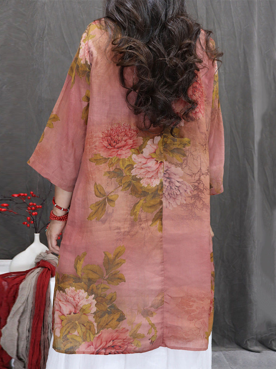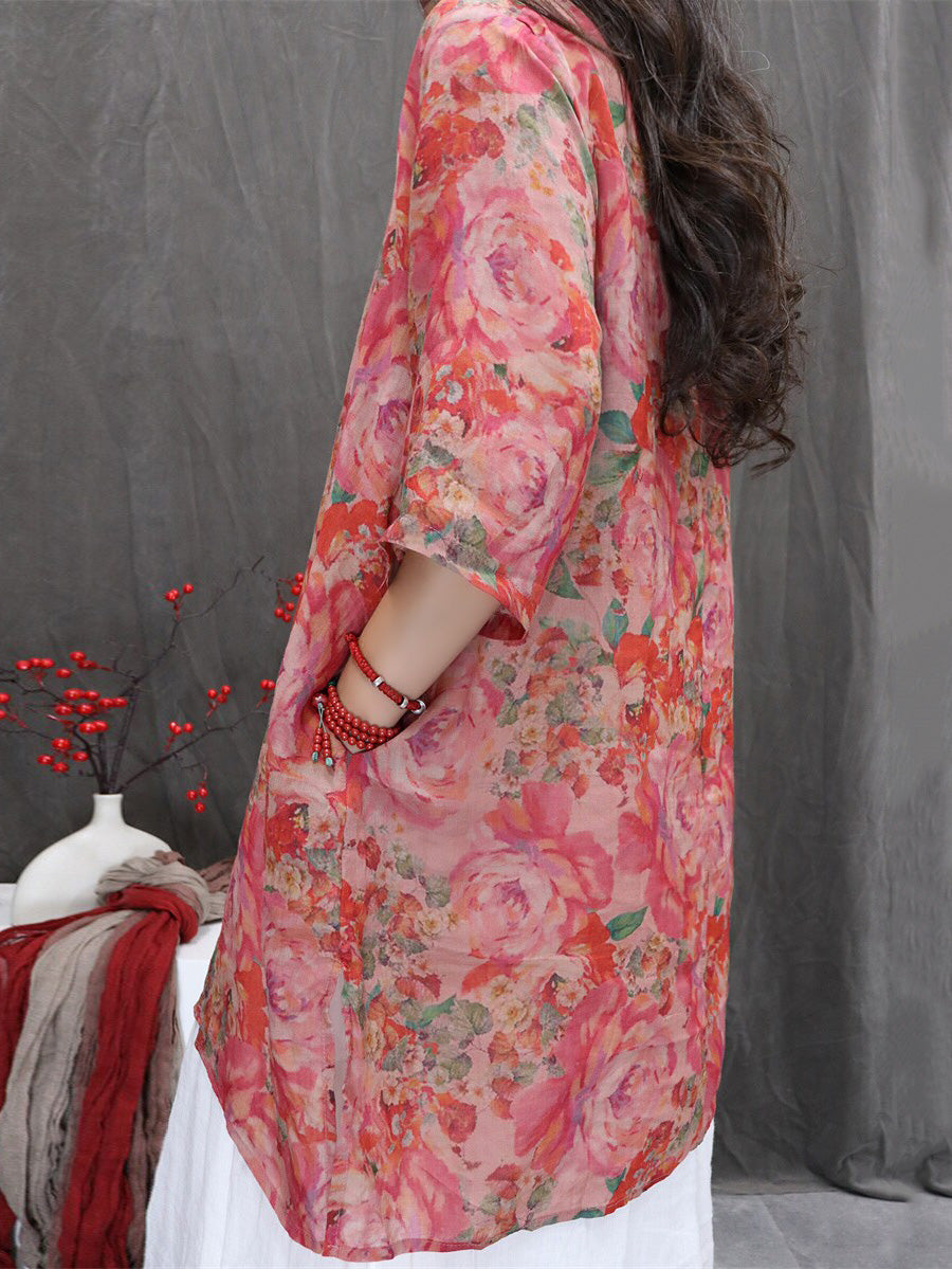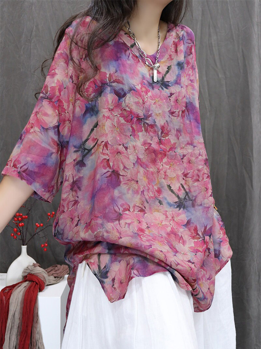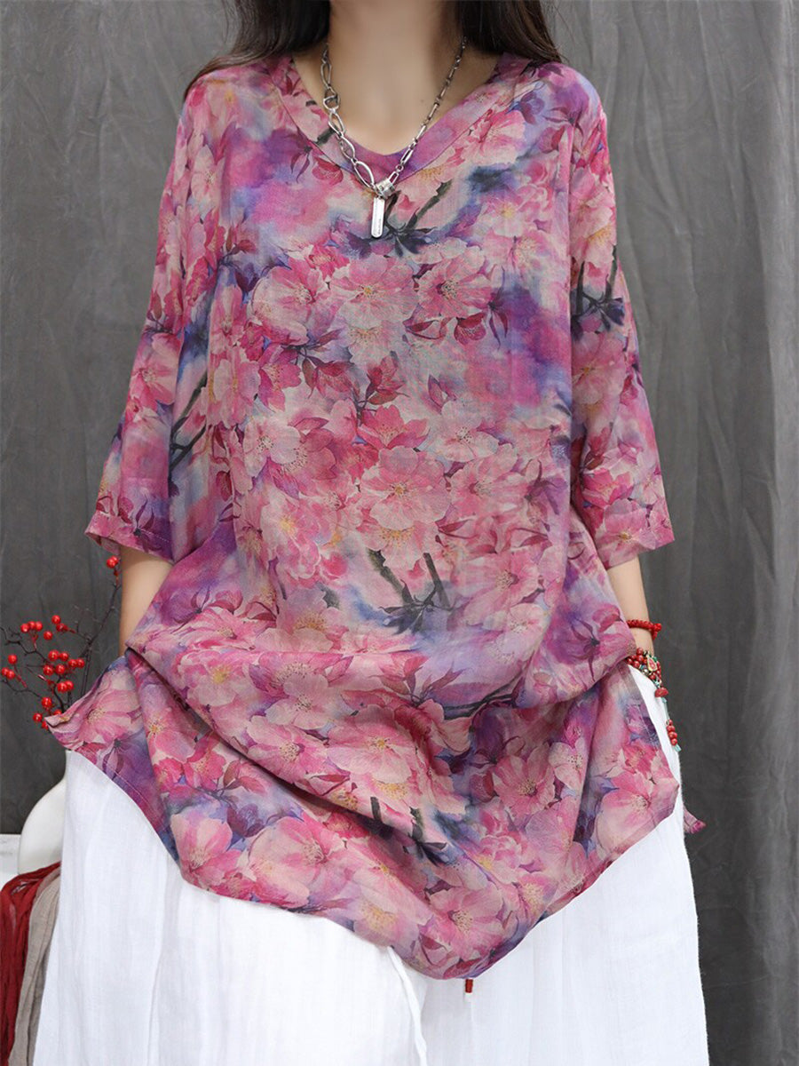 Women Summer Artsy Flower 100%Ramie V-Neck Blouse