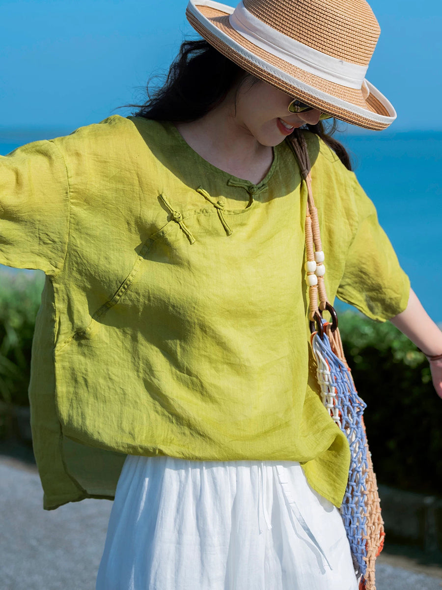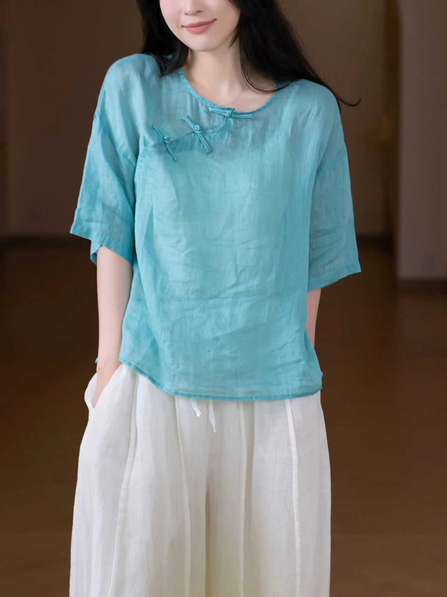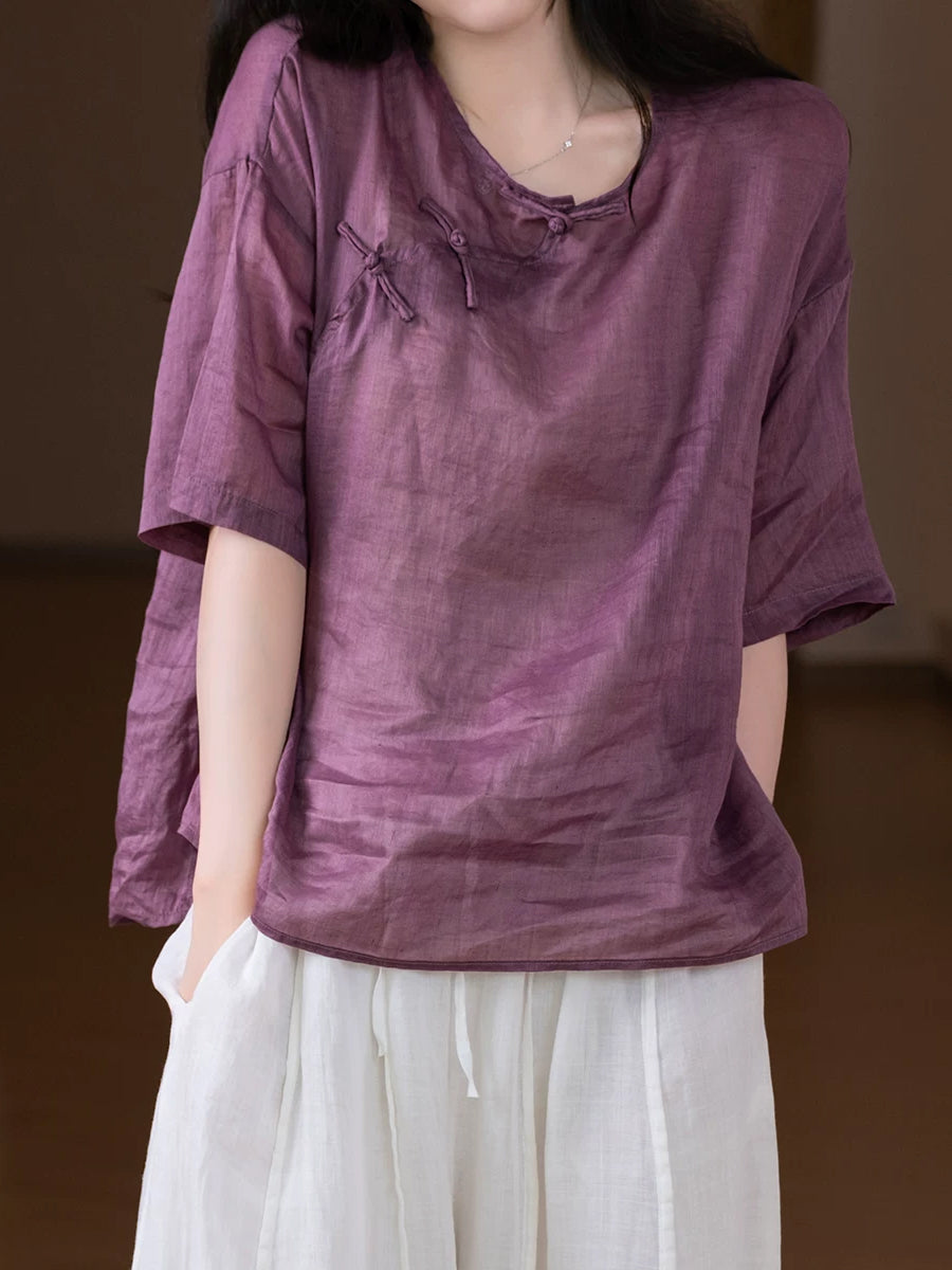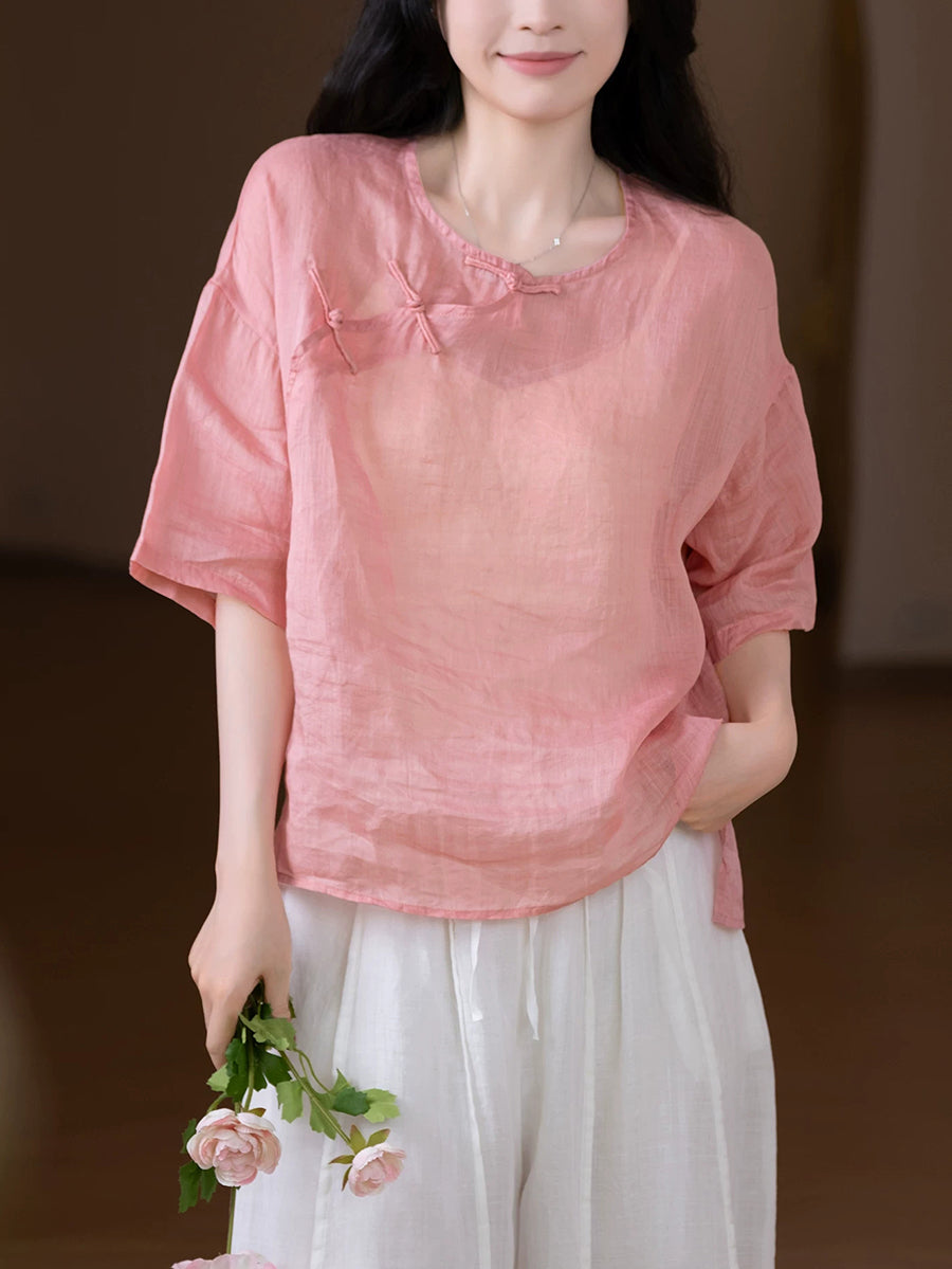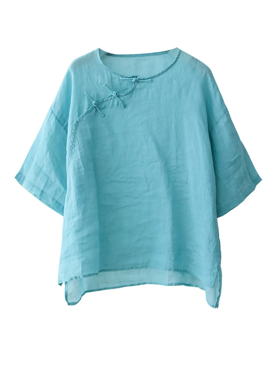 Women Summer Ethnic Pure Color 100%Ramie O-Neck Blouse