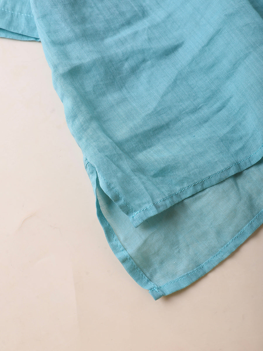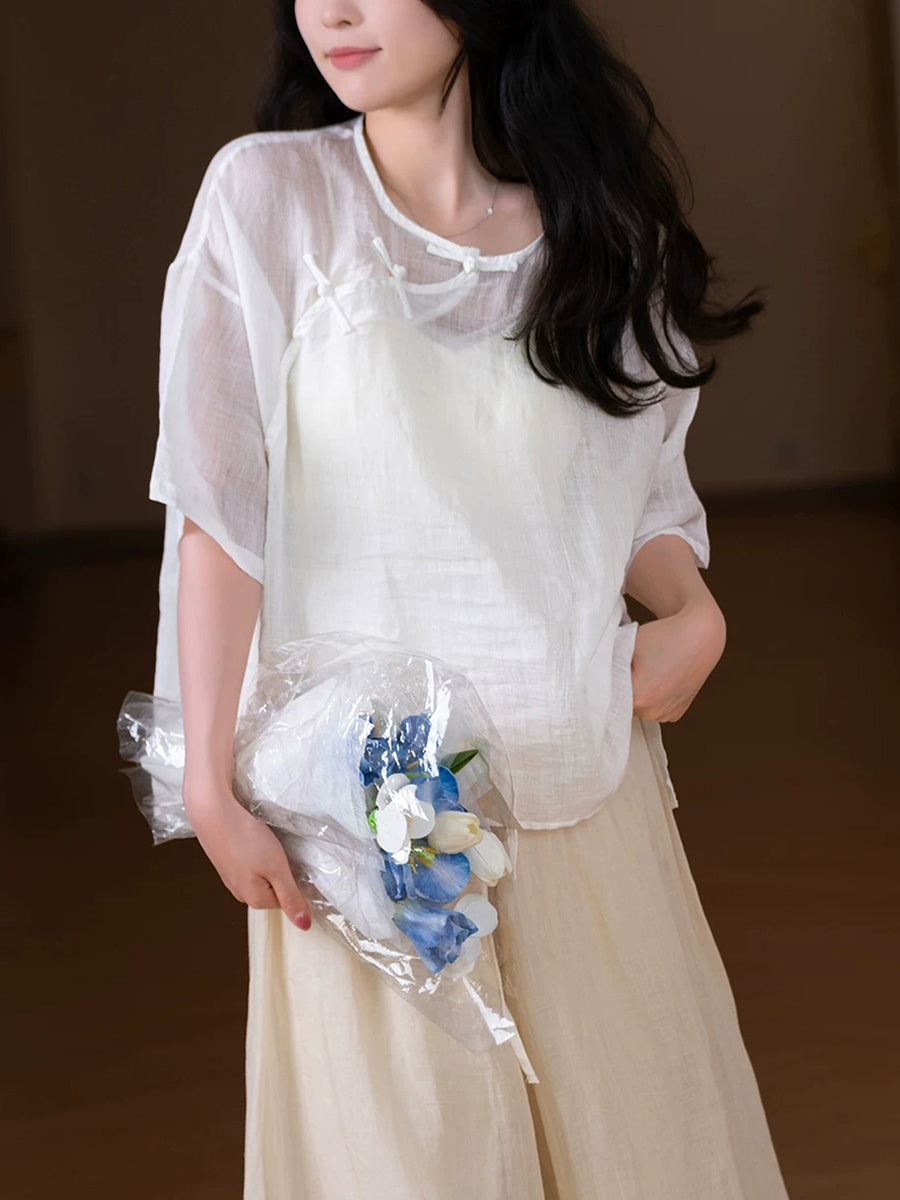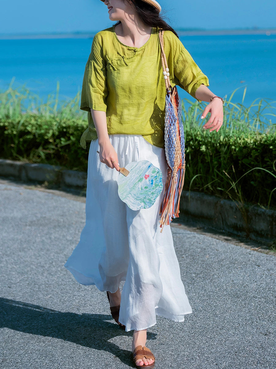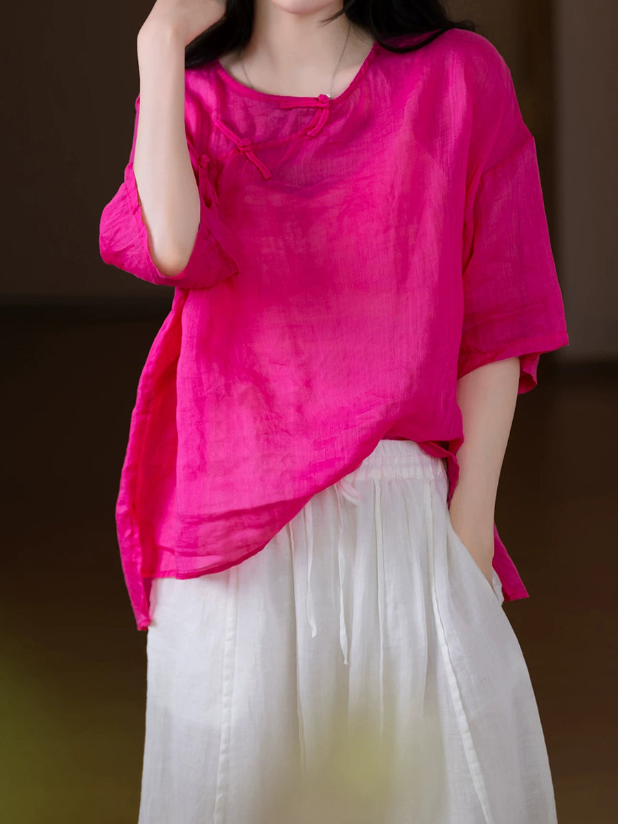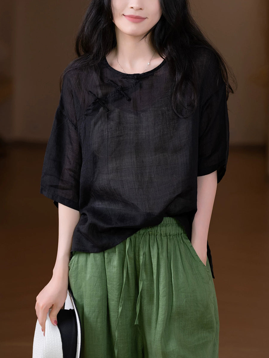 Women Summer Ethnic Pure Color 100%Ramie O-Neck Blouse