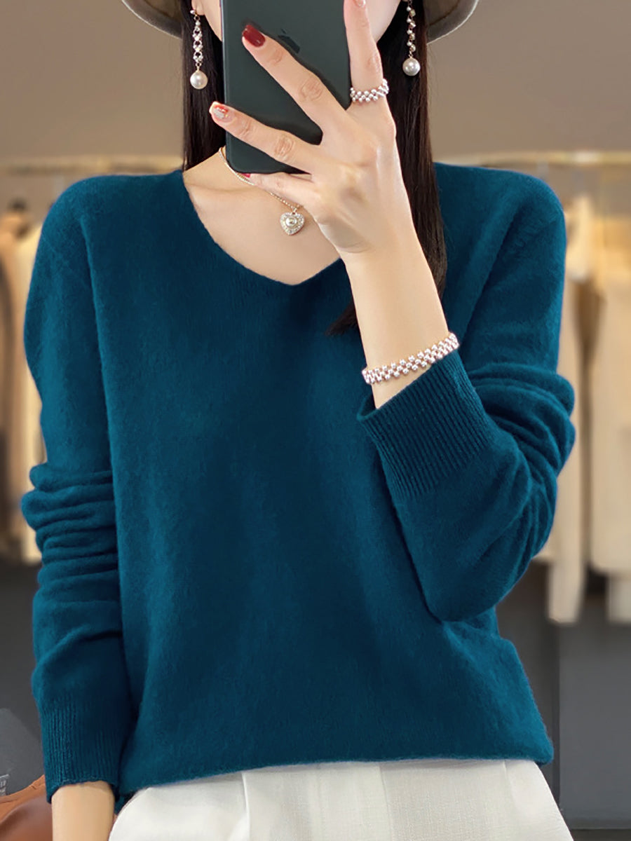 This V-Neck Knit Sweater for Women features a solid pattern, full-length sleeves, and a casual yet stylish design, making it perfect for the autumn and winter seasons.