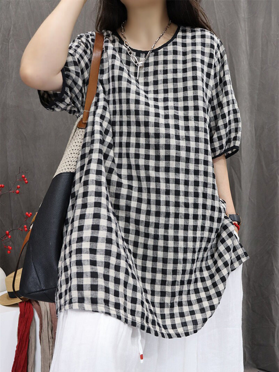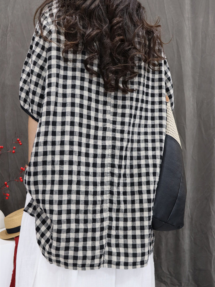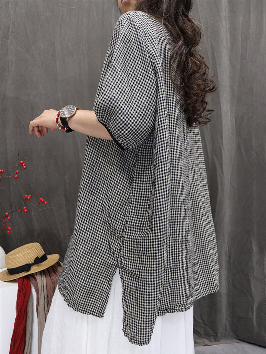 Women Summer Artsy Plaid 100%Linen Shirt