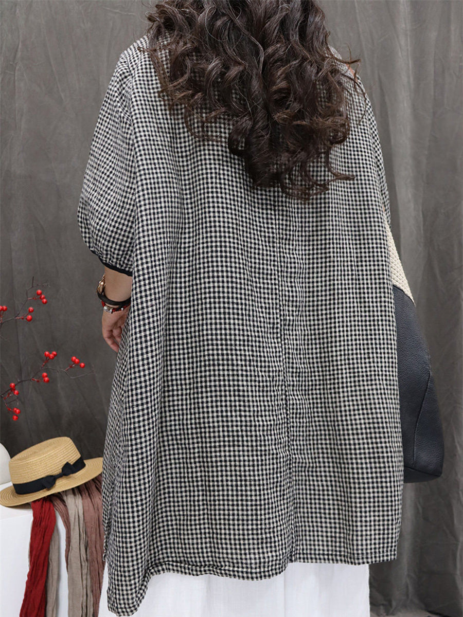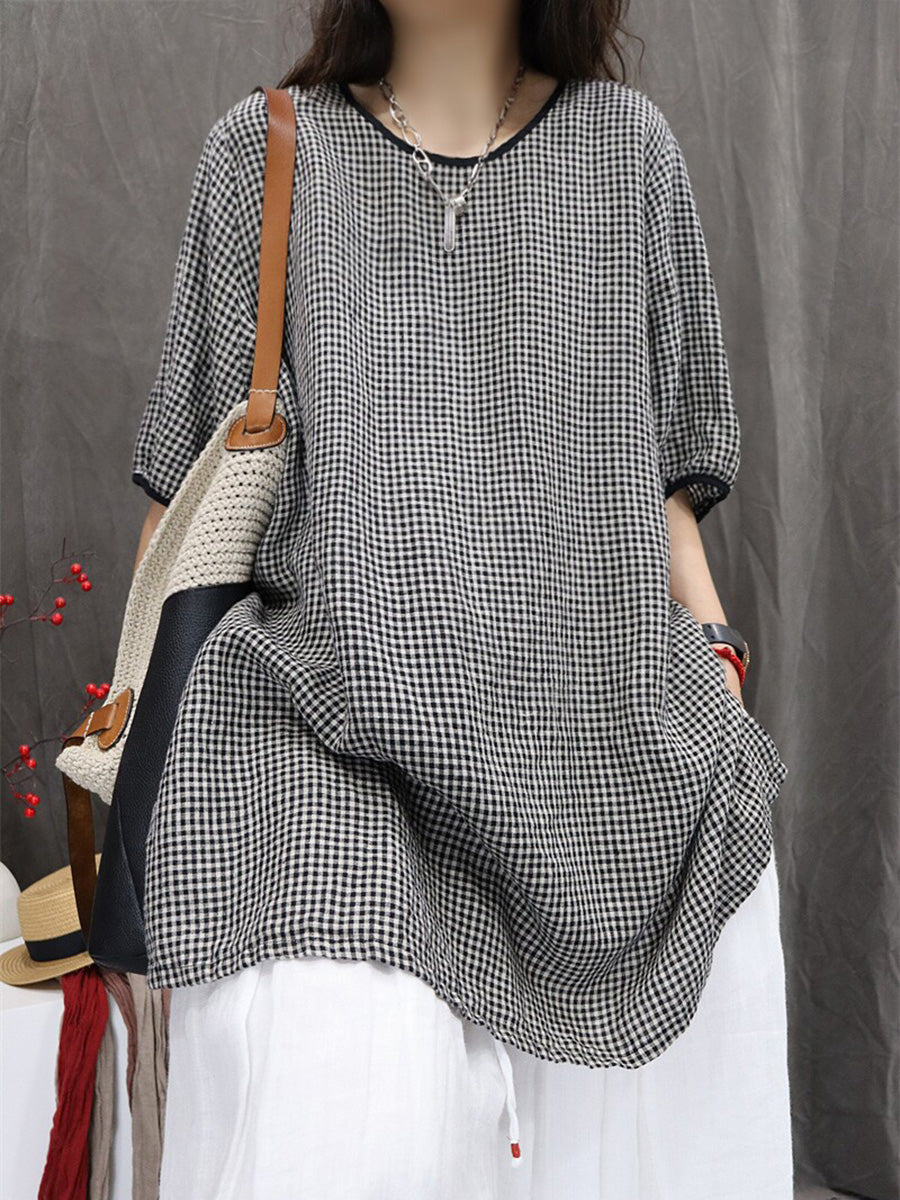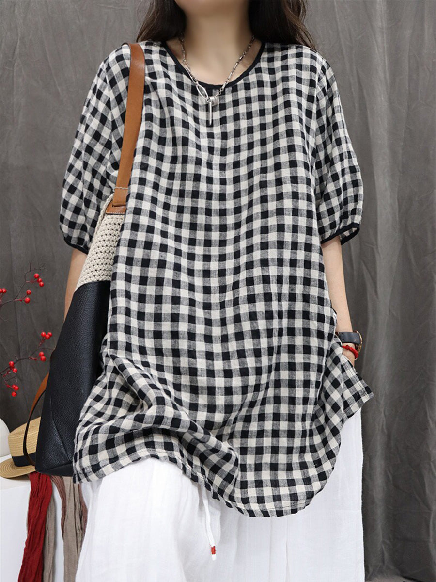 Women Summer Artsy Plaid 100%Linen Shirt
