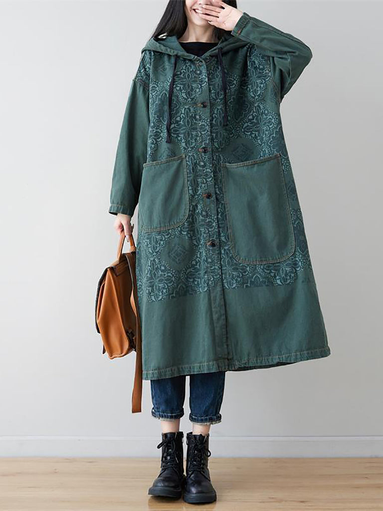 This long denim hooded coat for women features a spliced flower design with a cotton material and raglan sleeve style. The full sleeve length and vintage style make it perfect for the autumn and winter seasons.
