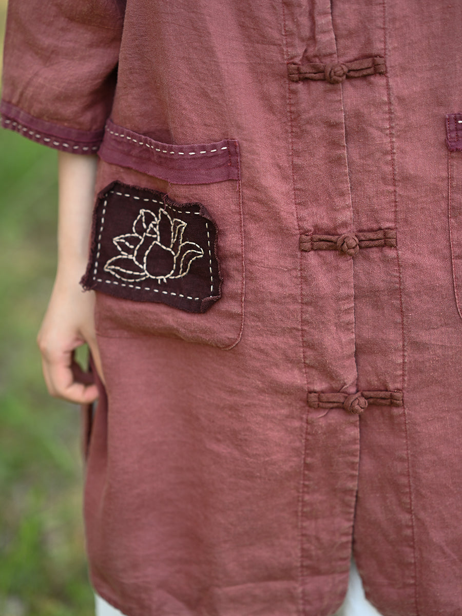 Women Summer Retro Lotus Patch Stand Collar 100%Linen Shirt