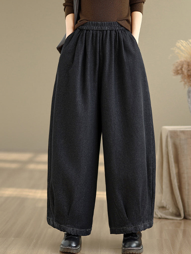 Women Winter Retro Denim Fleece-lined Wide-leg Pants