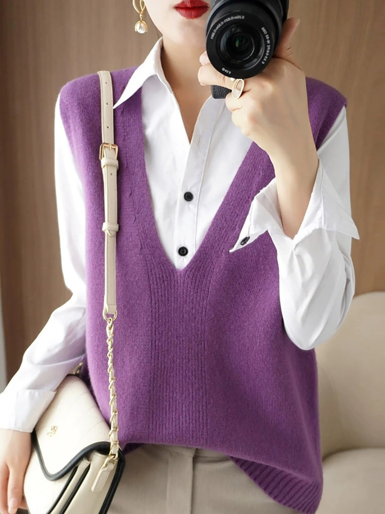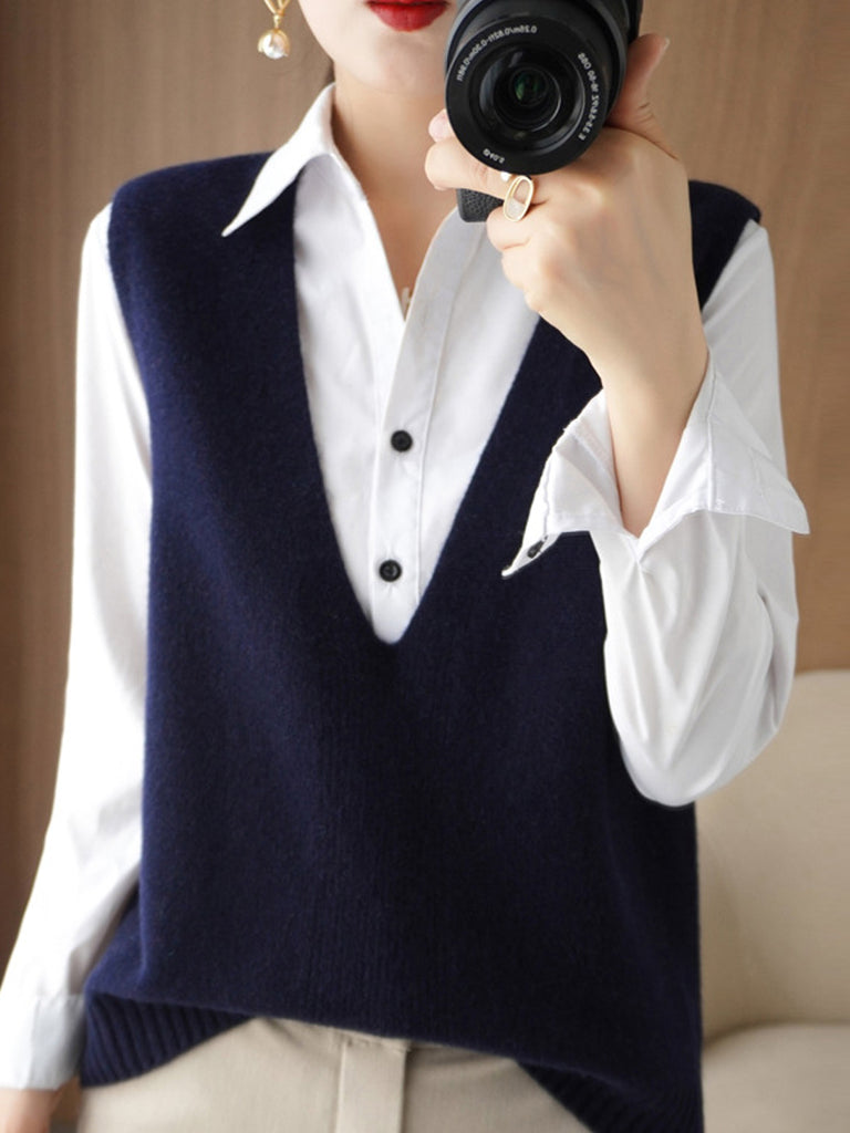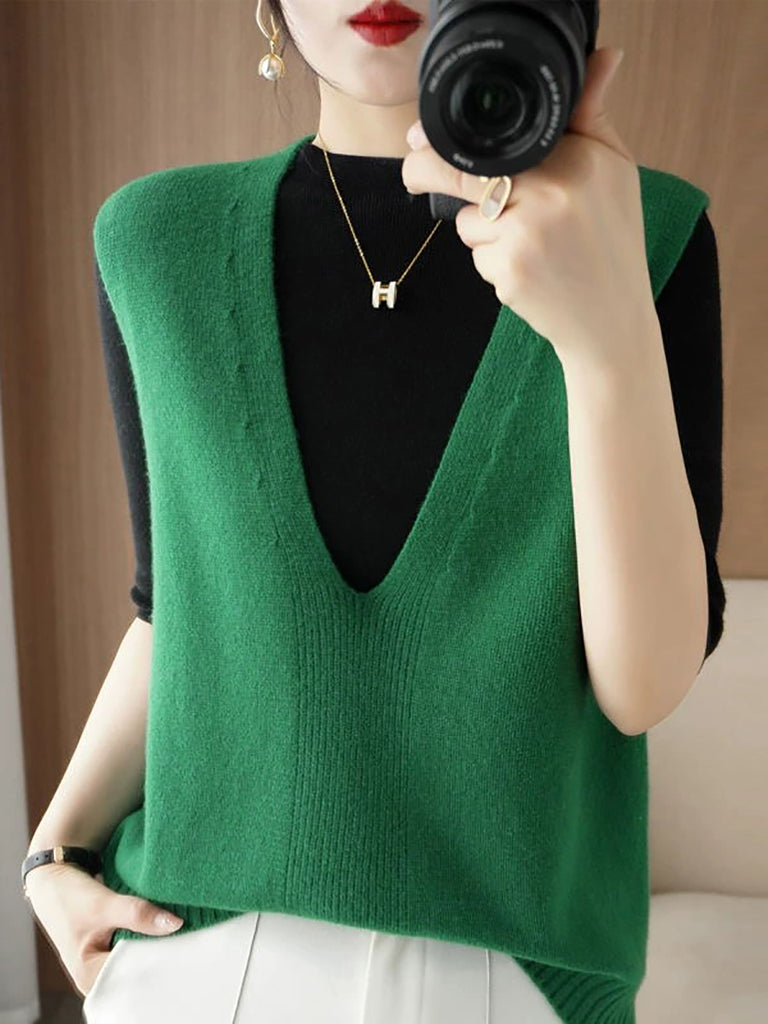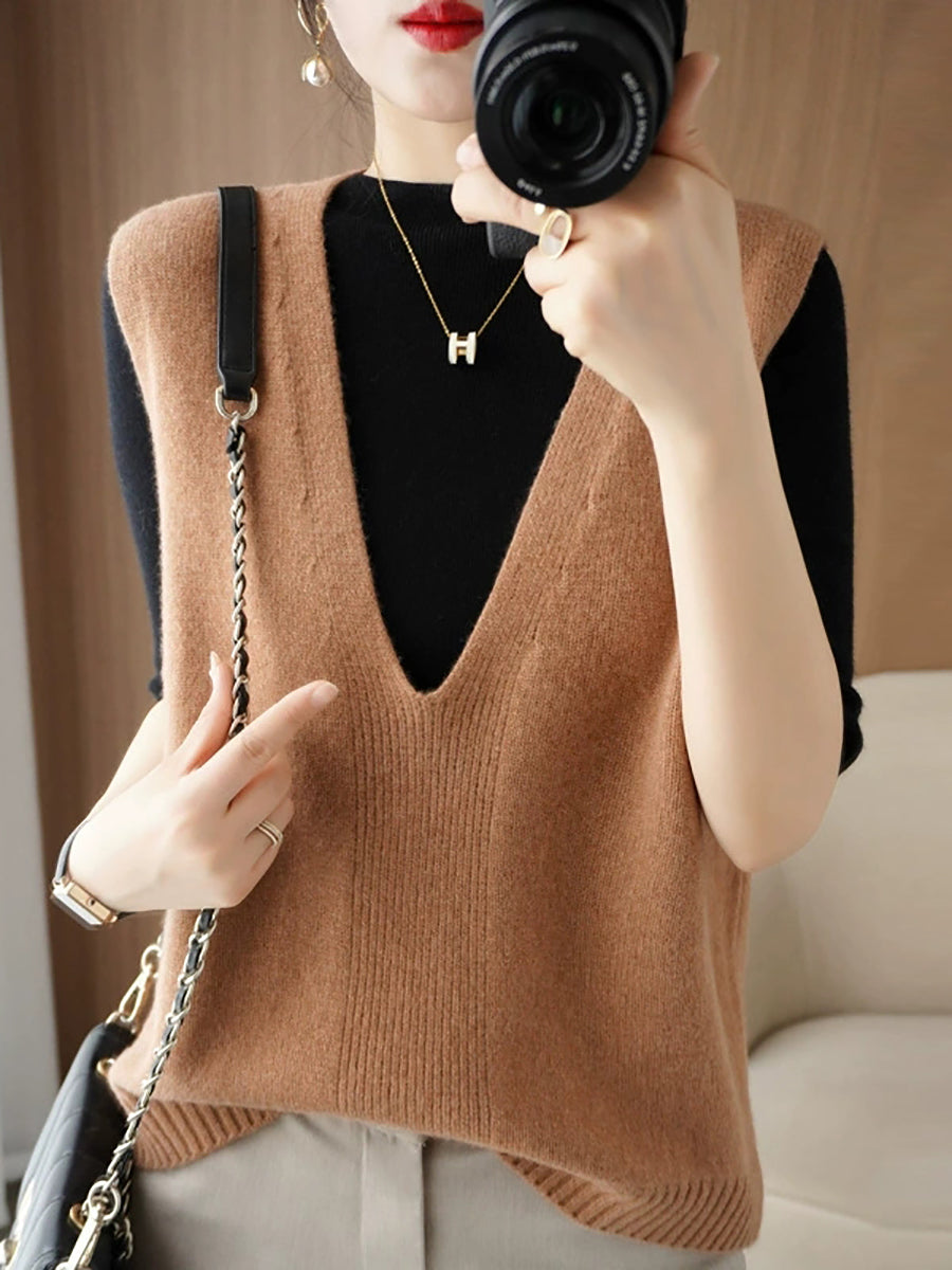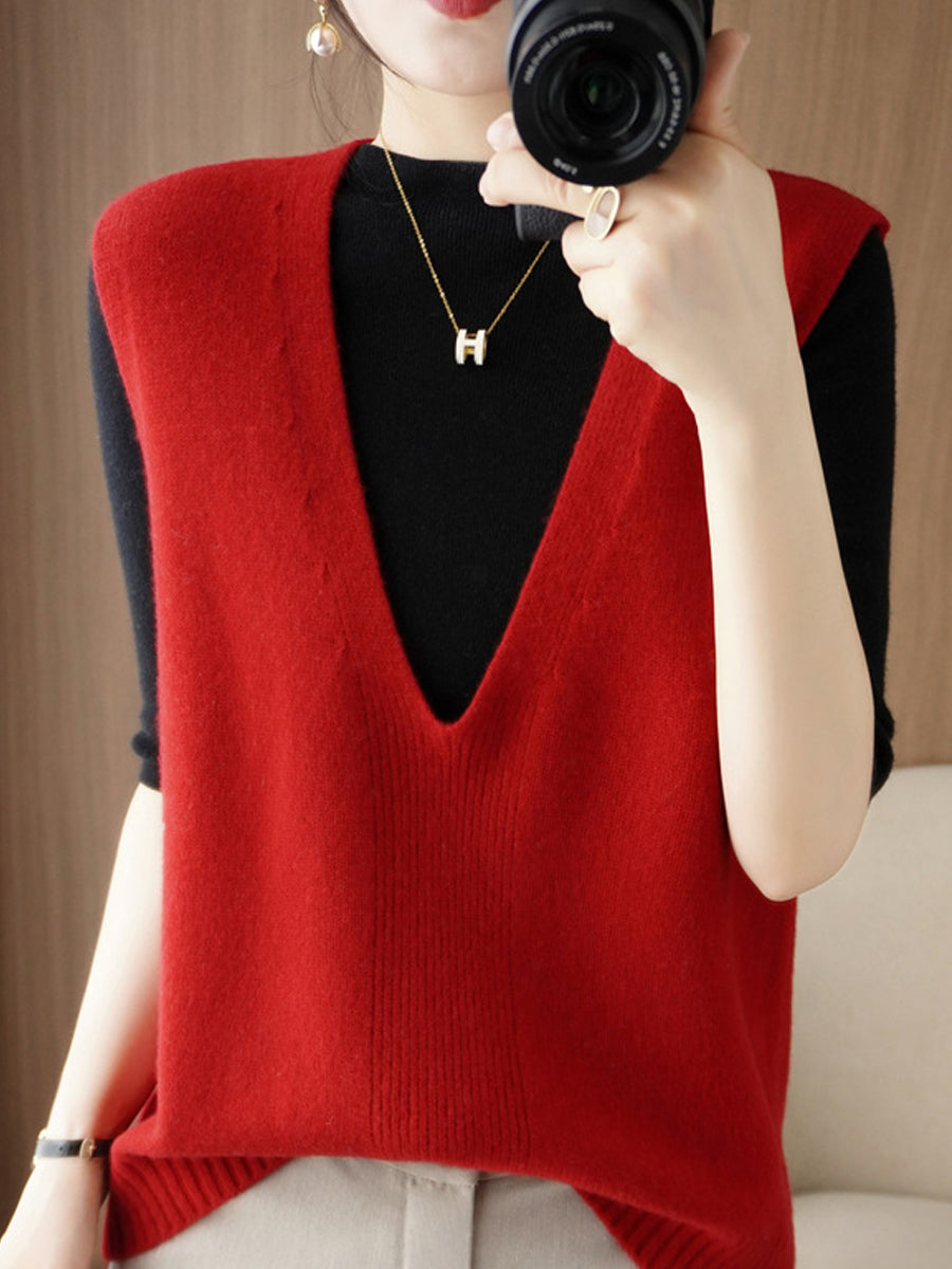 Women Autumn Casual Pure Color V-Neck Knitted Vest