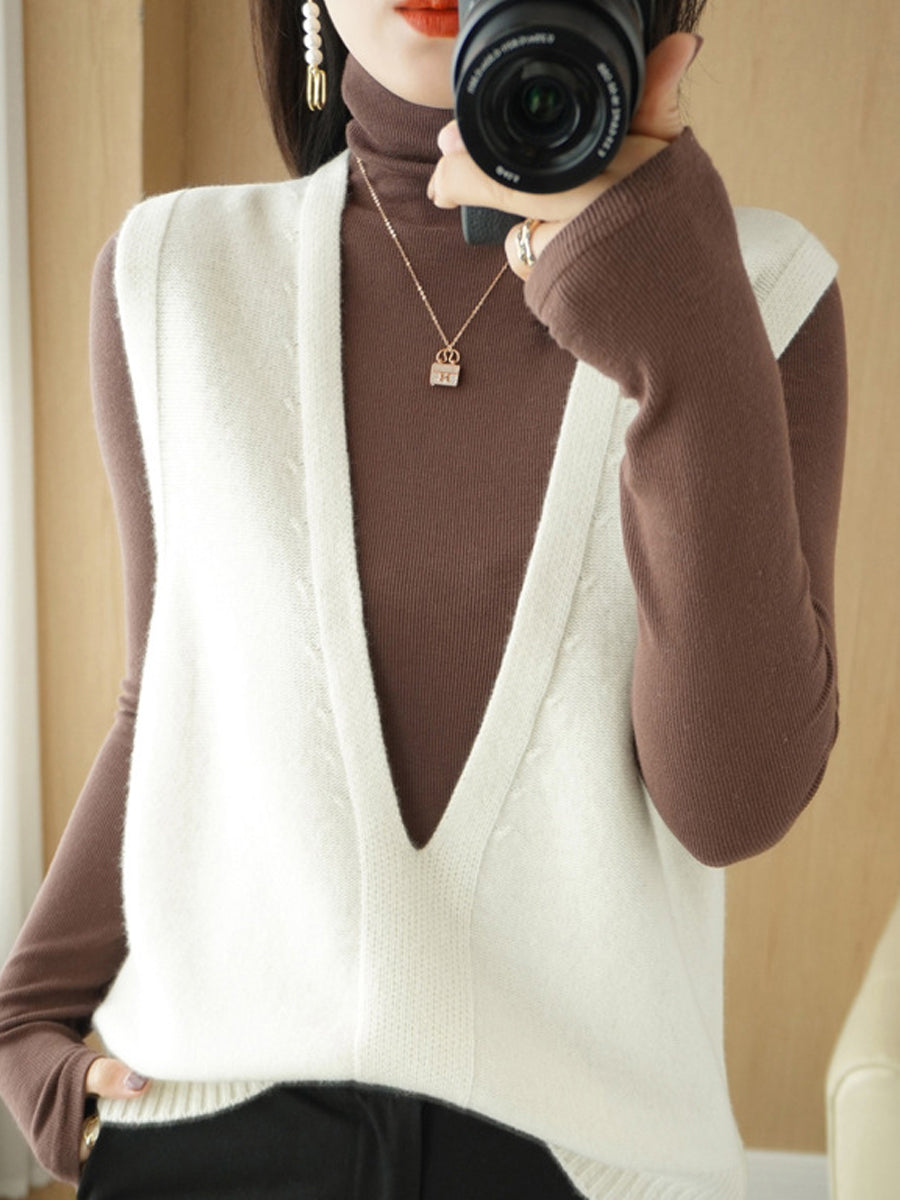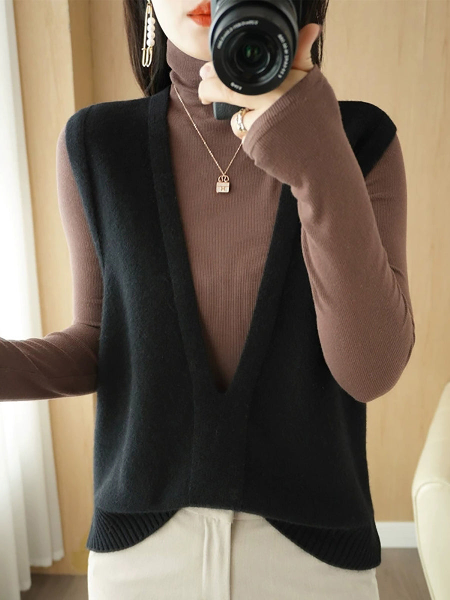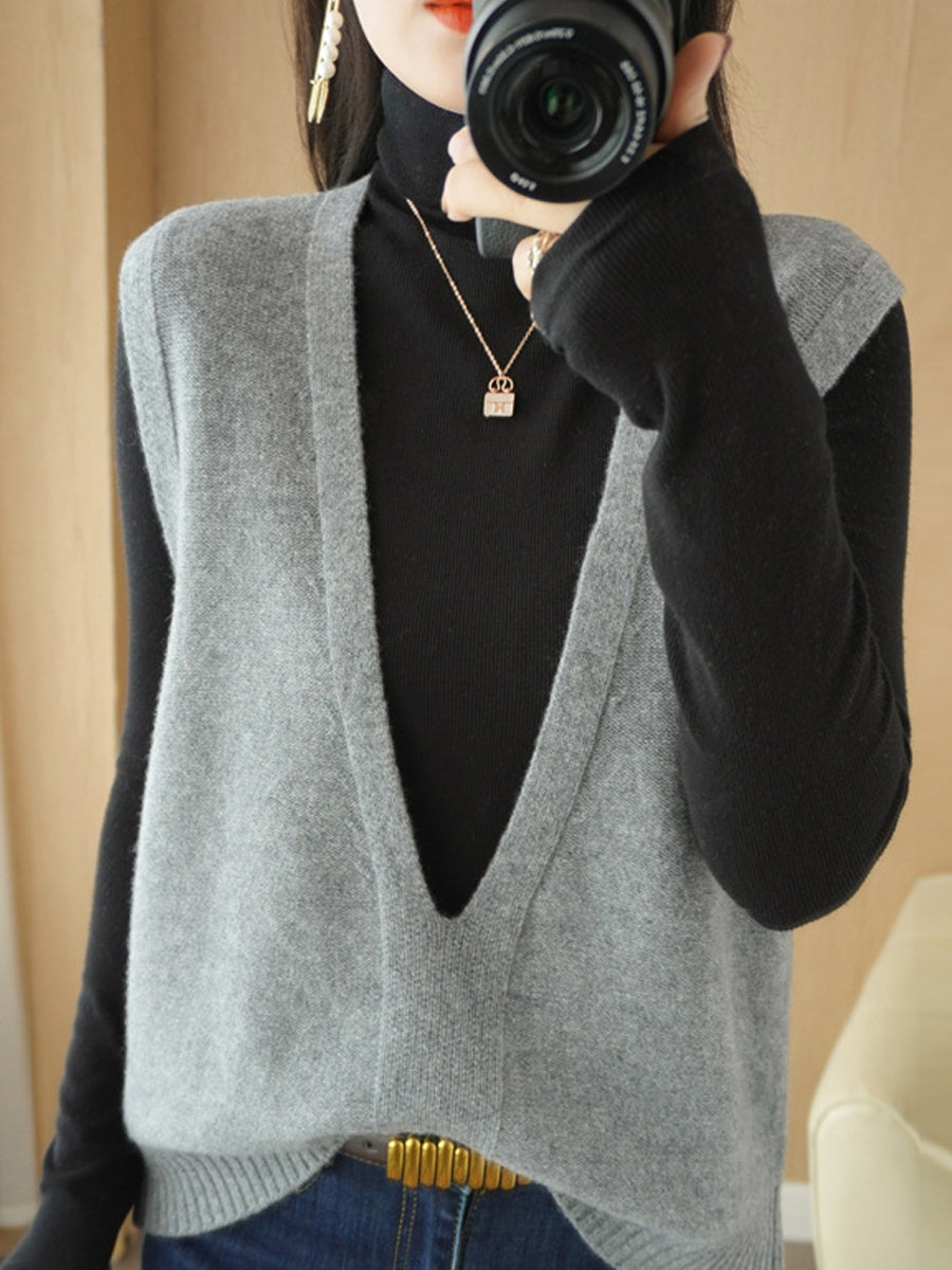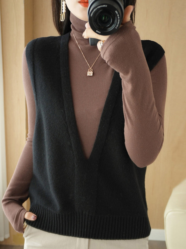 Women Autumn Casual Pure Color V-Neck Knitted Vest