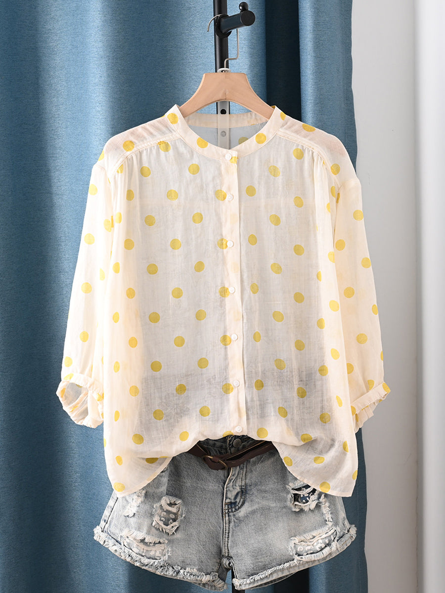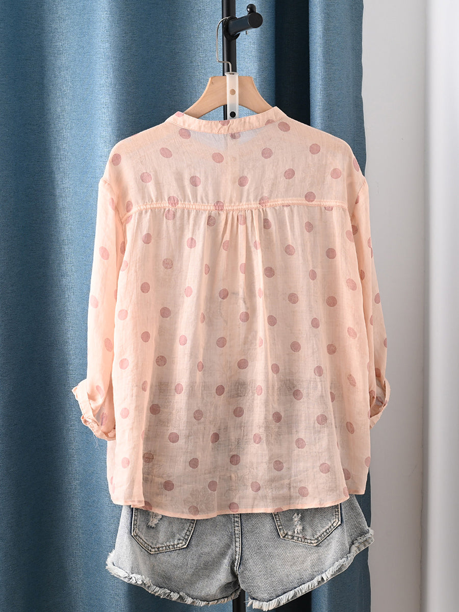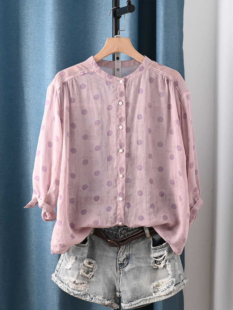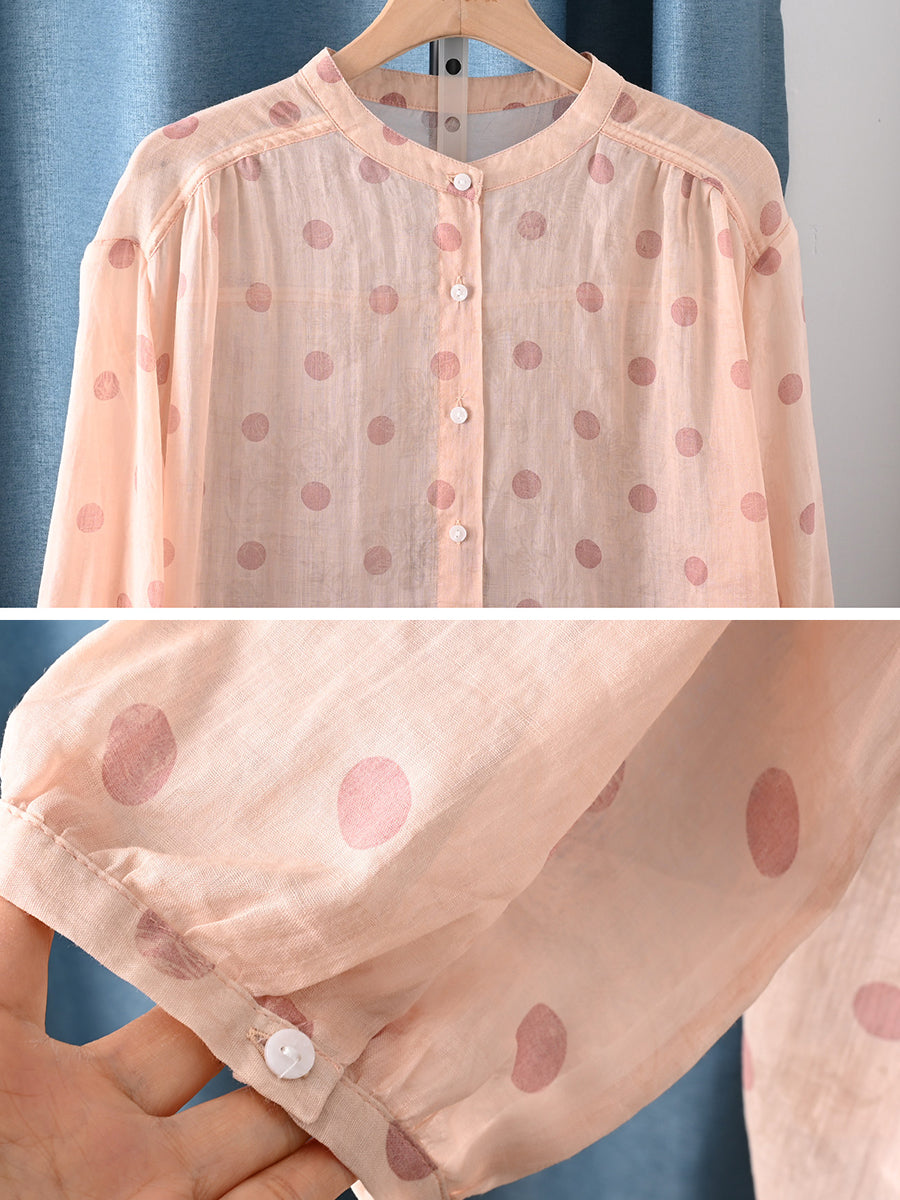 Women Summer Artsy Dot 100%Ramie O-Neck Blouse