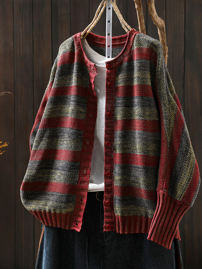 Crafted from a blend of 45% cotton and 55% acrylic, this sweater coat features a stylish stripe pattern. It includes an O-neck collar and vintage-inspired raglan full sleeves, designed for comfort and elegance during spring and autumn seasons.