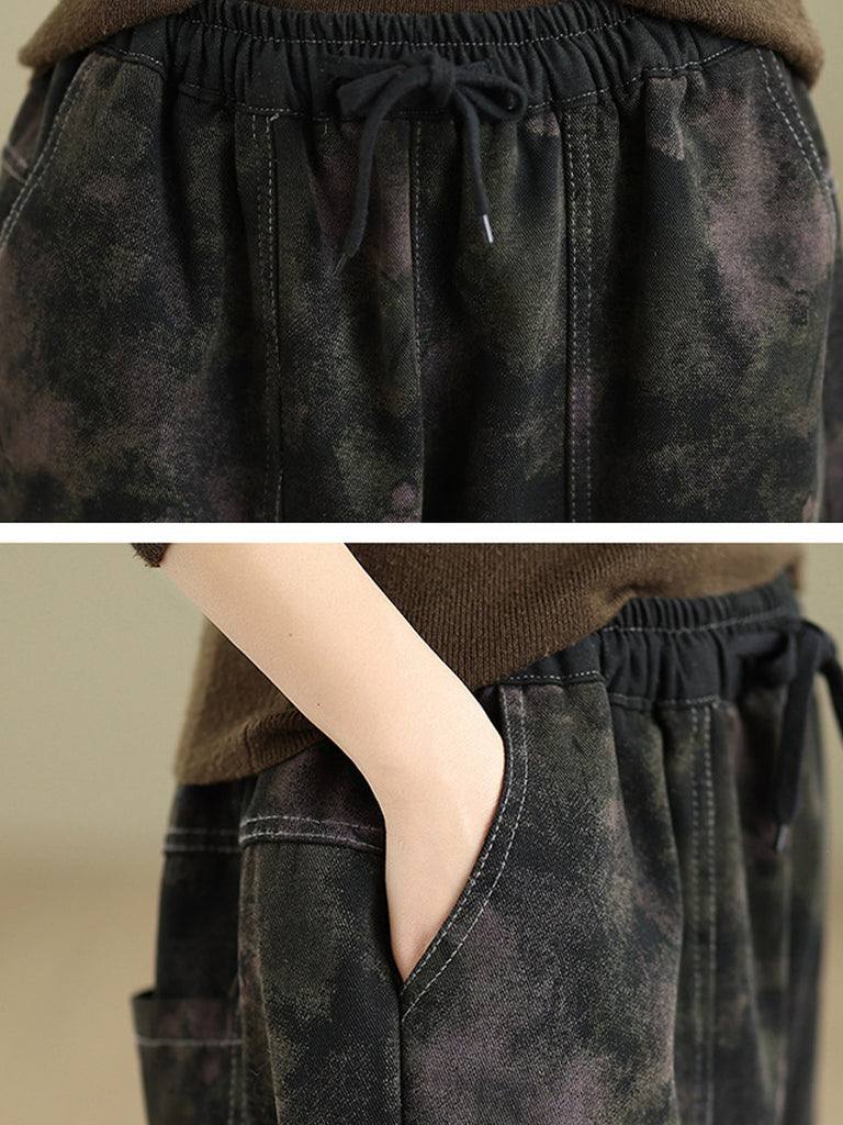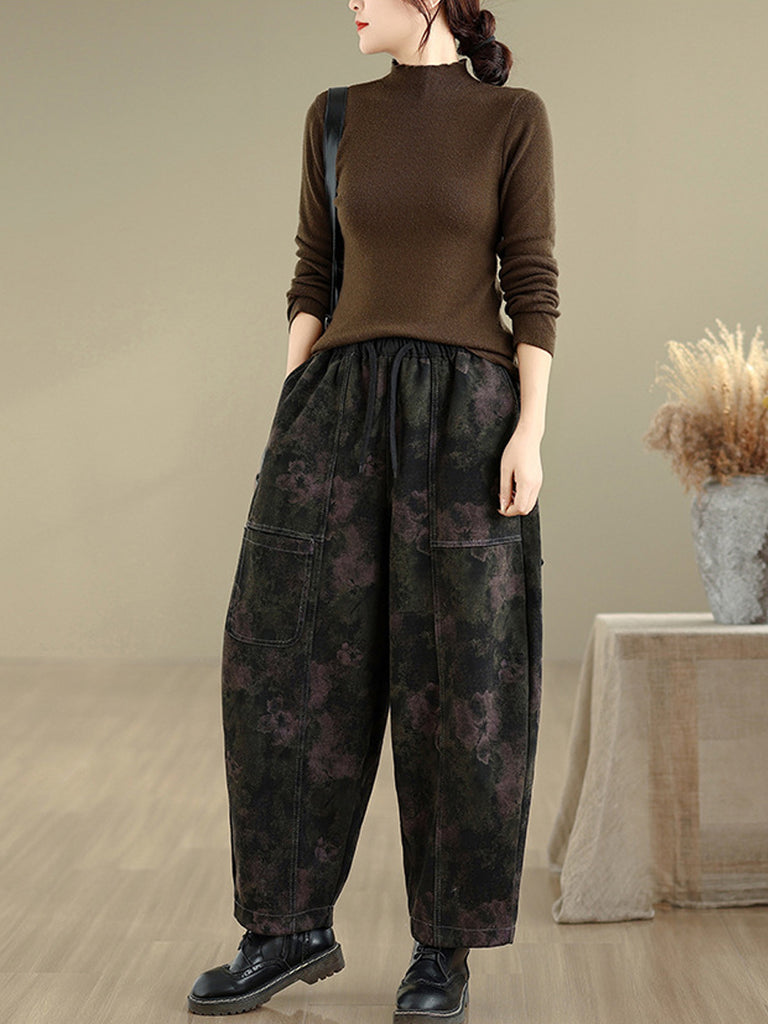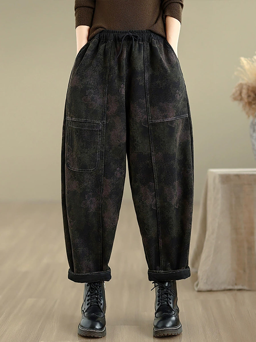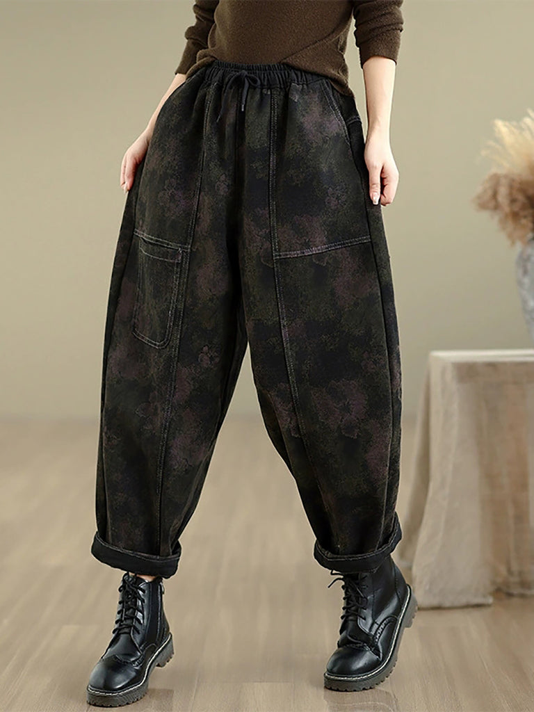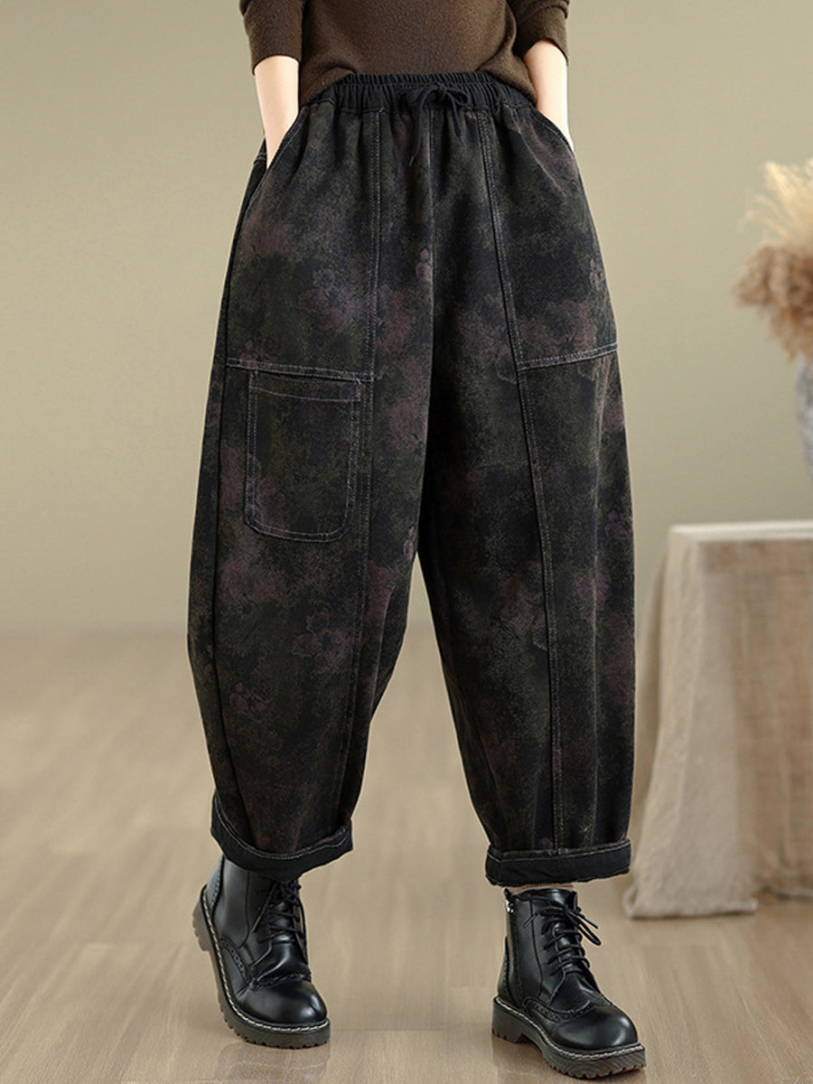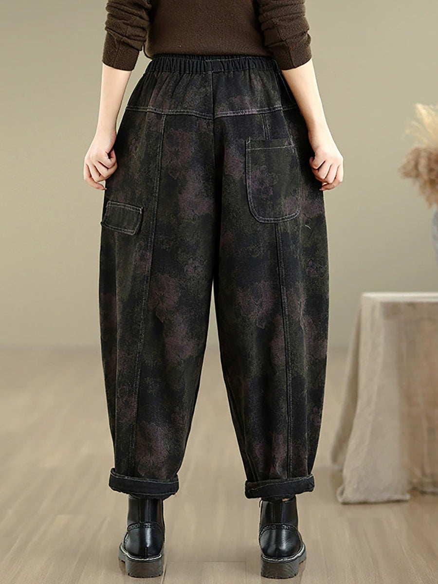 Women Autumn Retro Denim Fleece-lined Harem Pants