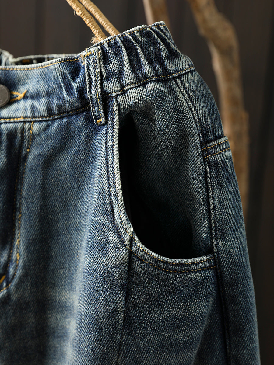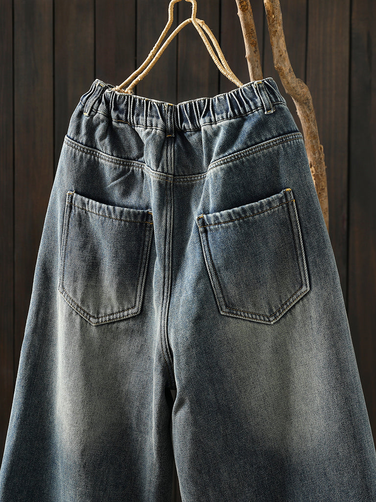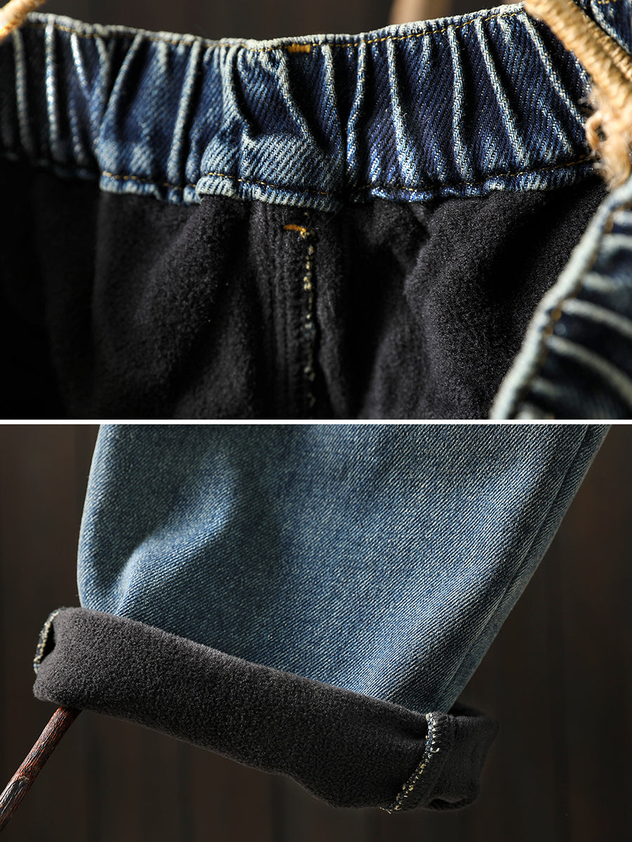 Women Winter Pure Color Fleece-lined Wide-leg Denim Pants