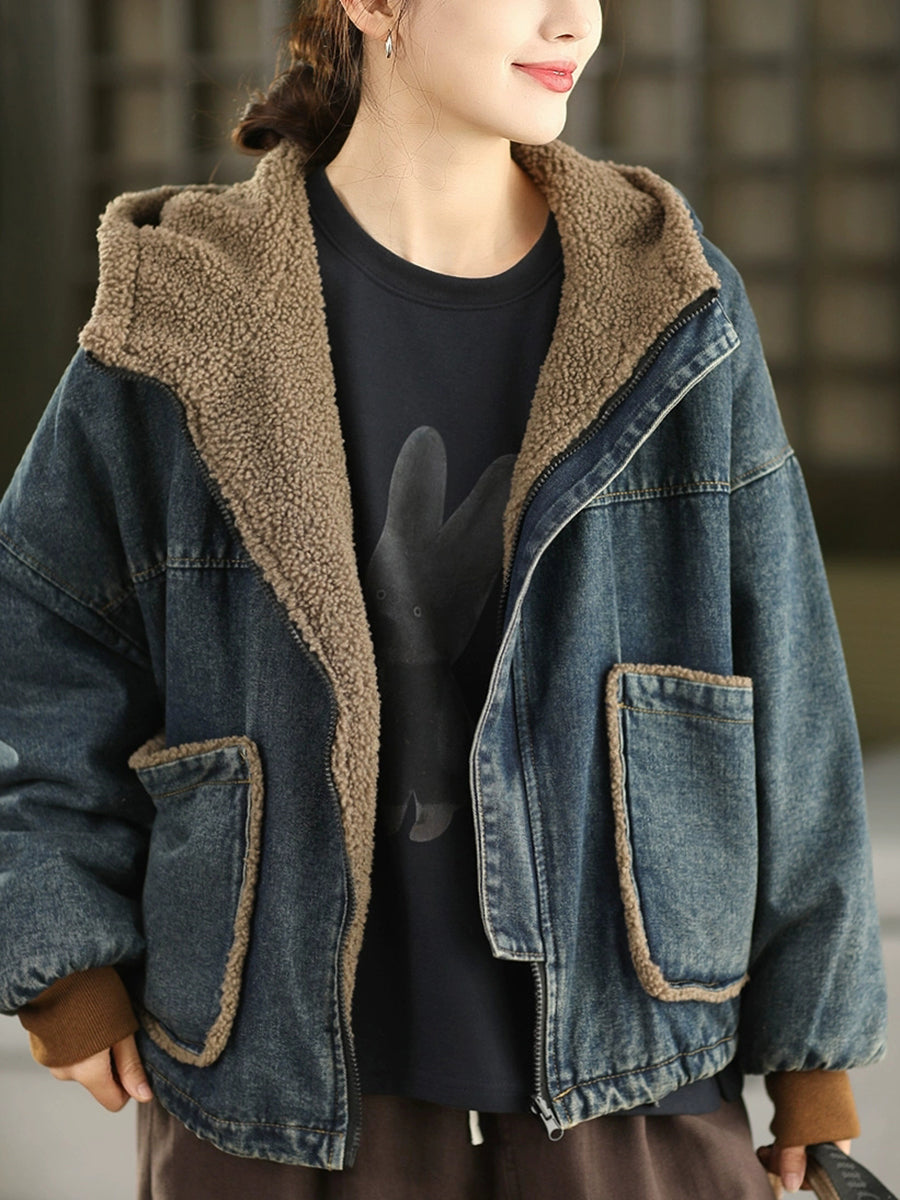 Women Winter Dual-side Wearing Fleece Denim Hooded Coat