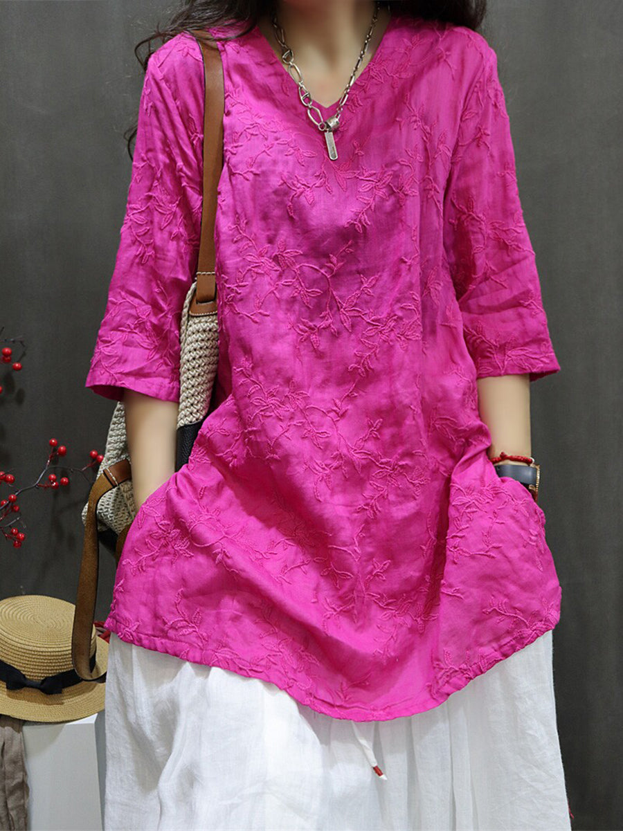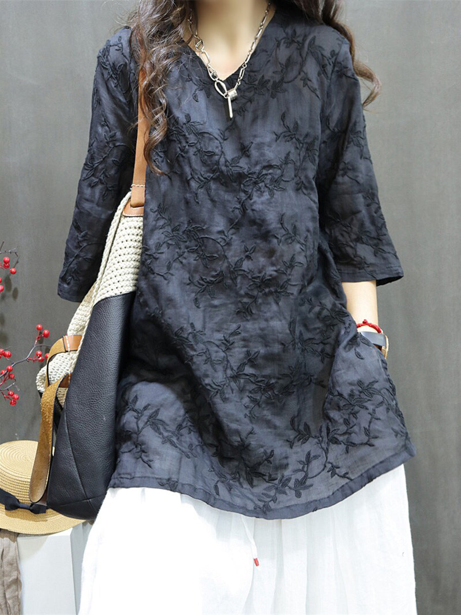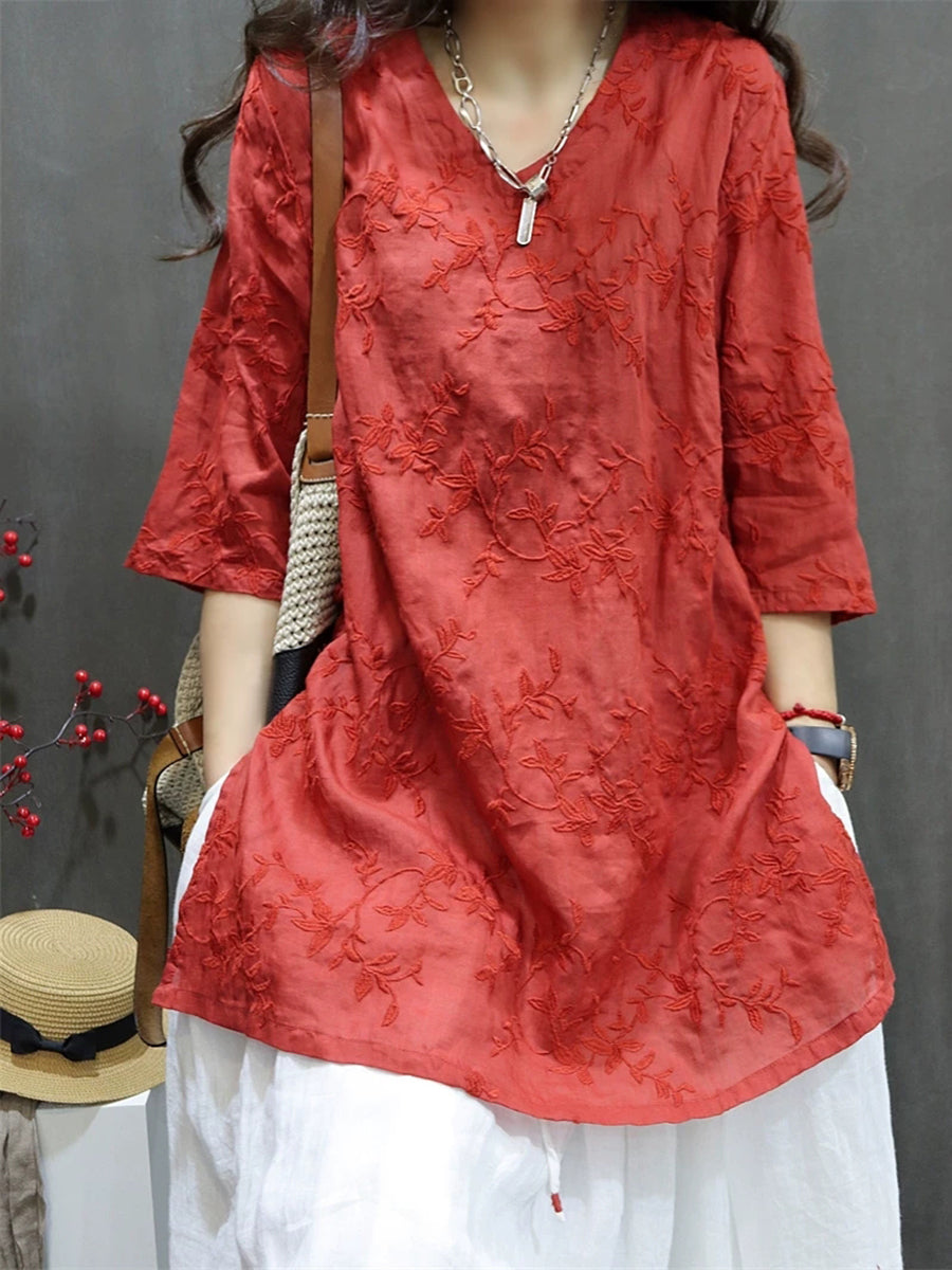 Women Summer Artsy Embroidery 100%Ramie V-Neck Blouse