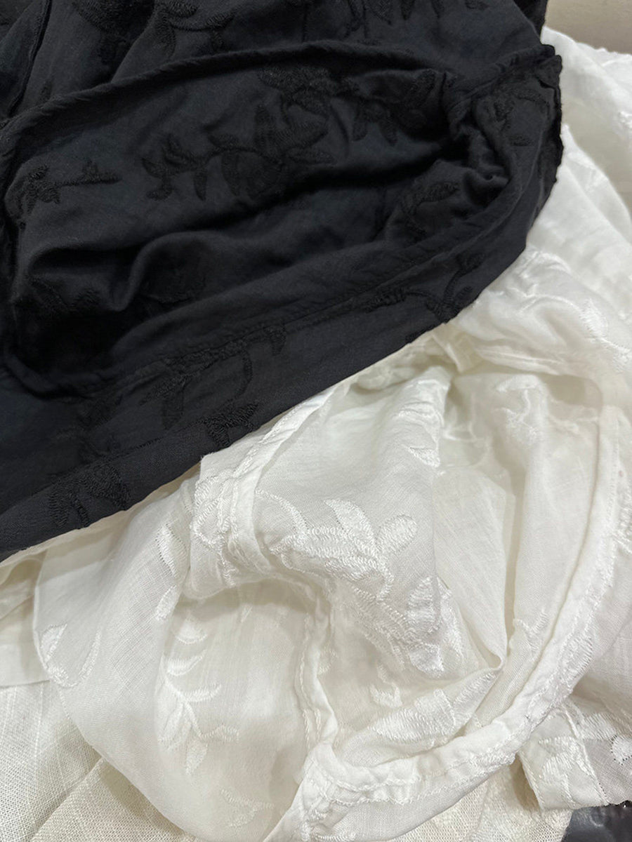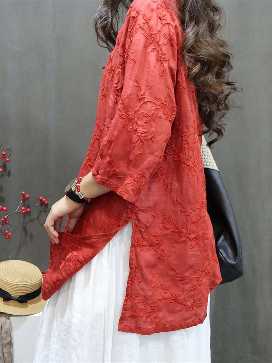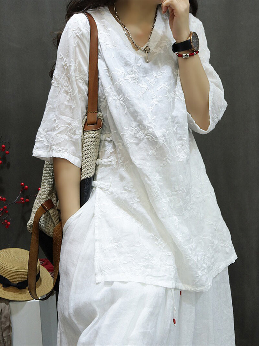 Women Summer Artsy Embroidery 100%Ramie V-Neck Blouse