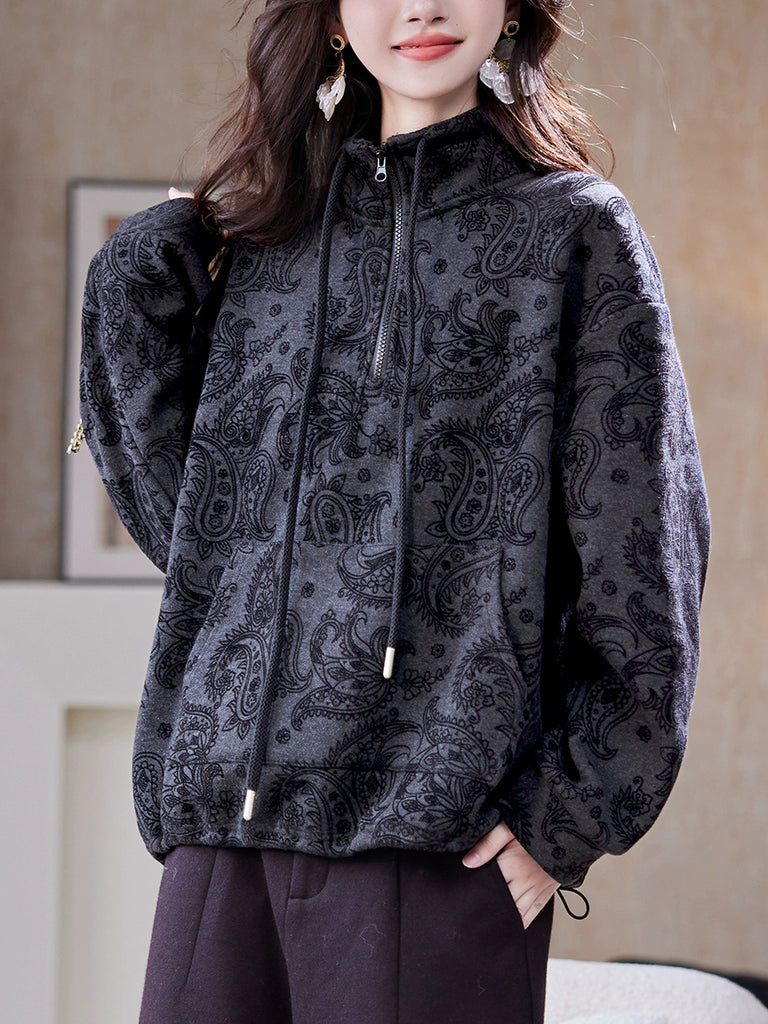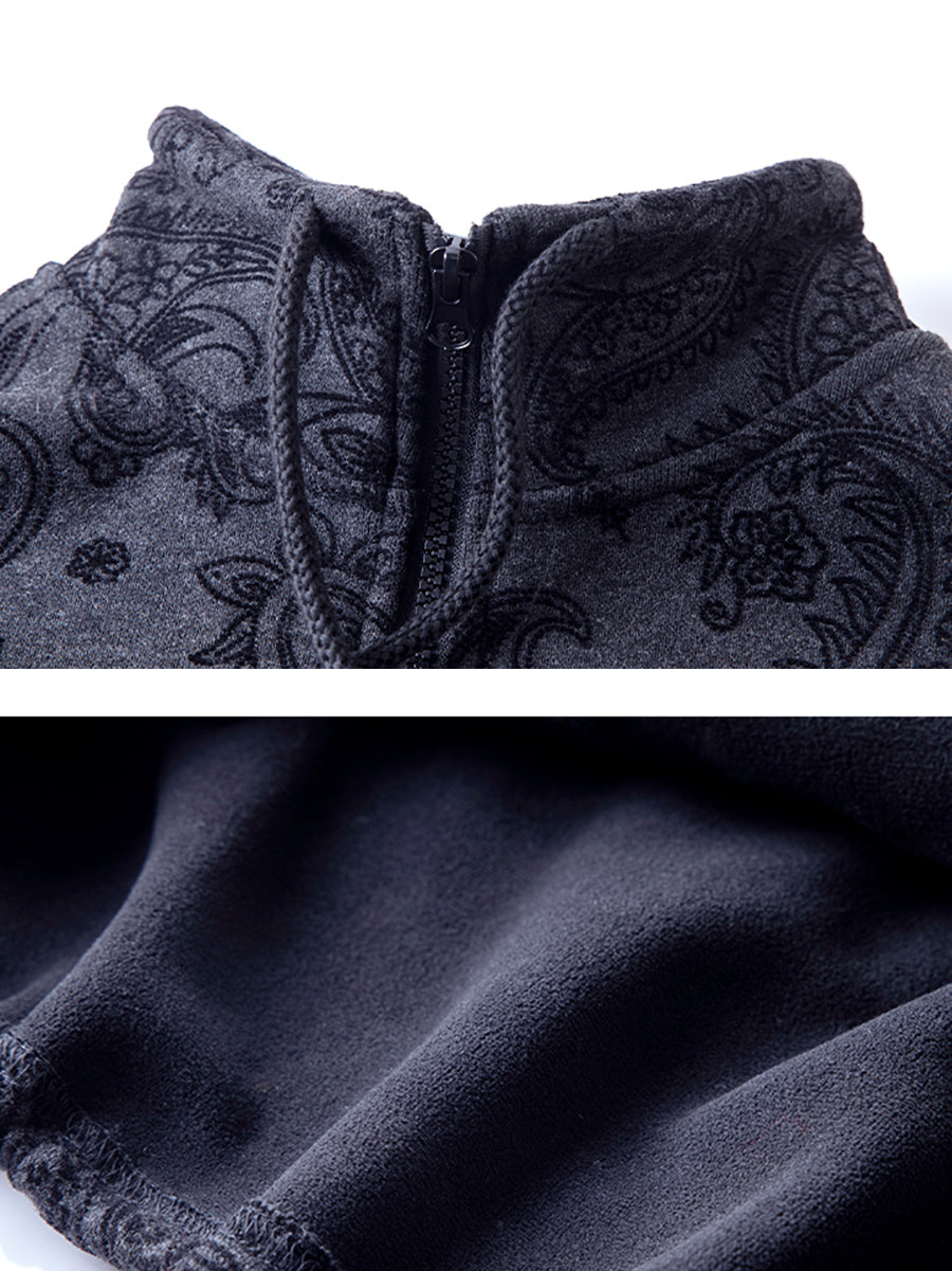Women Winter Retro Flower Fleece-lined Stand Collar Blouse