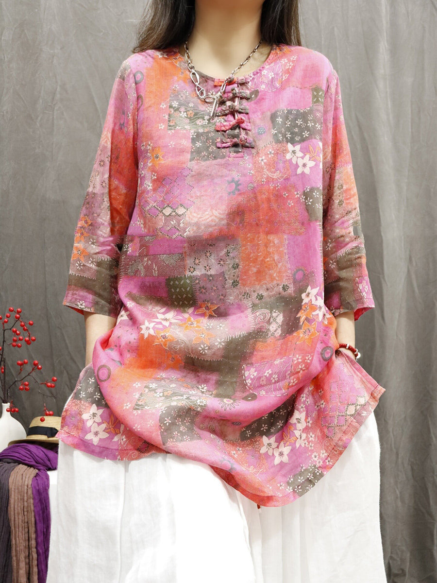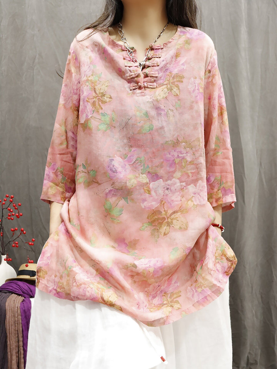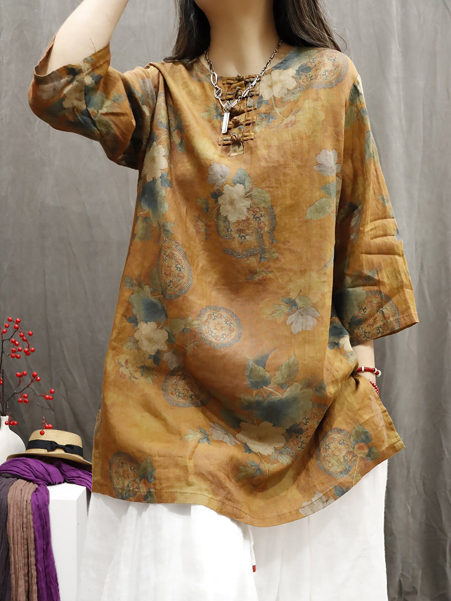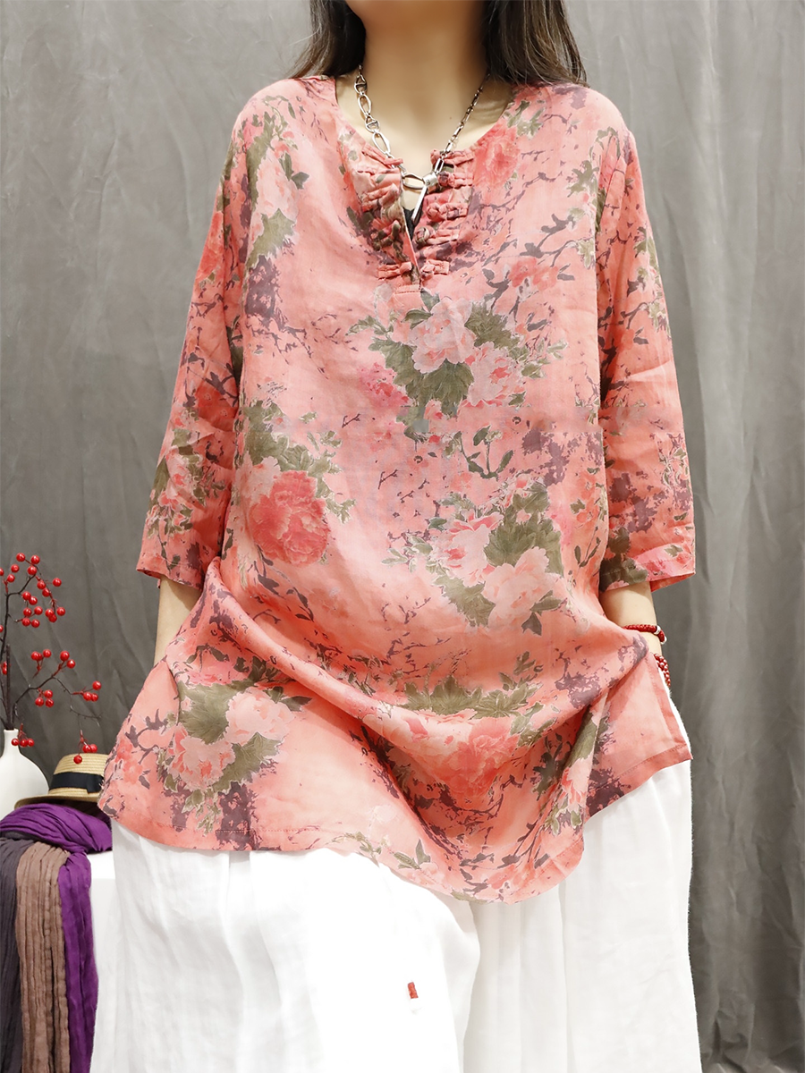 Women Summer Ethnic Flower O-Neck 100%Ramie Shirt