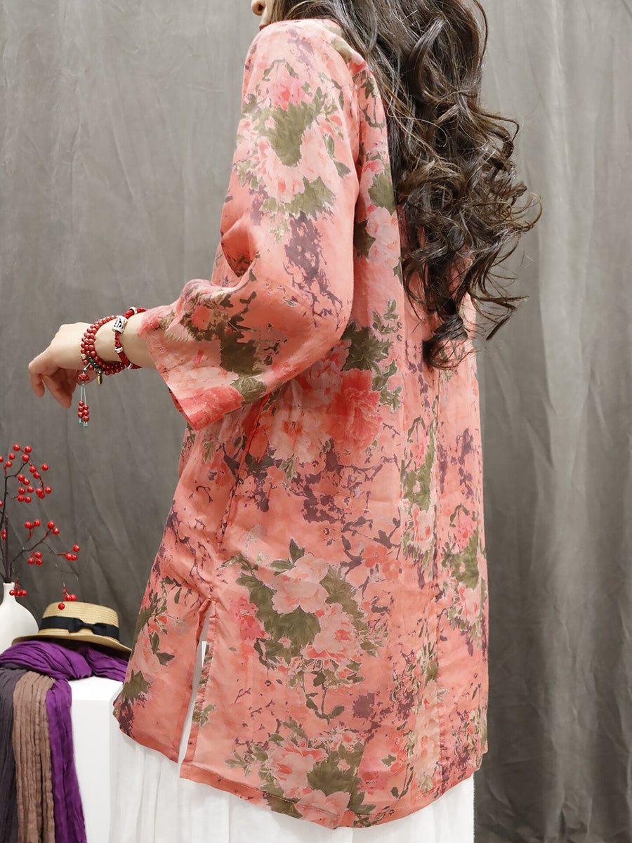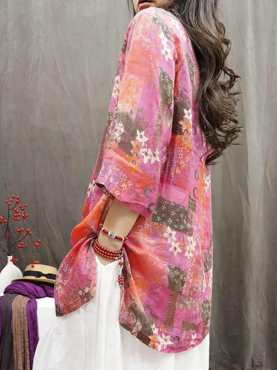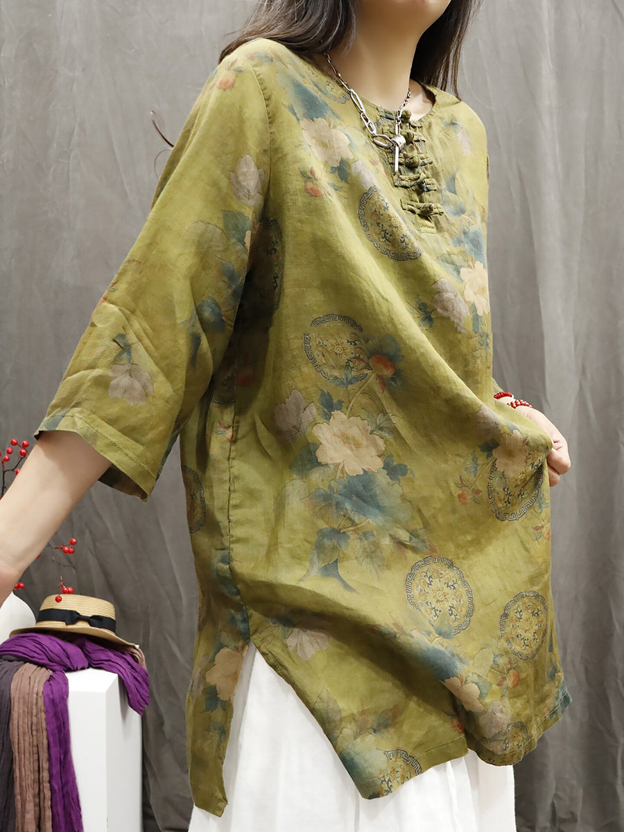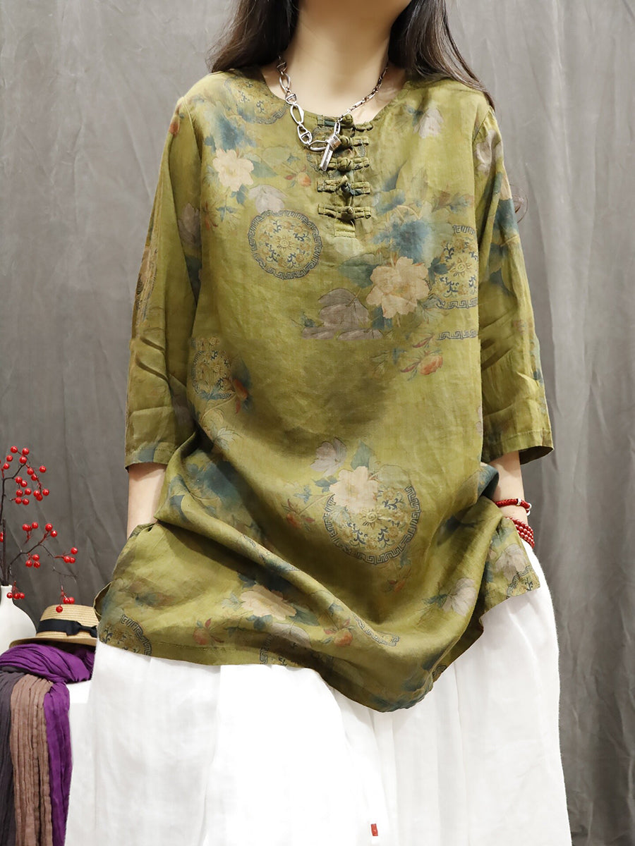 Women Summer Ethnic Flower O-Neck 100%Ramie Shirt