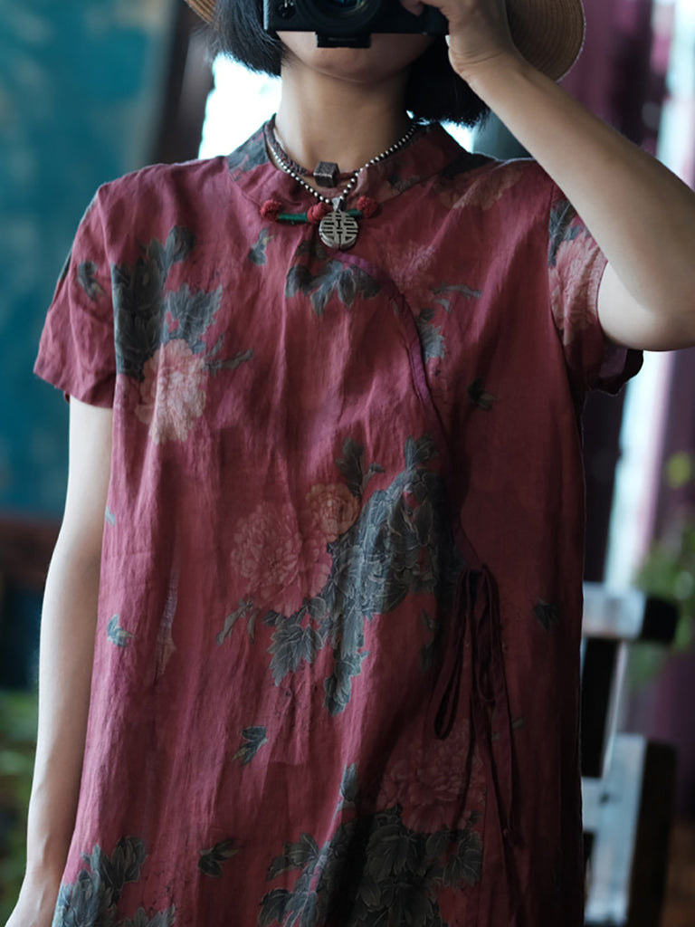 Women Summer Artsy Flower Stand Collar Linen Dress