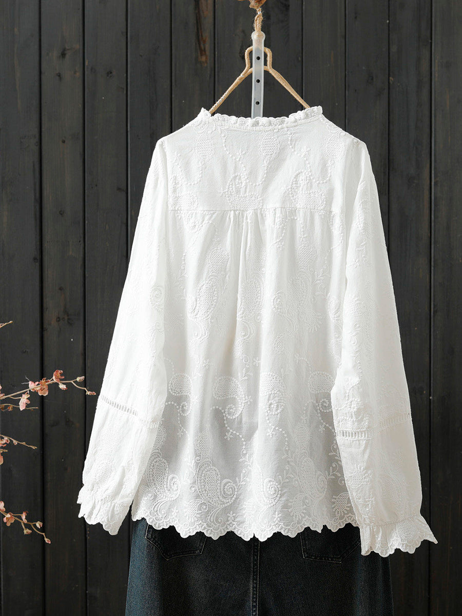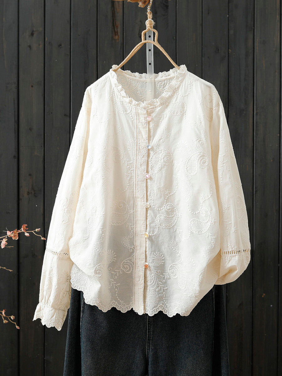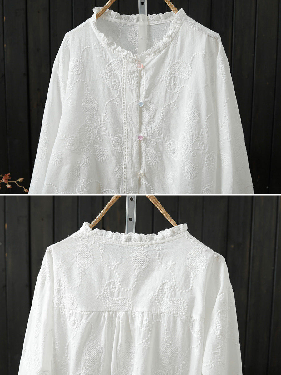 Women Spring Artsy Embroidery 100%Cotton Stand Collar Shirt